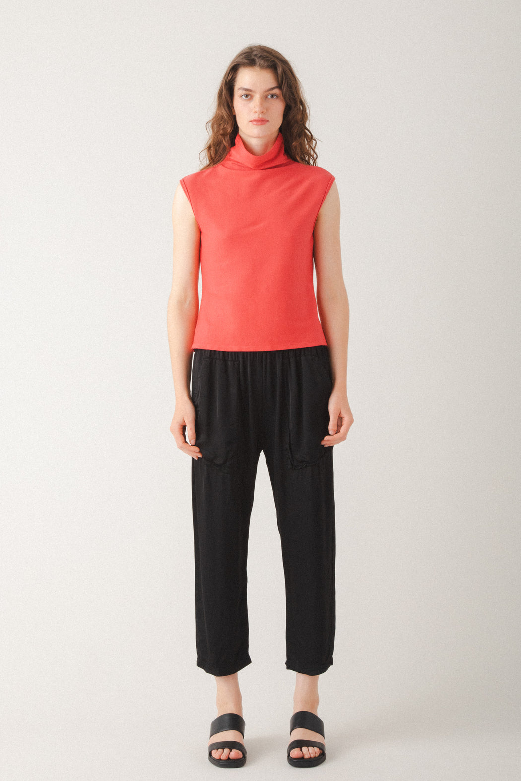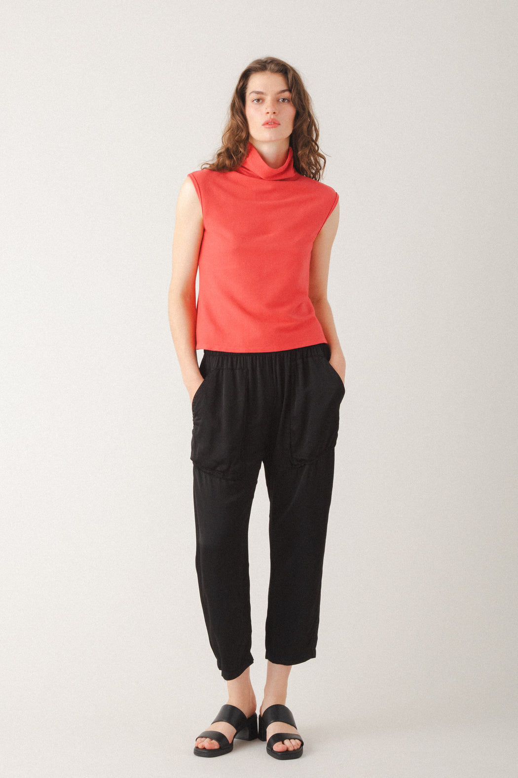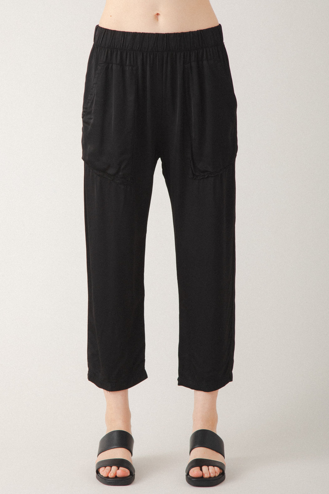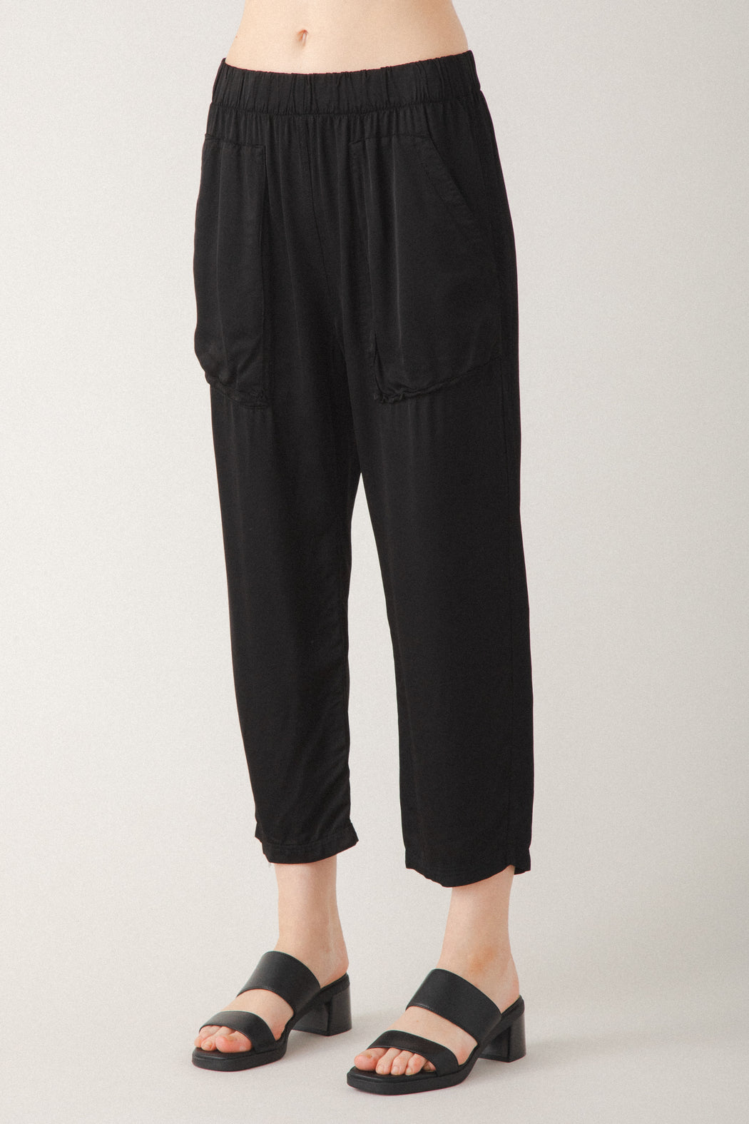 A relaxed elastic waist pant that’s anything but ordinary. The Easy Does It features dimensional patch pockets with a nod to cargo styling, double-needle topstitching, and a slightly cropped leg—all crafted in silky rayon viscose for an elevated look with everyday comfort. This pull-on style is lightweight, fluid, and designed to move with you—perfect for lounging at home or dressing up with ease. Versatile, effortless, and ready for anything. Pair it with the Mid Habitual in Satin for a refined take on pajama dressing.