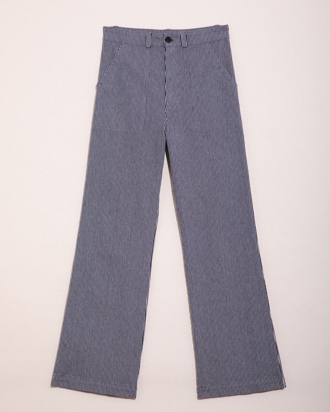 Our high-rise utility favorite has been interpreted as a full-length pant. This heavyweight stretch textile retains its shape while conforming to your body. Incredibly comfortable and industrious. This mostly fitted leg straightens below the knee. These pants are pre-shrunk and will retain their shape.