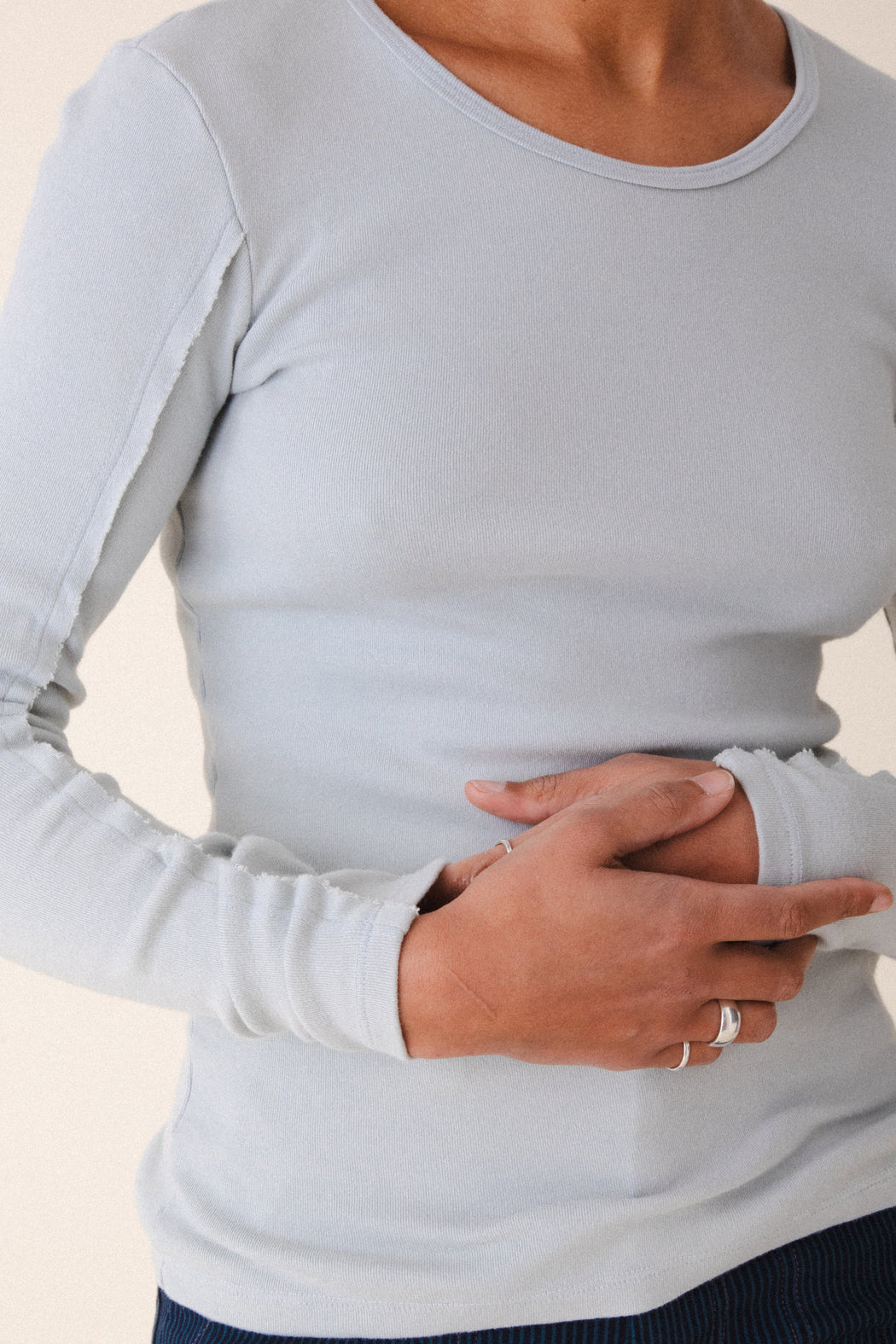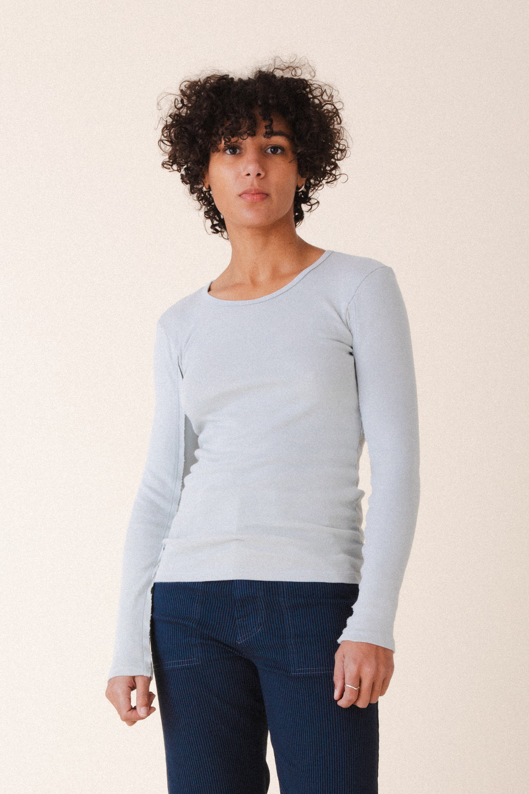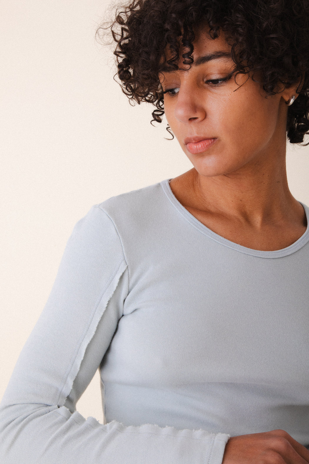 A classic crew constructed in our soft, thick, interlock knit (think baby clothes). This tailored tee was designed with a nod to y2k fashion with an exposed seaming on the sleeve. The elegant neckline and body-skimming shape allow it to be worn in different ways and different circumstances.
