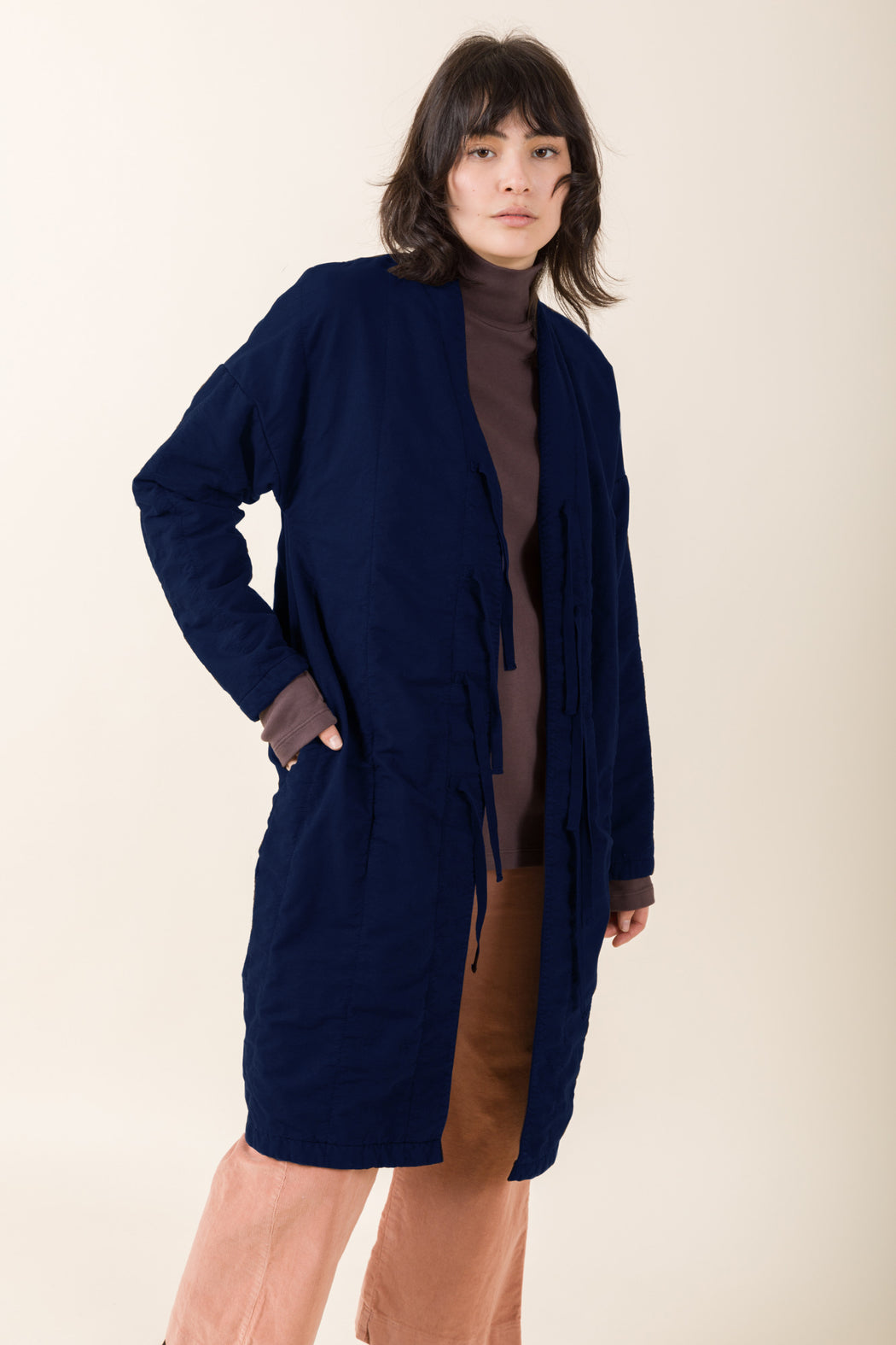 A boxy fleece trench with an organic muslin overlay, stitched down to create a textured woven shell. Evocative of vintage sleeping bags, this fleece-lined cocoon is an extra warm cardigan and boxy coat liner.