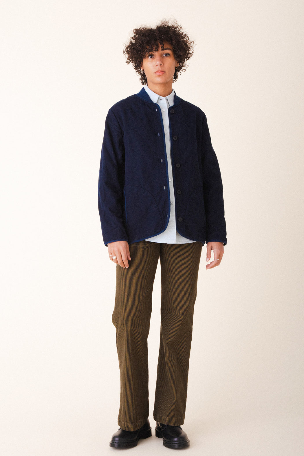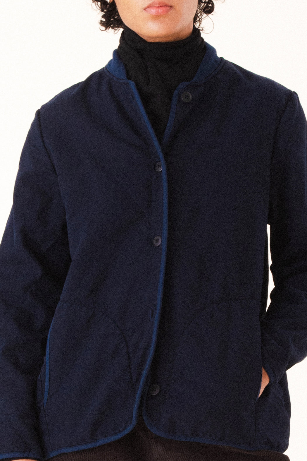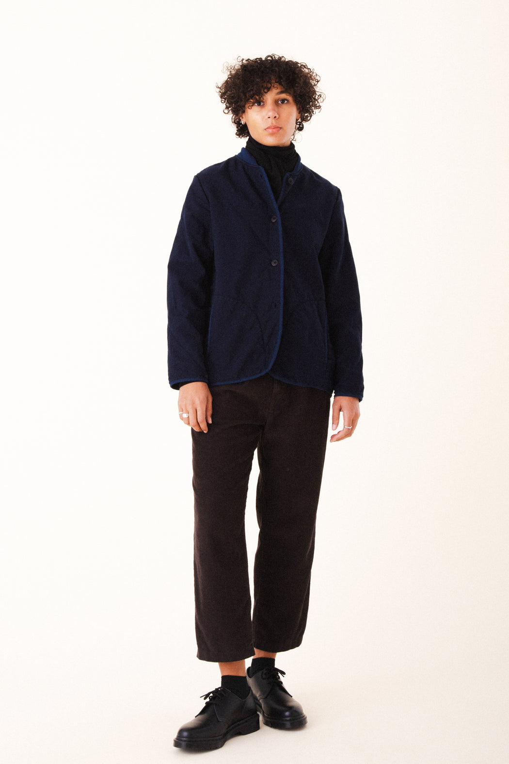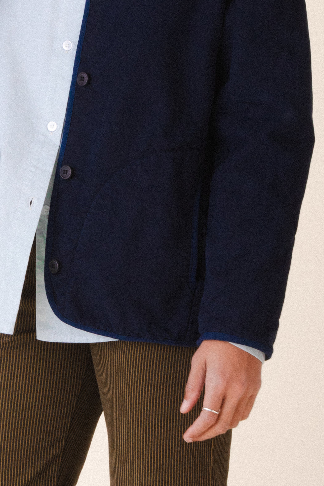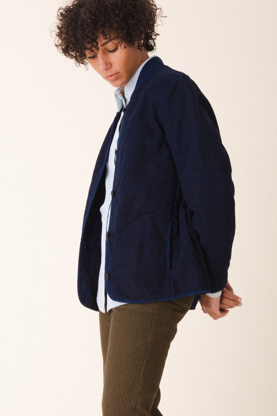 An organic fleecy interior is overlayed with organic canvas and quilted in a diamond pattern to create a windbreaker that is reminiscent of vintage military thermals. The shawl collar and secured side pockets render a tailored look that will sharpen any ensemble.