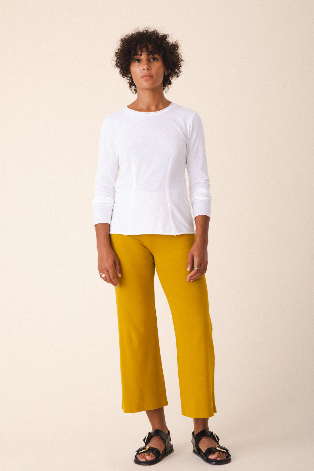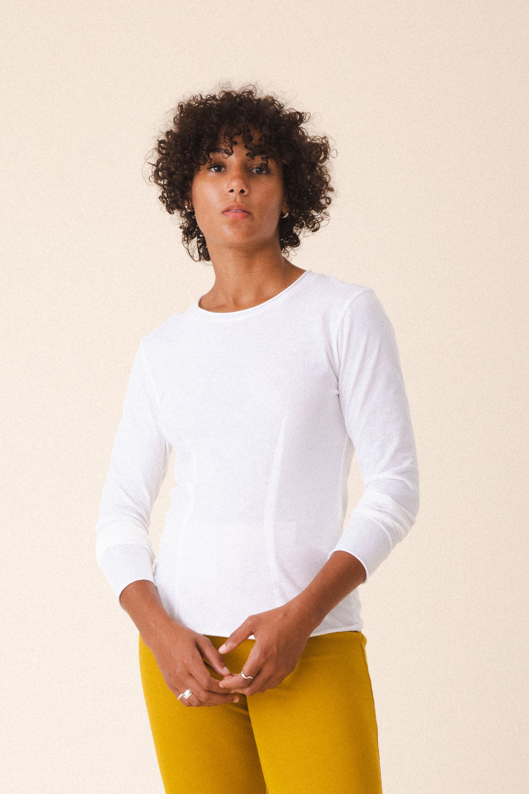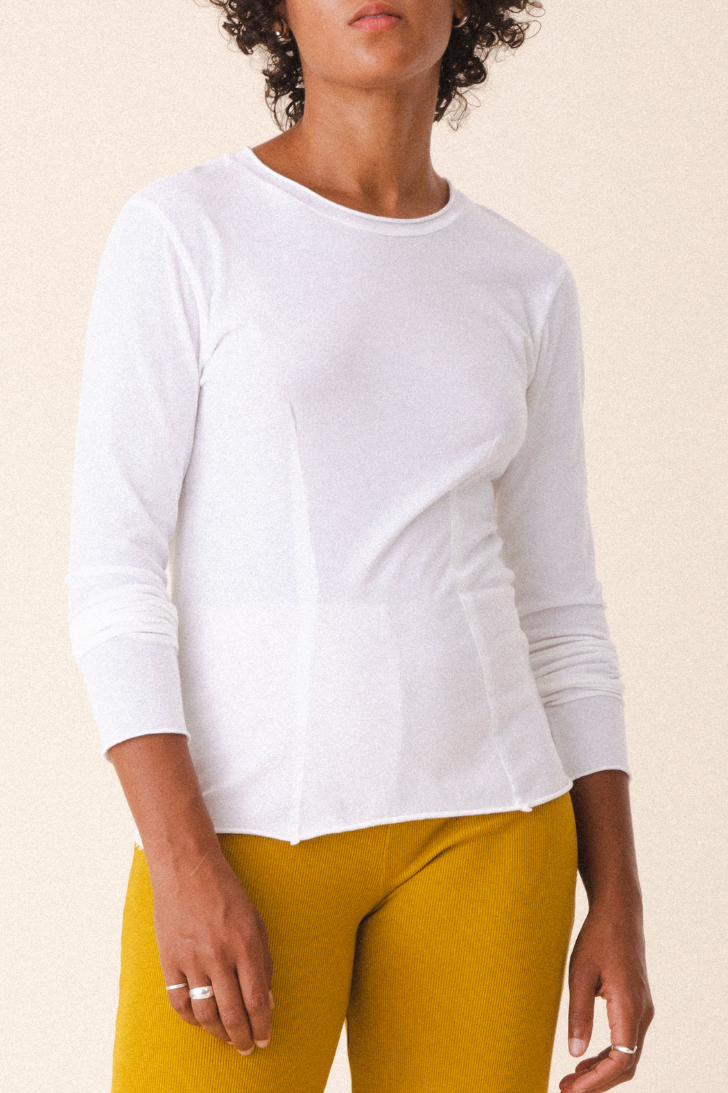 The most feminine t-shirt with full darting accentuates your figure. A new take on our wildly successful Falconet neckline combines subtle corset or dressmaker references with darts. Raw hems maintain the featherweight ease and minimalist rigor of this premium jersey underlayer.