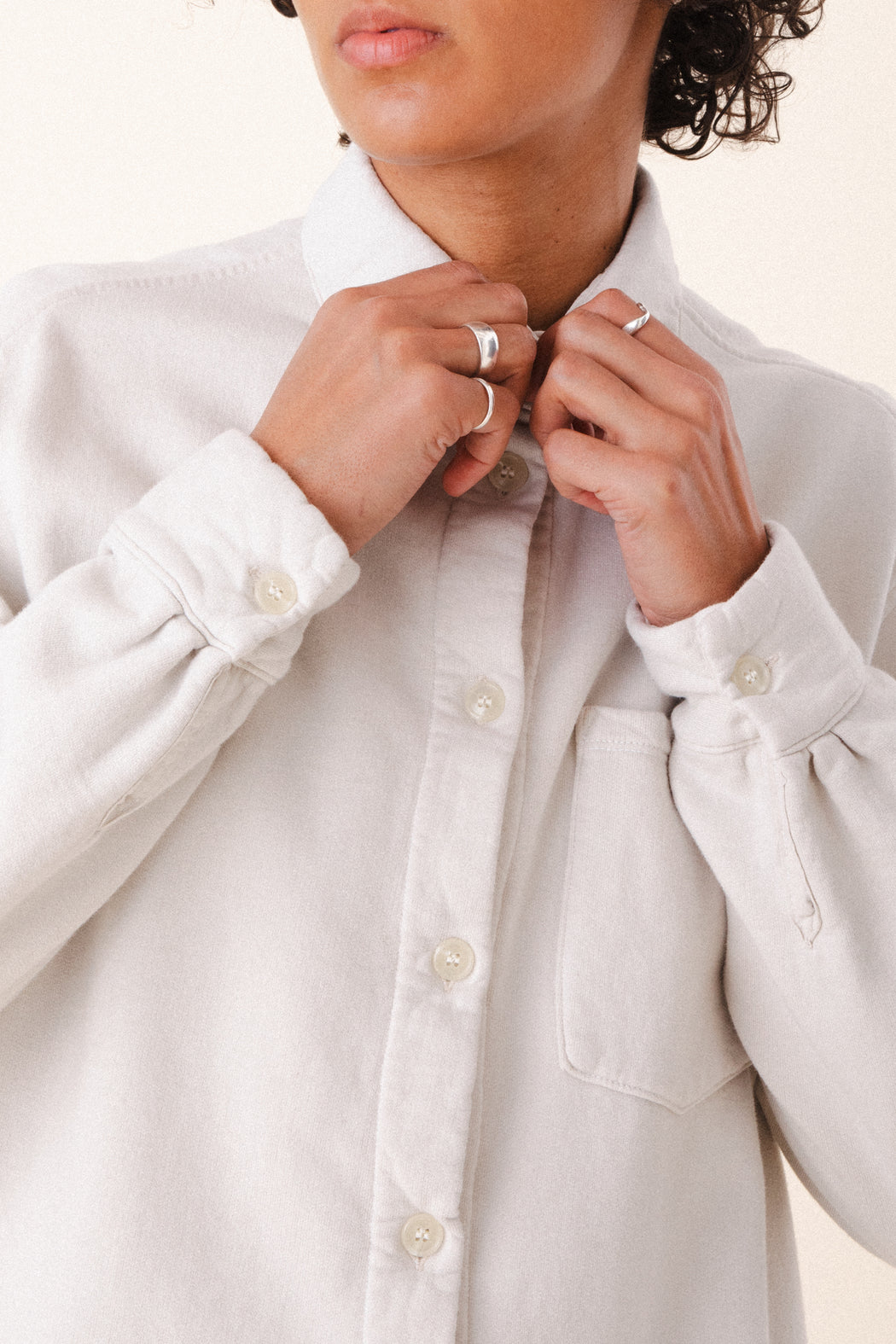 Taking inspiration from a prêt-à-porter shirt, we have evolved our Replica Shirt in a new textile to become the softest fleece shirt. Repeating beloved articles of clothing in unconventional textiles is a hallmark of our design methodology. This boxy knit shirt is composed of our beloved Organic Cotton Fleece that has been overdyed for softness and tonality.