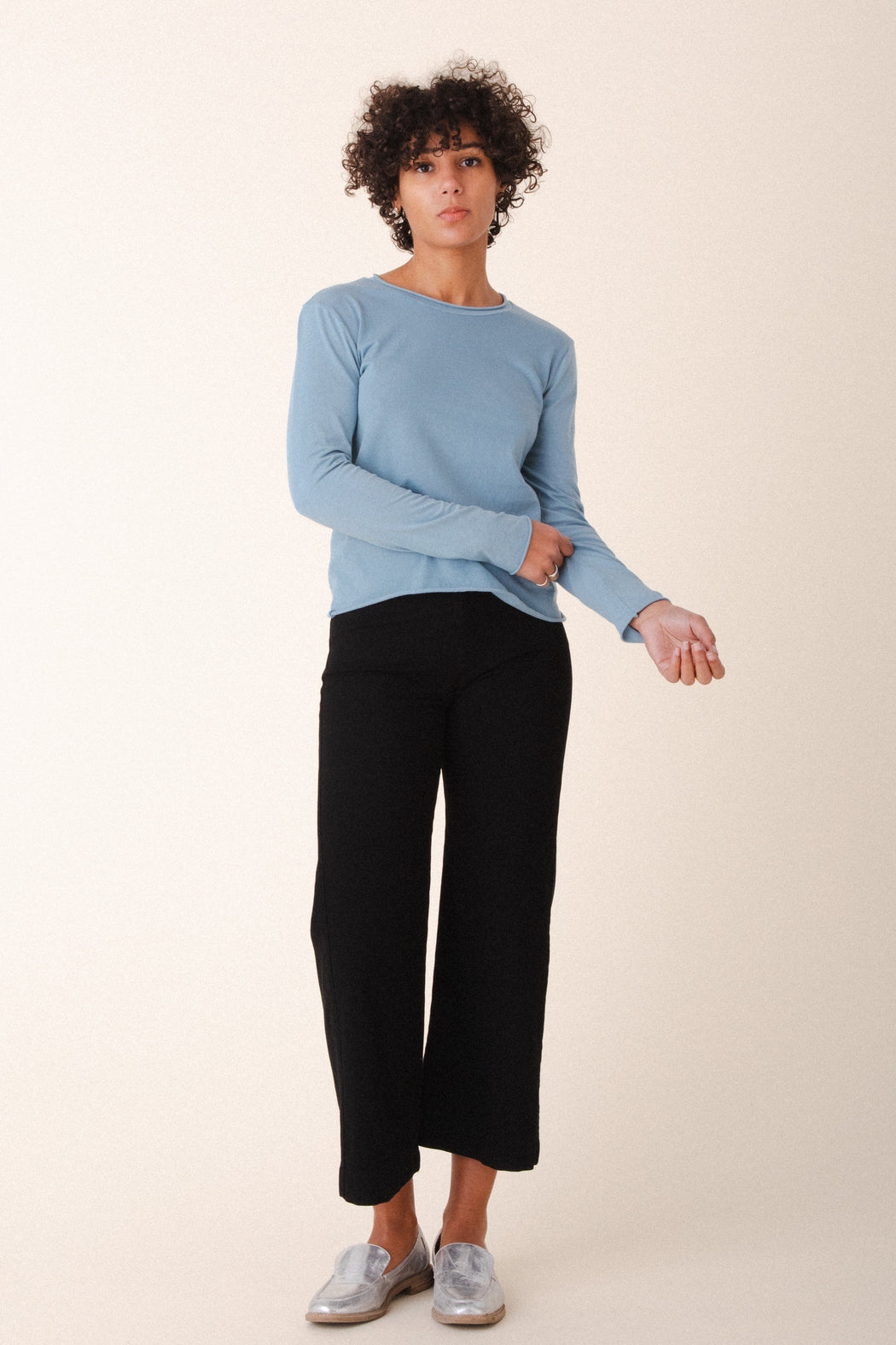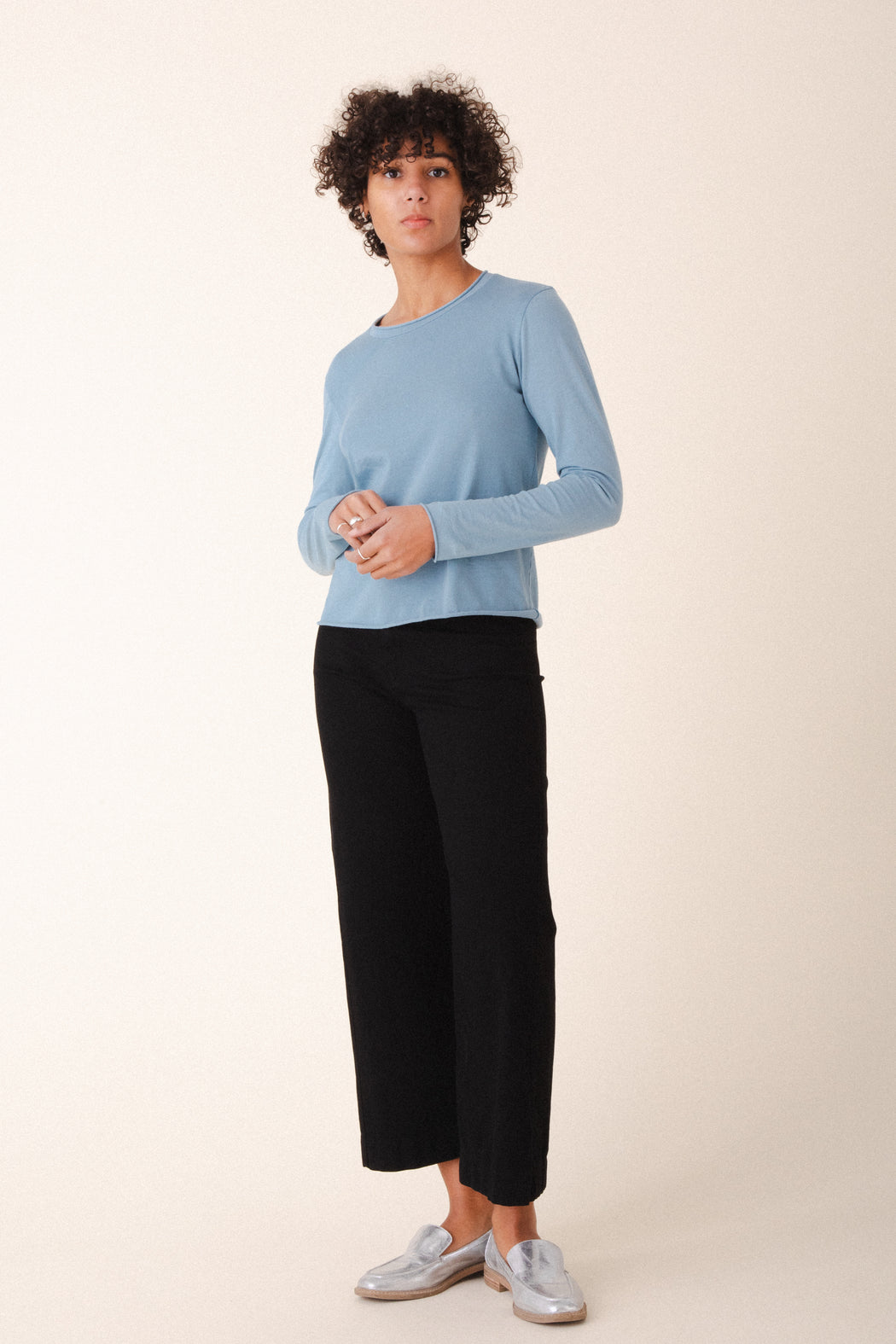 – Neck, sleeves, and hem have a raw, curled finish