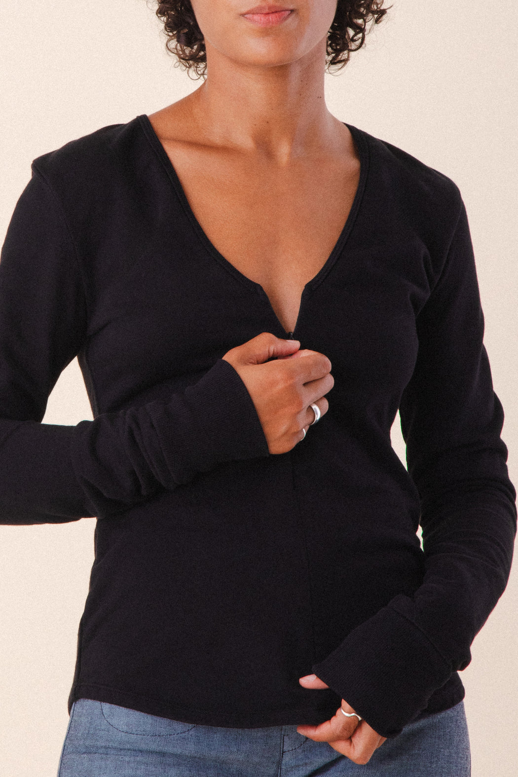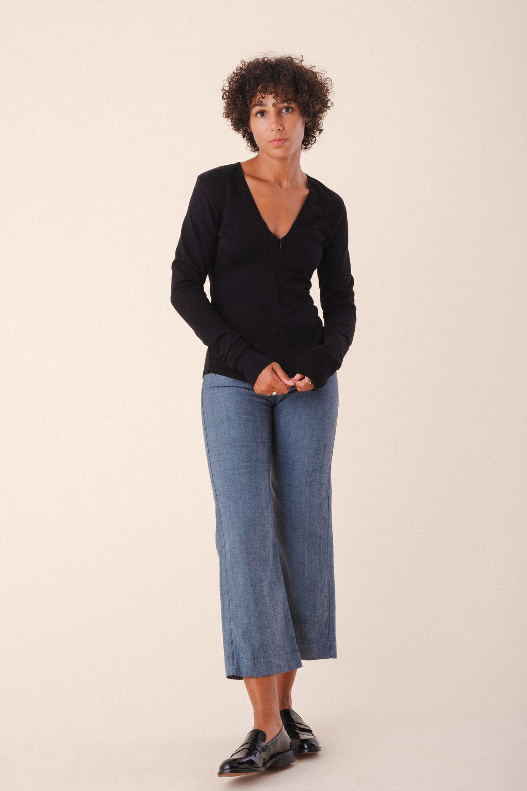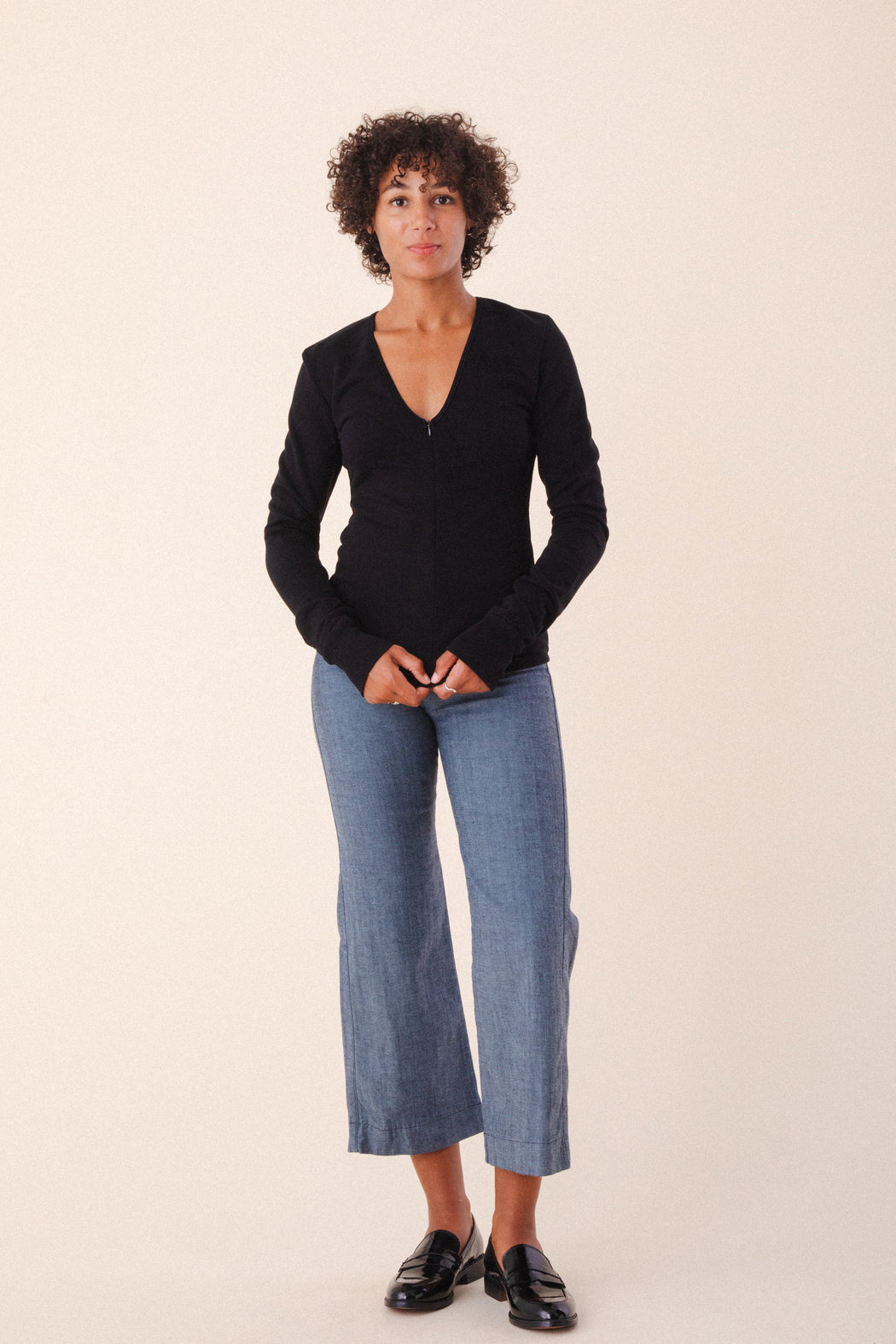An elegant V-neck sweatshirt with an invisible zip to impart a fitted look. Finished with extra-long sleeves and a tailored shape for ultimate warmth and luxury.