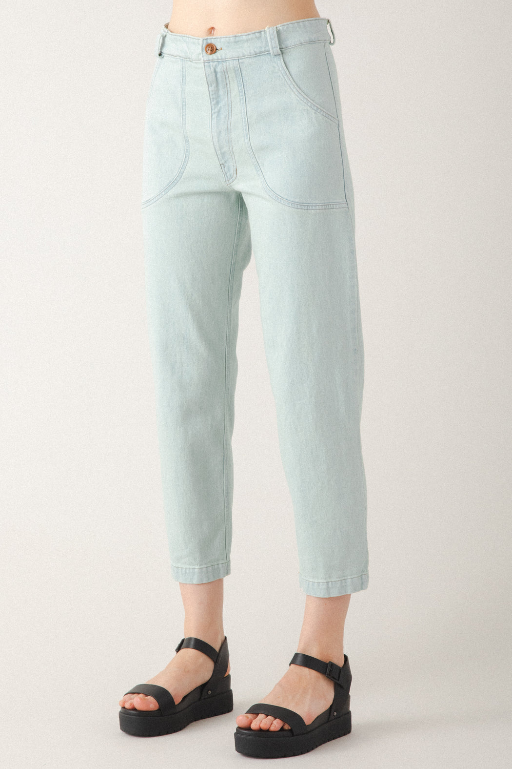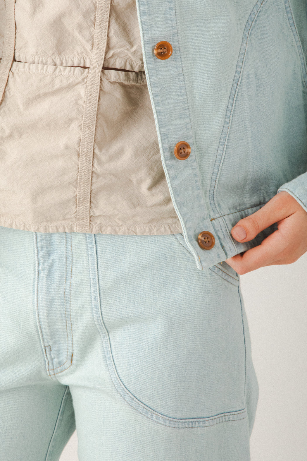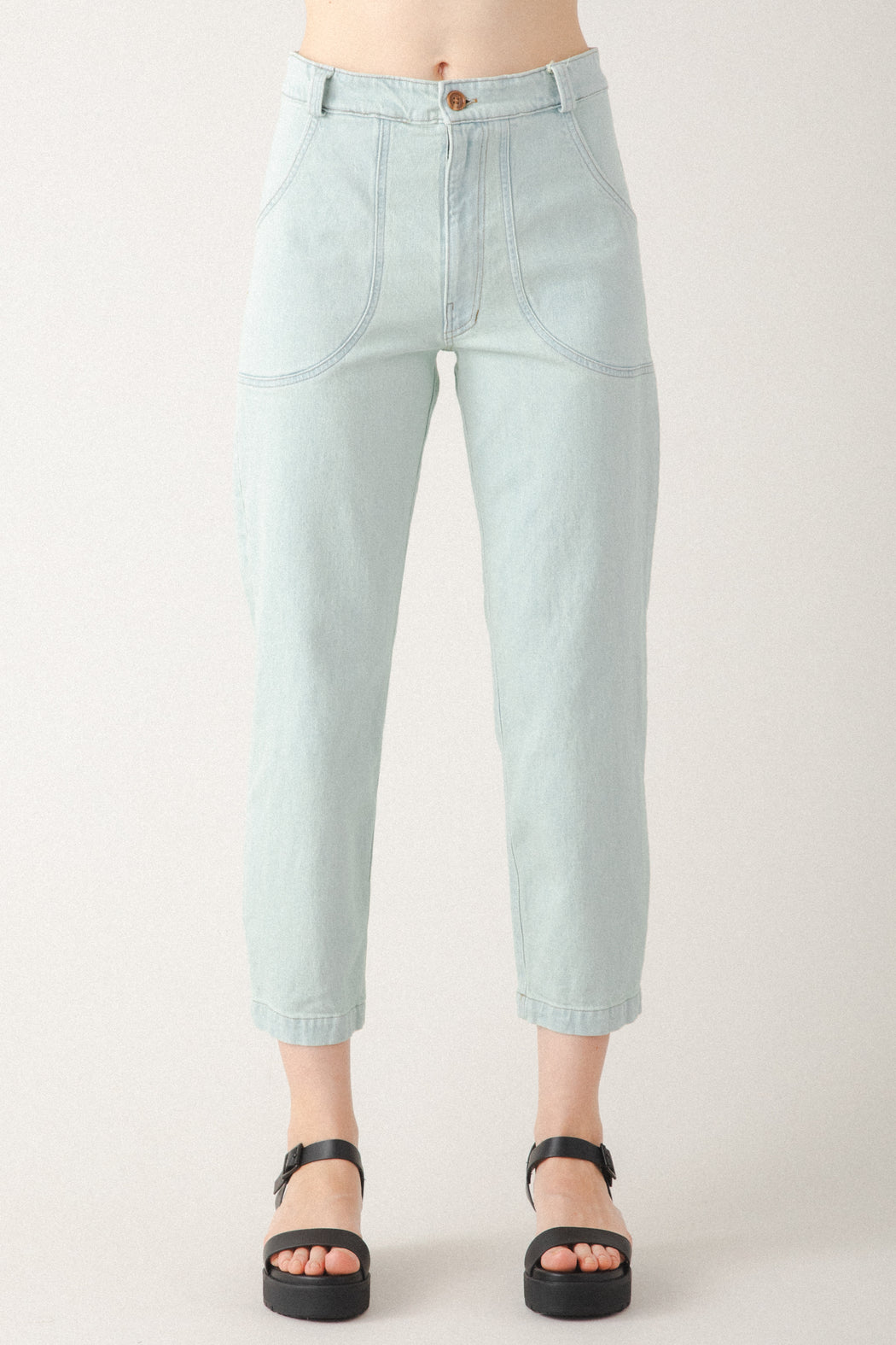 A fresh take on denim with a distinctly Mod-ish twist. The Modette Jeans feature rounded inset front pockets and contrast double-needle stitching for visual interest in all the right places. The cropped leg curves inward gently at the hem, creating a flattering lantern silhouette that pairs effortlessly with flats, oxfords, or your favorite sneakers. Cut from a unique cotton/linen denim, that offers an unexpected drape and texture rarely found in jeans—lightweight, breathable, and full of character. Style them with the Juxtapose Jacket for a modern take on suiting.