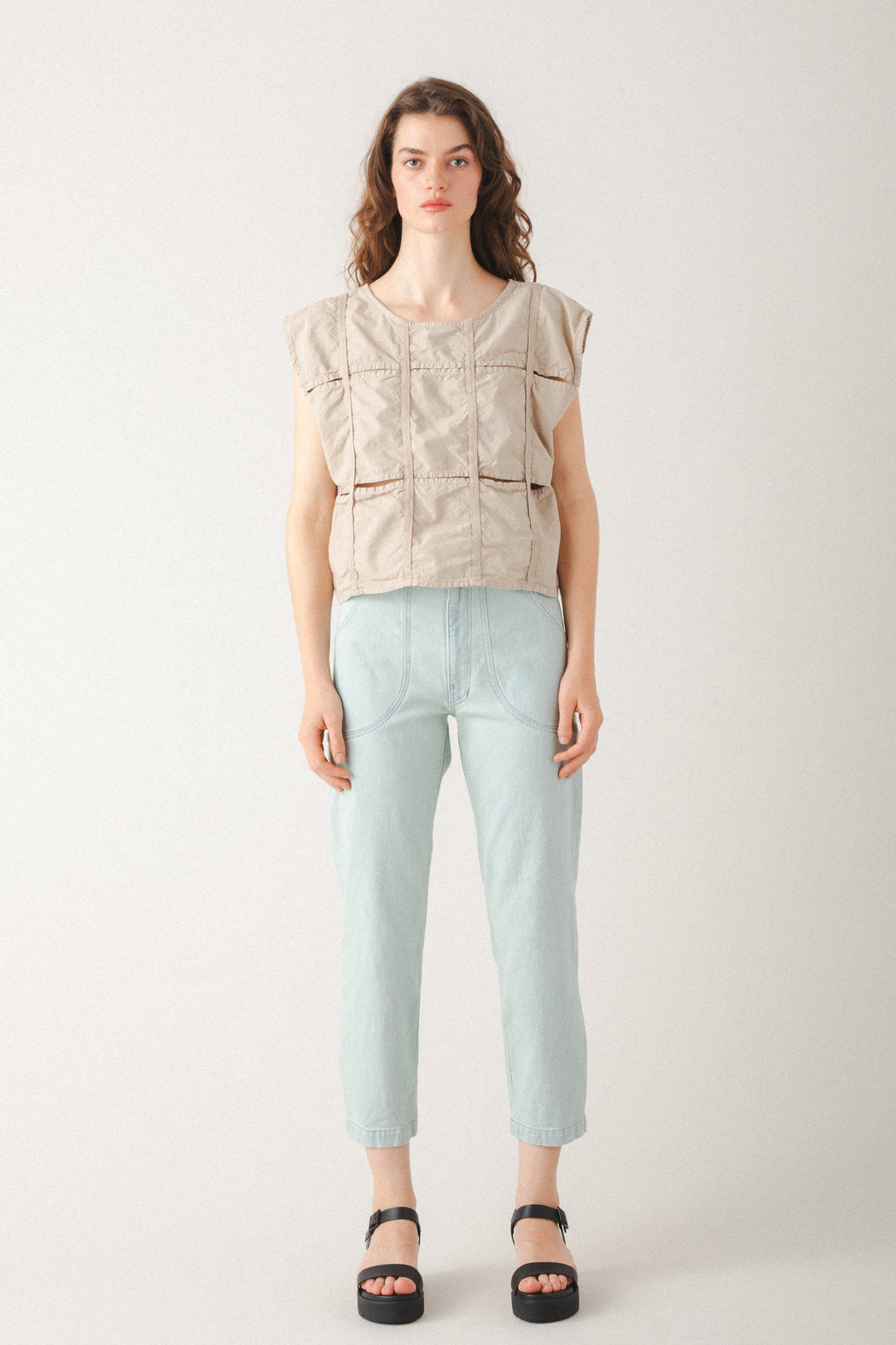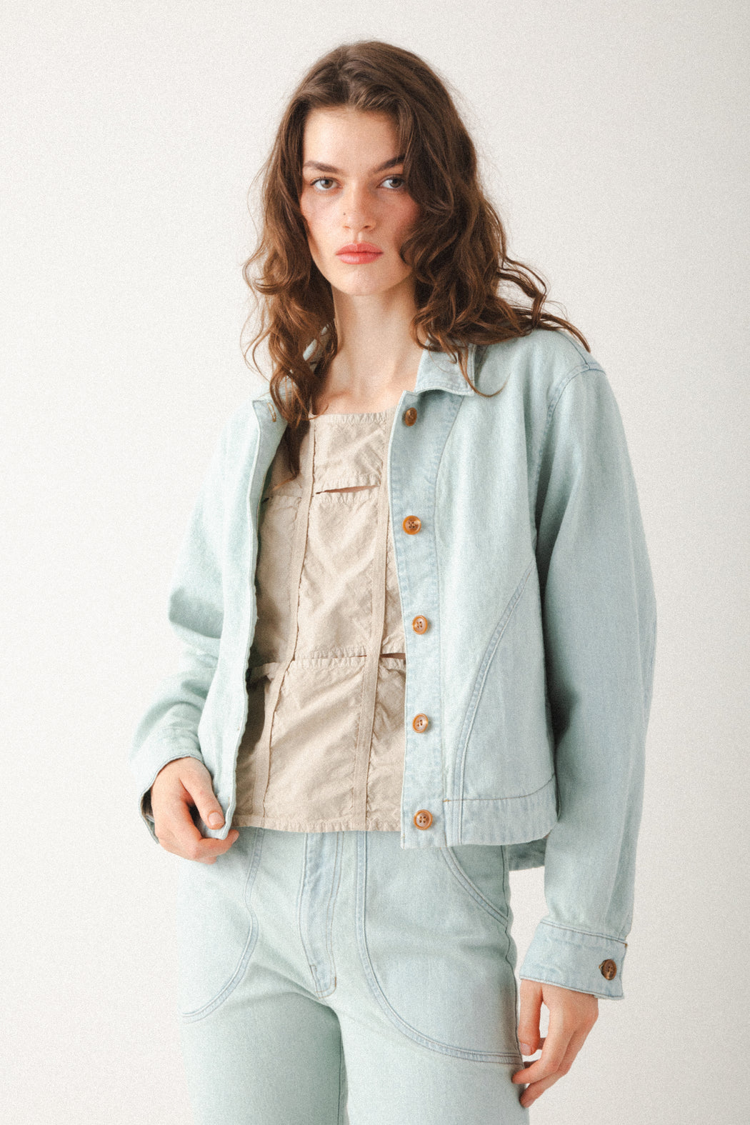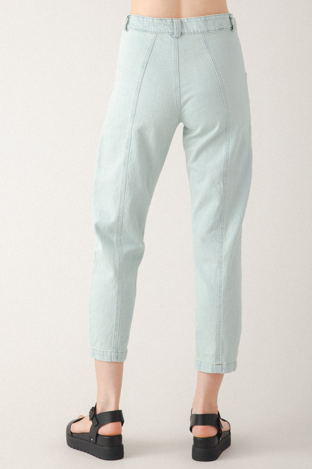 A fresh take on denim with a distinctly Mod-ish twist. The Modette Jeans feature rounded inset front pockets and contrast double-needle stitching for visual interest in all the right places. The cropped leg curves inward gently at the hem, creating a flattering lantern silhouette that pairs effortlessly with flats, oxfords, or your favorite sneakers. Cut from a unique cotton/linen denim, that offers an unexpected drape and texture rarely found in jeans—lightweight, breathable, and full of character. Style them with the Juxtapose Jacket for a modern take on suiting.