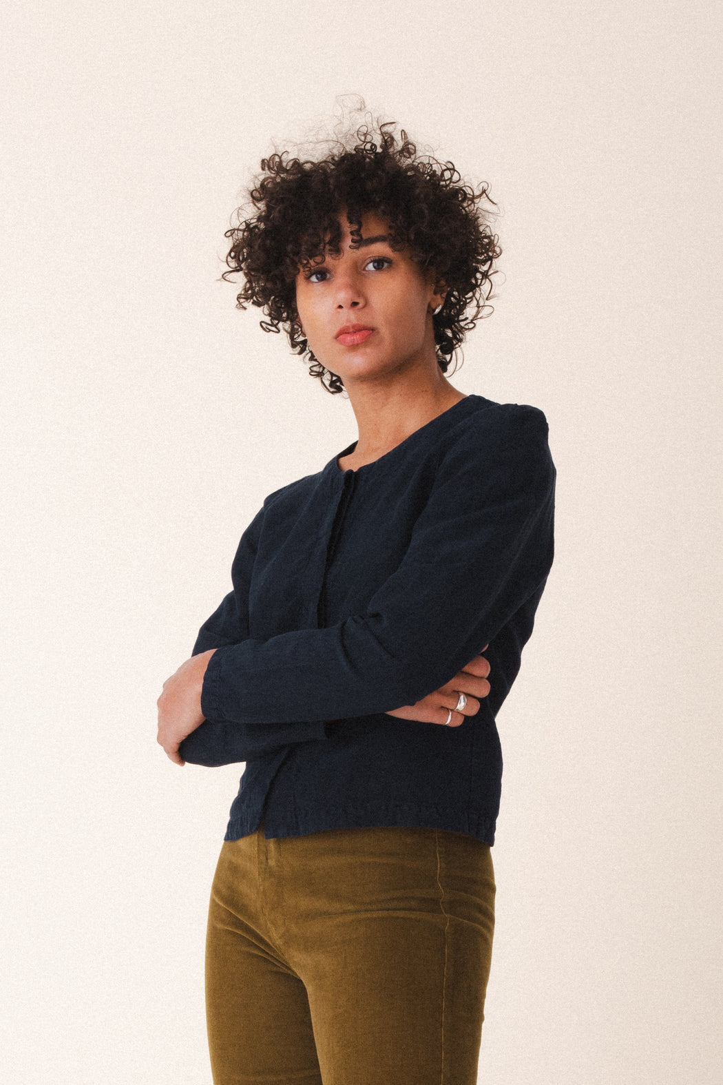 A return to historic designs of early American dress is not always traditional. The observation of a particular form can foster new directions. A tailored blouse with a covered button placket, high neckline, and a slightly puffed shoulder has always been part of our progressive vision. Constructed in an elegant hemp and silk blend for formal and informal occasions.