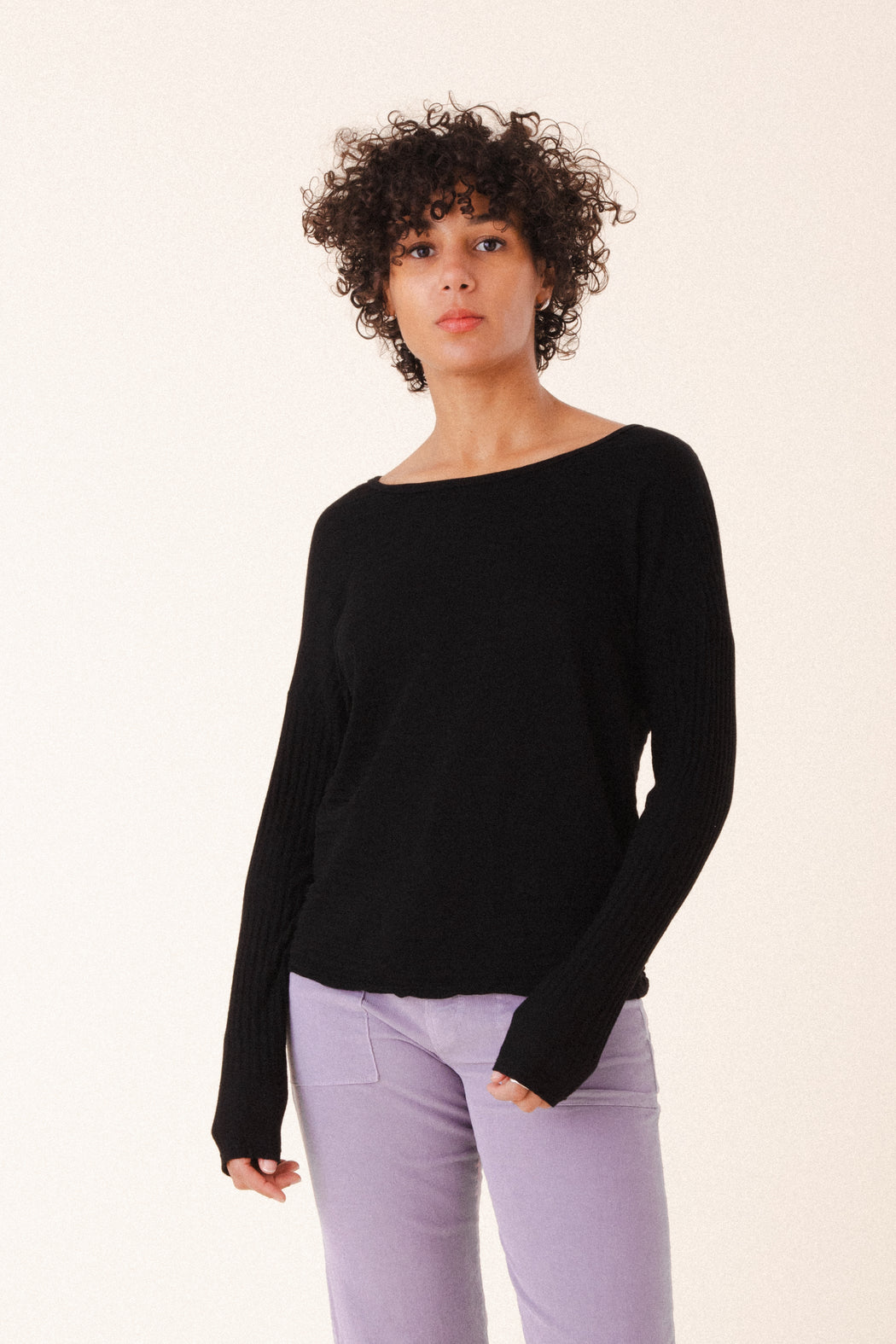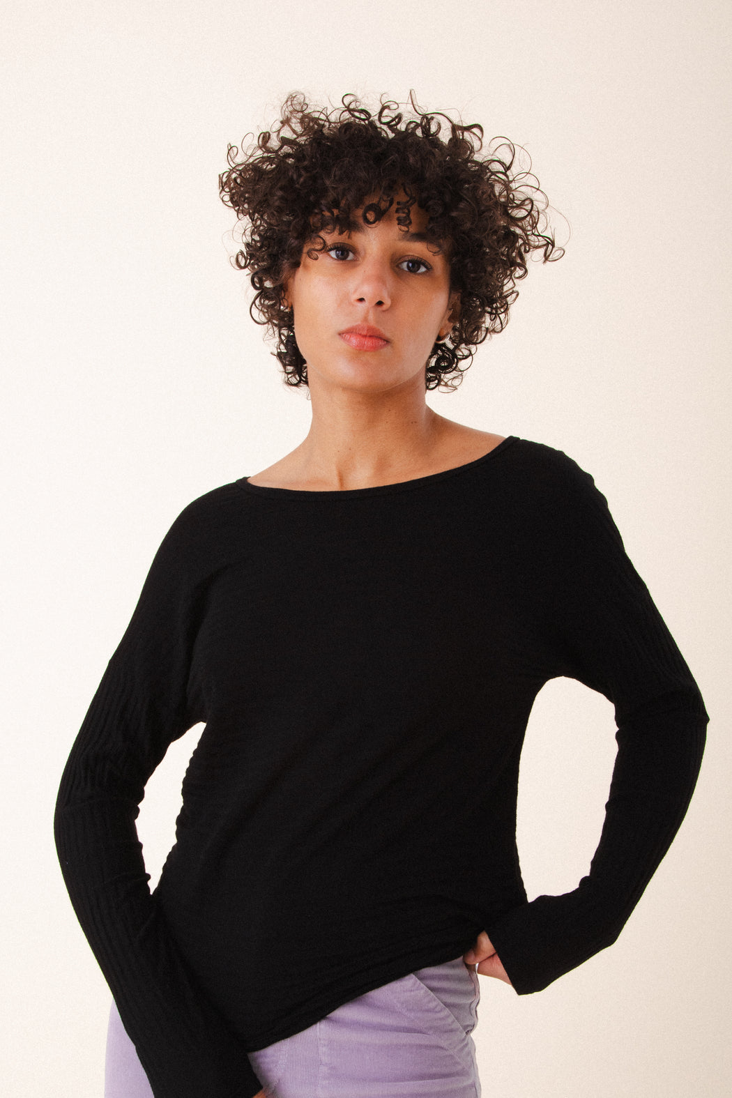 The stripes on this tee, have been cut to form an endless horizon, creating a feeling of expansiveness and motion. It is a complex cut, rigorously minimal, and with a gestural impact. Designed to be worn routinely, this clean, wide-neck tee is a layer in winter months and a perfect t-shirt for the rest of the year.