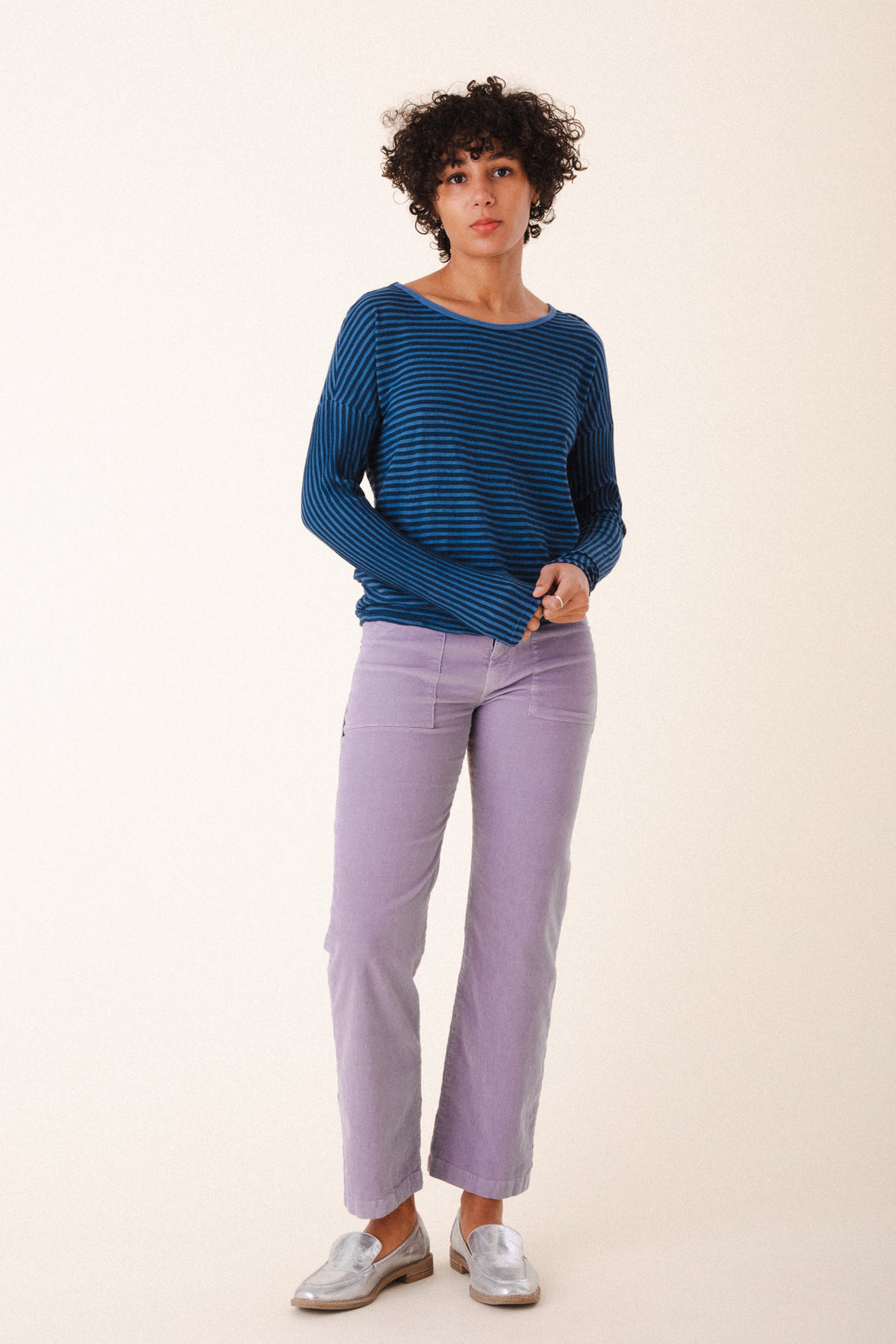 The stripes on this tee, have been cut to form an endless horizon, creating a feeling of expansiveness and motion. It is a complex cut, rigorously minimal, and with a gestural impact. Designed to be worn routinely, this clean, wide-neck tee is a layer in winter months and a perfect t-shirt for the rest of the year.