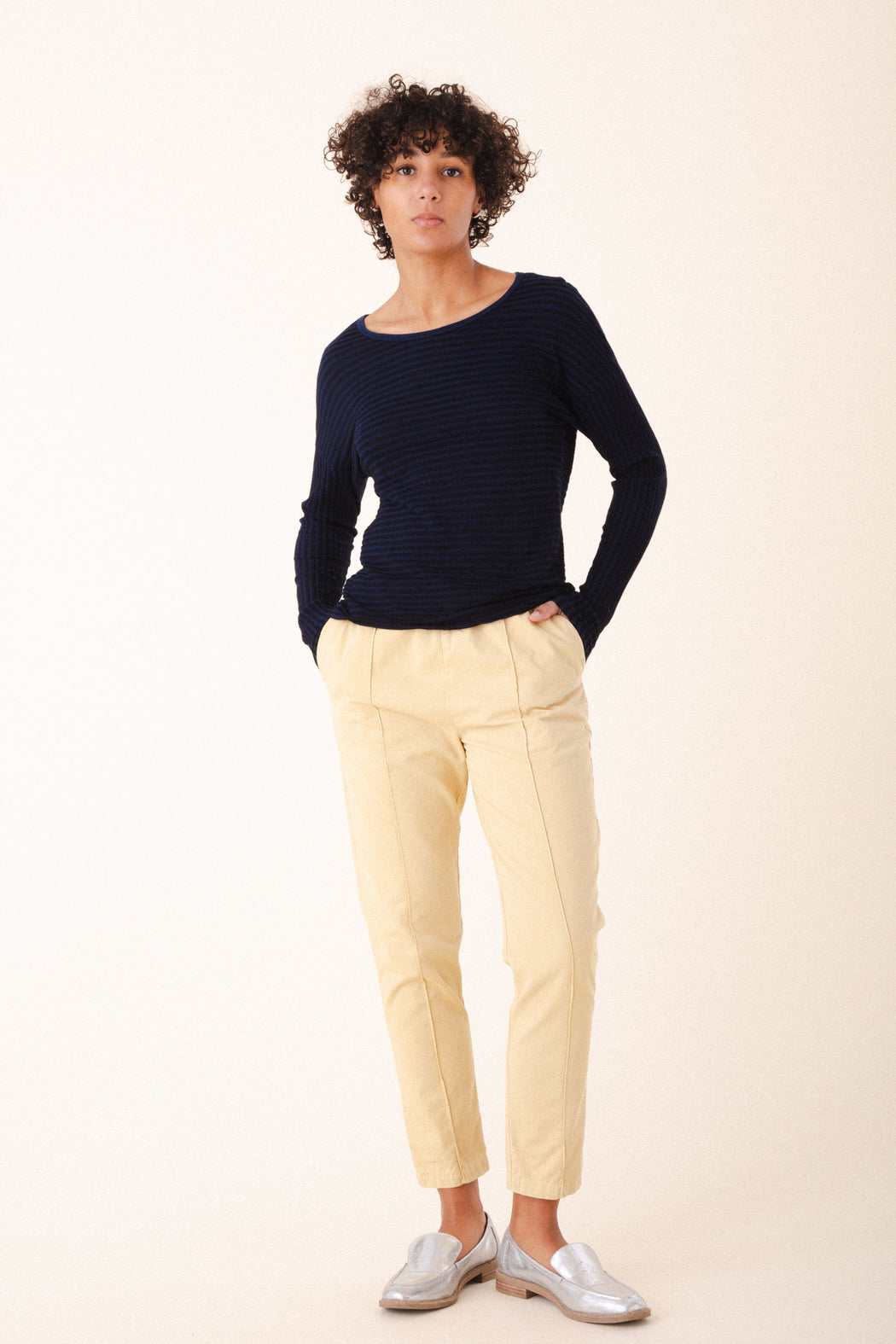 The stripes on this tee, have been cut to form an endless horizon, creating a feeling of expansiveness and motion. It is a complex cut, rigorously minimal, and with a gestural impact. Designed to be worn routinely, this clean, wide-neck tee is a layer in winter months and a perfect t-shirt for the rest of the year.