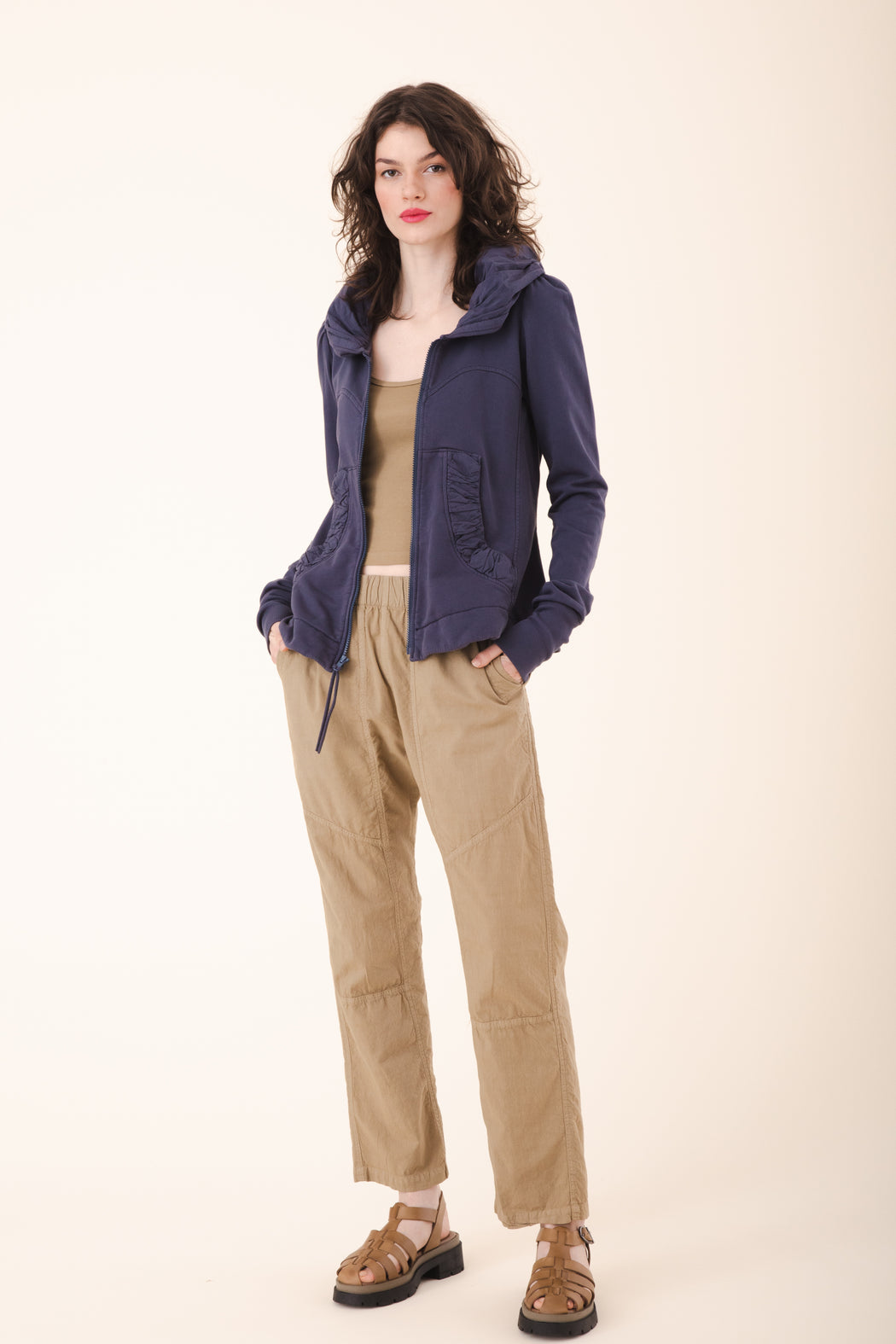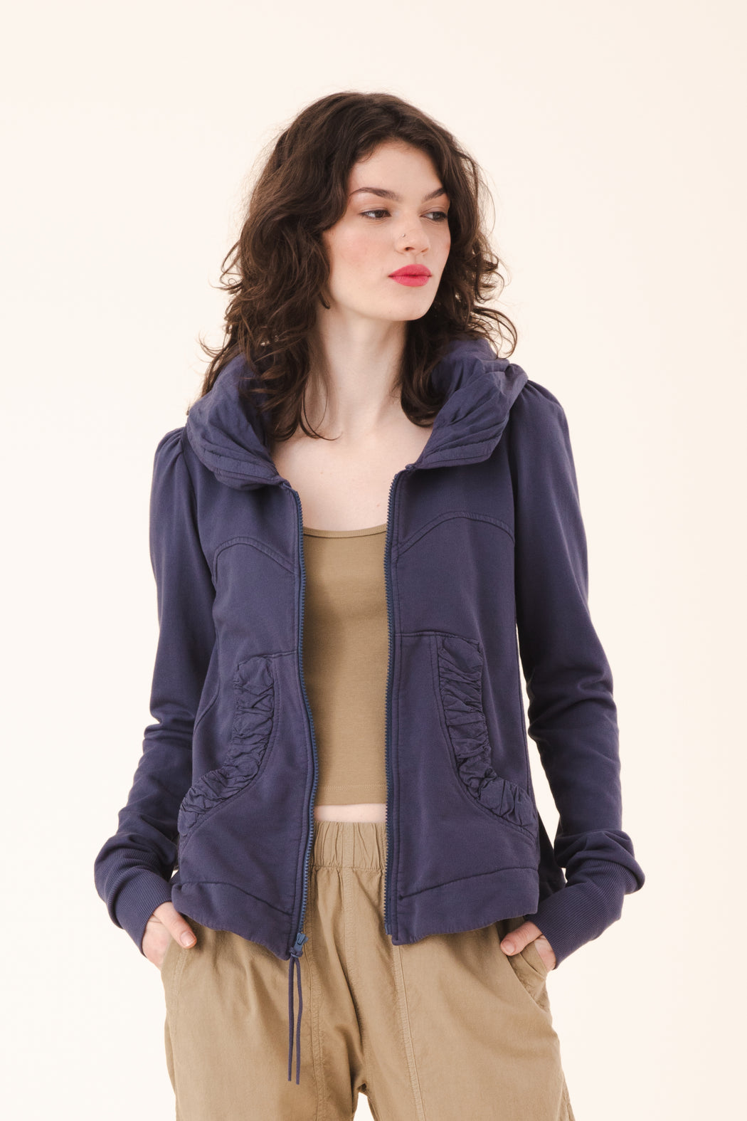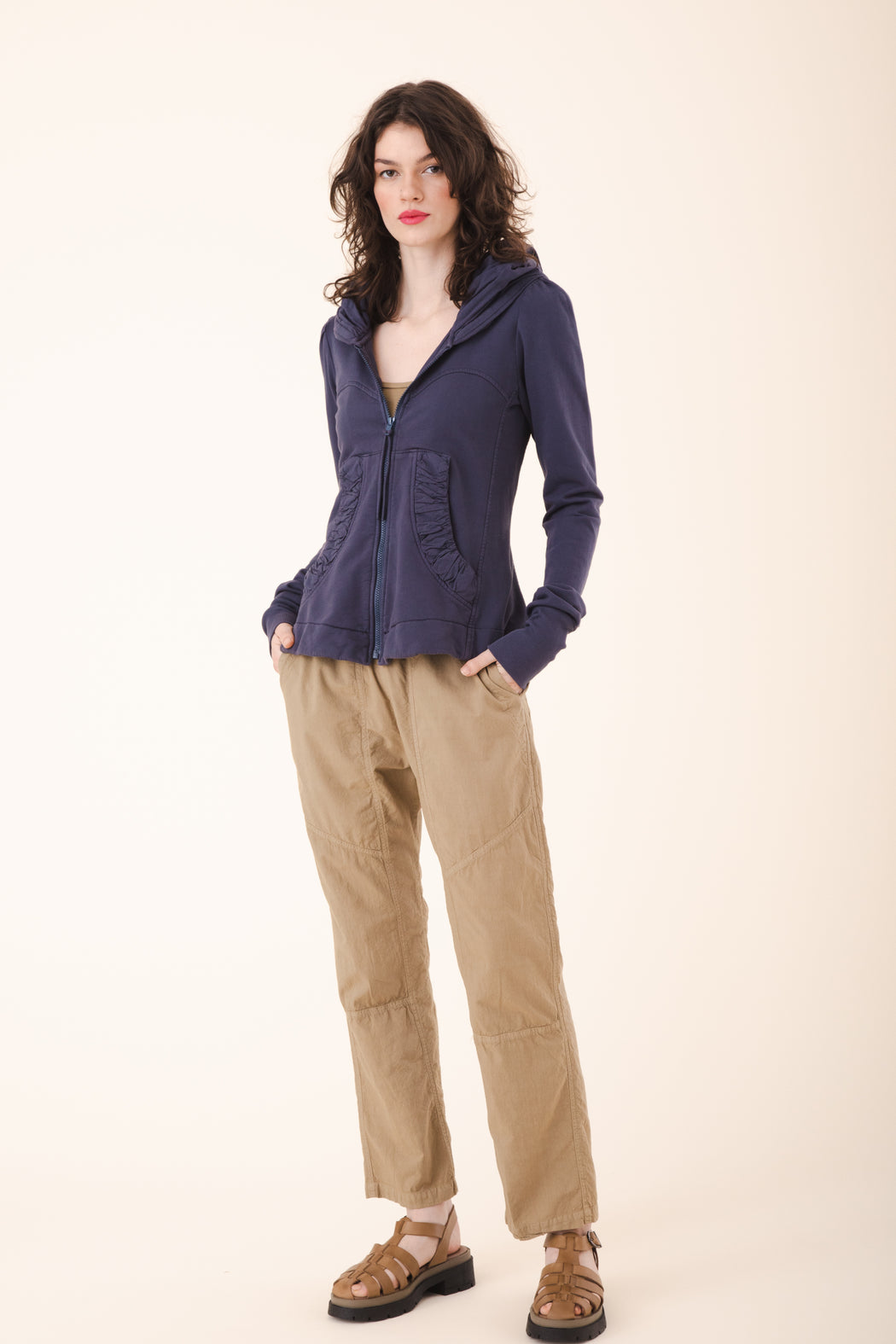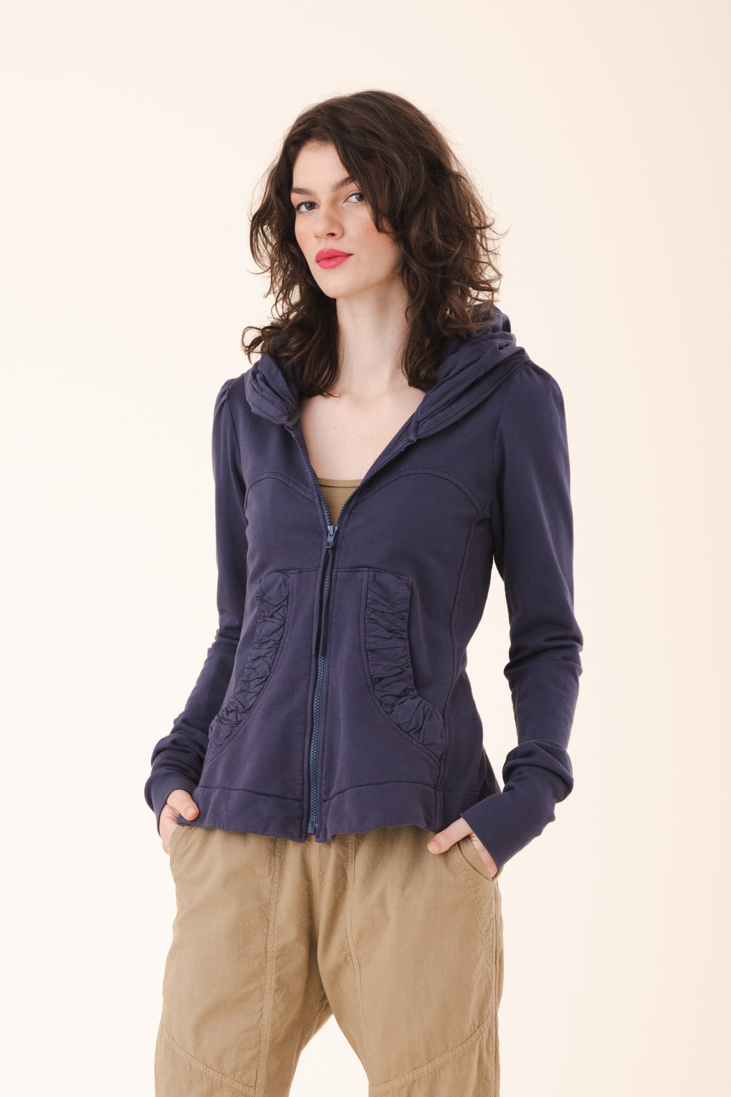 A Prairie Underground classic, first introduced in 2006 and one of our longest running styles. Dramatic fit and flare shaping with seamless sides and back belt inset. Ultra femme design lines and pockets embellished with gathered muslin insets are balanced by extra-long sleeves that can be gathered along the arm or won over the hand in cooler climes. When unzipped the hood may be draped over the shoulder.