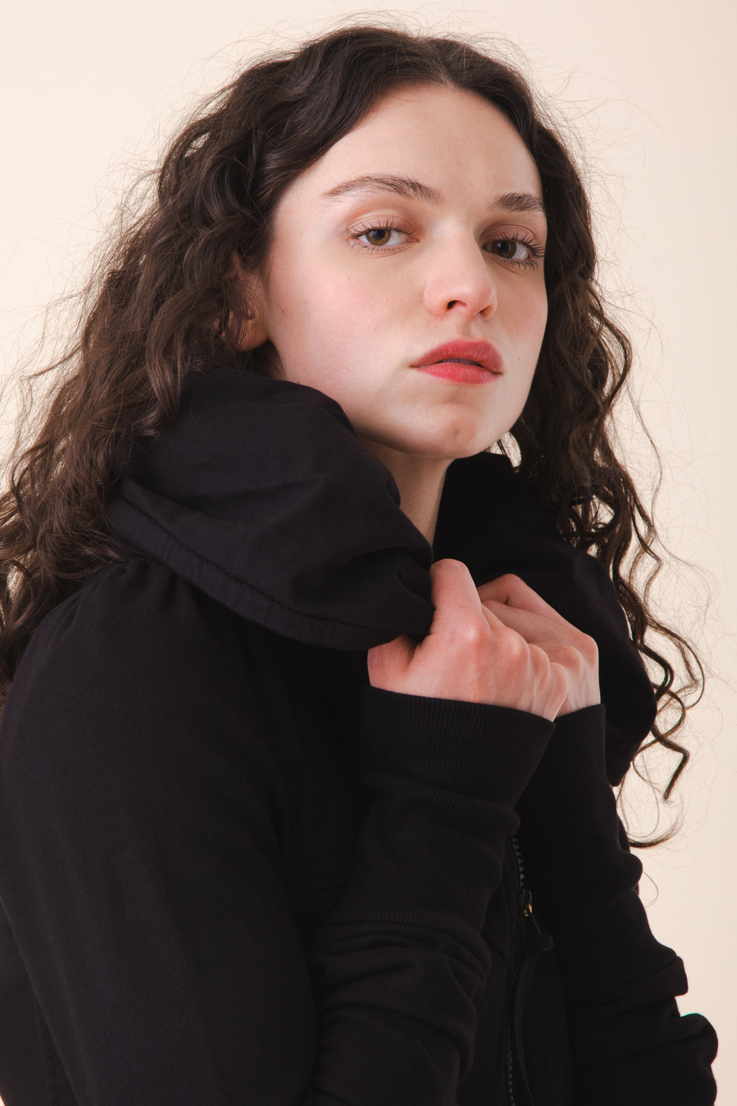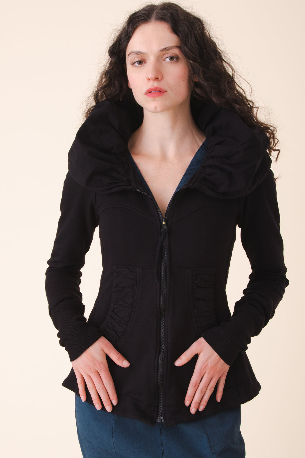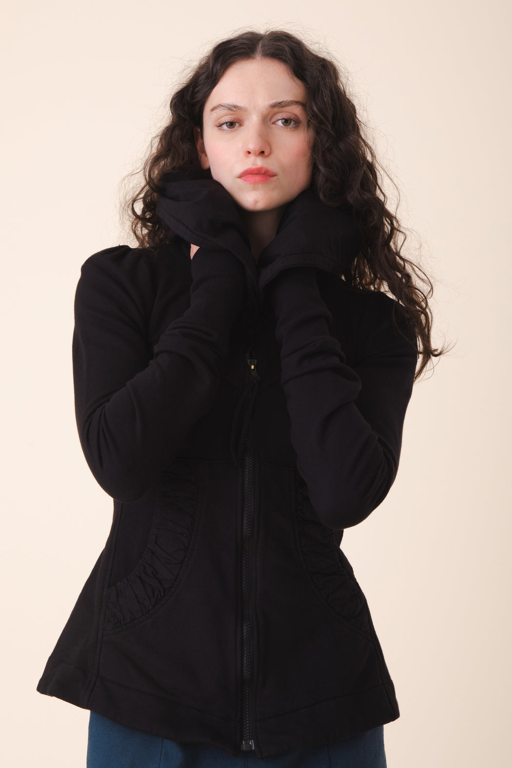 A Prairie Underground classic, first introduced in 2006 and one of our longest running styles. Dramatic fit and flare shaping with seamless sides and back belt inset. Ultra femme design lines and pockets embellished with gathered muslin insets are balanced by extra-long sleeves that can be gathered along the arm or won over the hand in cooler climes. When unzipped the hood may be draped over the shoulder.