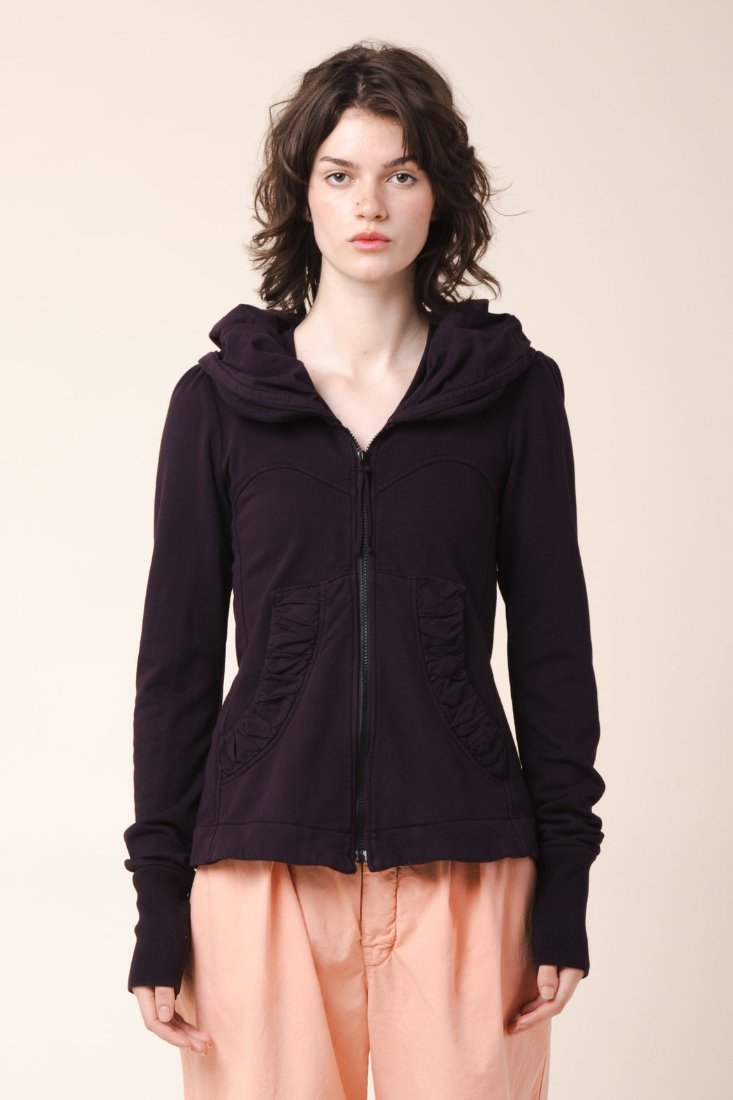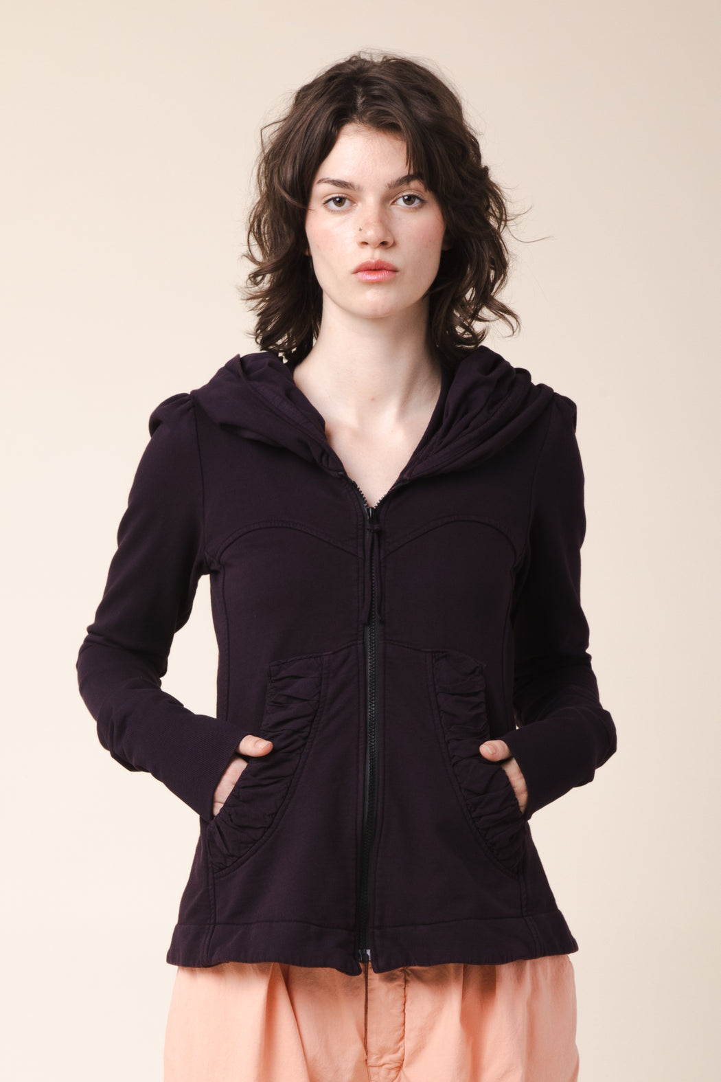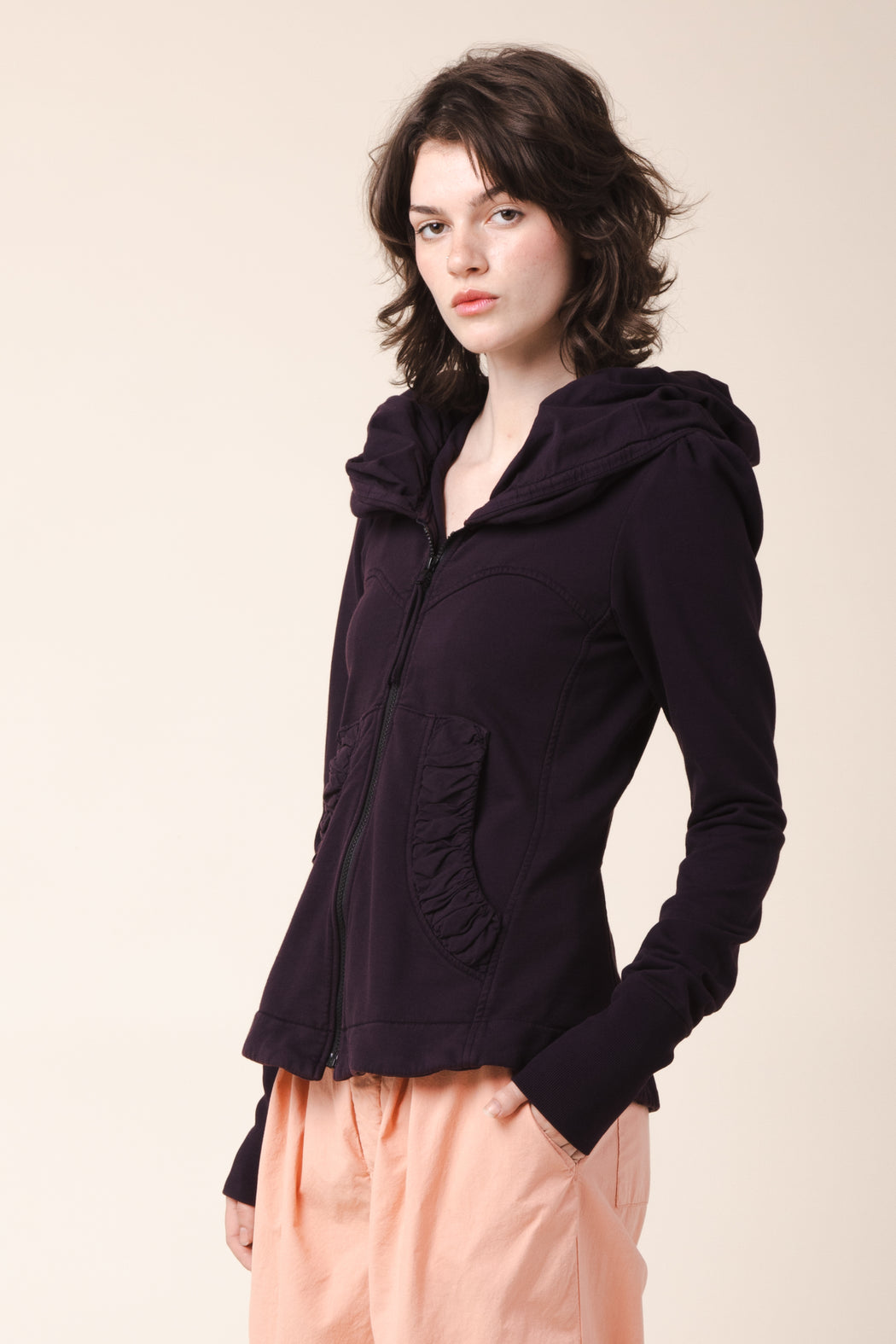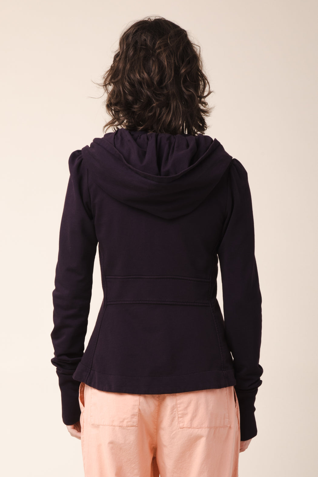 A Prairie Underground classic, first introduced in 2006 and one of our longest running styles. Dramatic fit and flare shaping with seamless sides and back belt inset. Ultra femme design lines and pockets embellished with gathered muslin insets are balanced by extra-long sleeves that can be gathered along the arm or won over the hand in cooler climes. When unzipped the hood may be draped over the shoulder.