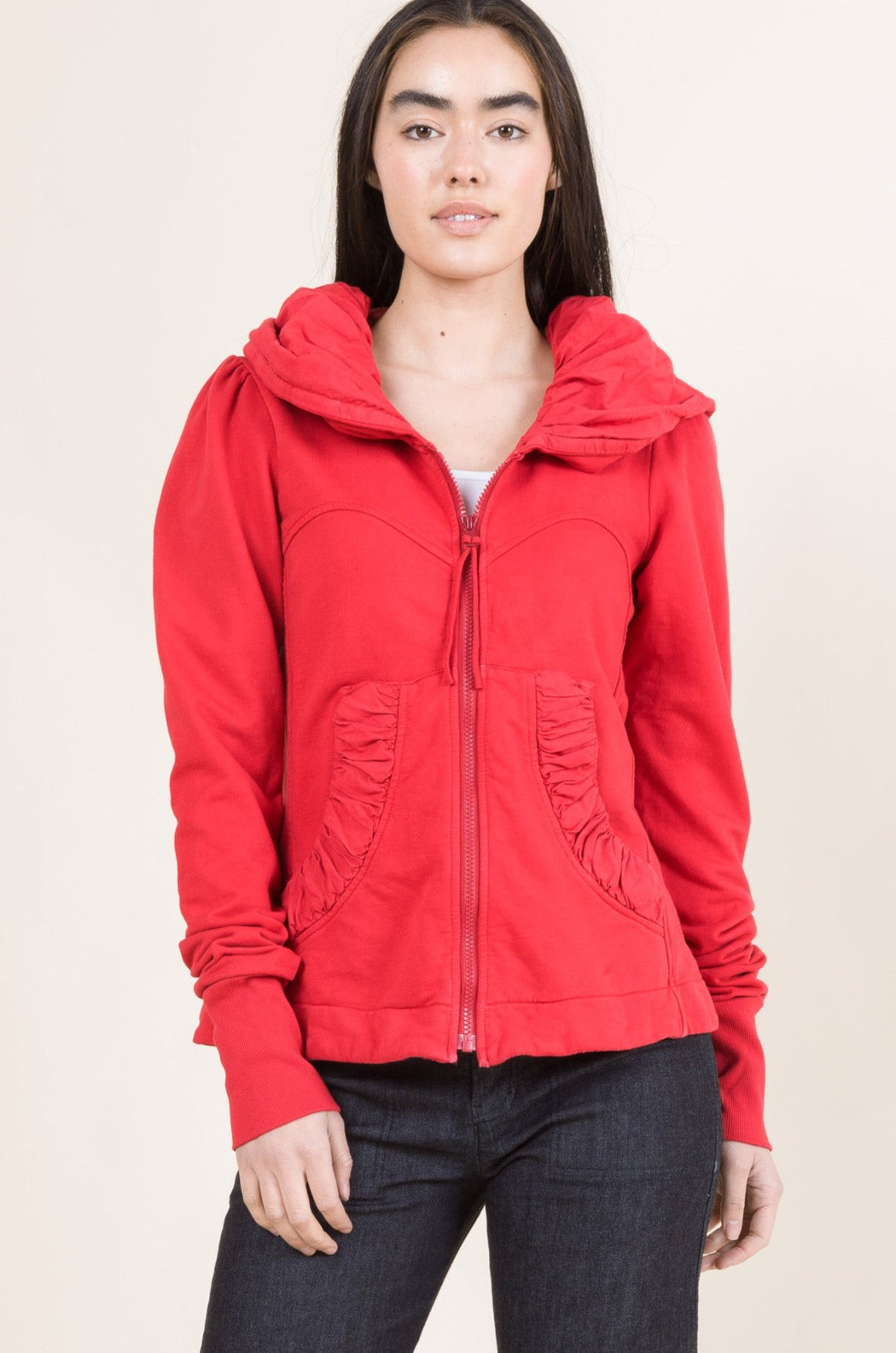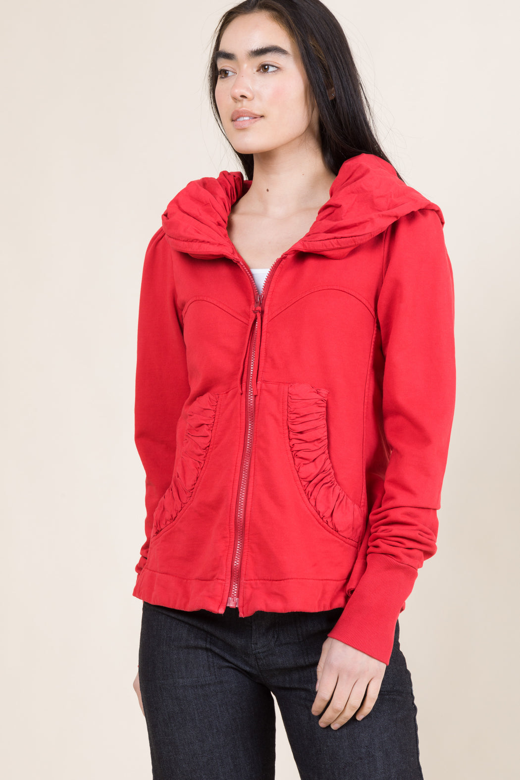 A Prairie Underground classic, first introduced in 2006 and one of our longest running styles. Dramatic fit and flare shaping with seamless sides and back belt inset. Ultra femme design lines and pockets embellished with gathered muslin insets are balanced by extra-long sleeves that can be gathered along the arm or won over the hand in cooler climes. When unzipped the hood may be draped over the shoulder.