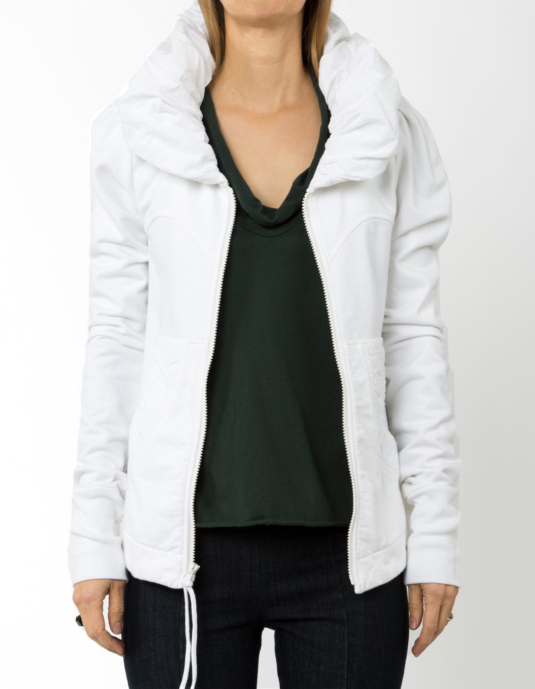 A Prairie Underground classic, first introduced in 2006 and one of our longest running styles. Dramatic fit and flare shaping with seamless sides and back belt inset. Ultra femme design lines and pockets embellished with gathered muslin insets are balanced by extra-long sleeves that can be gathered along the arm or won over the hand in cooler climes. When unzipped the hood may be draped over the shoulder.