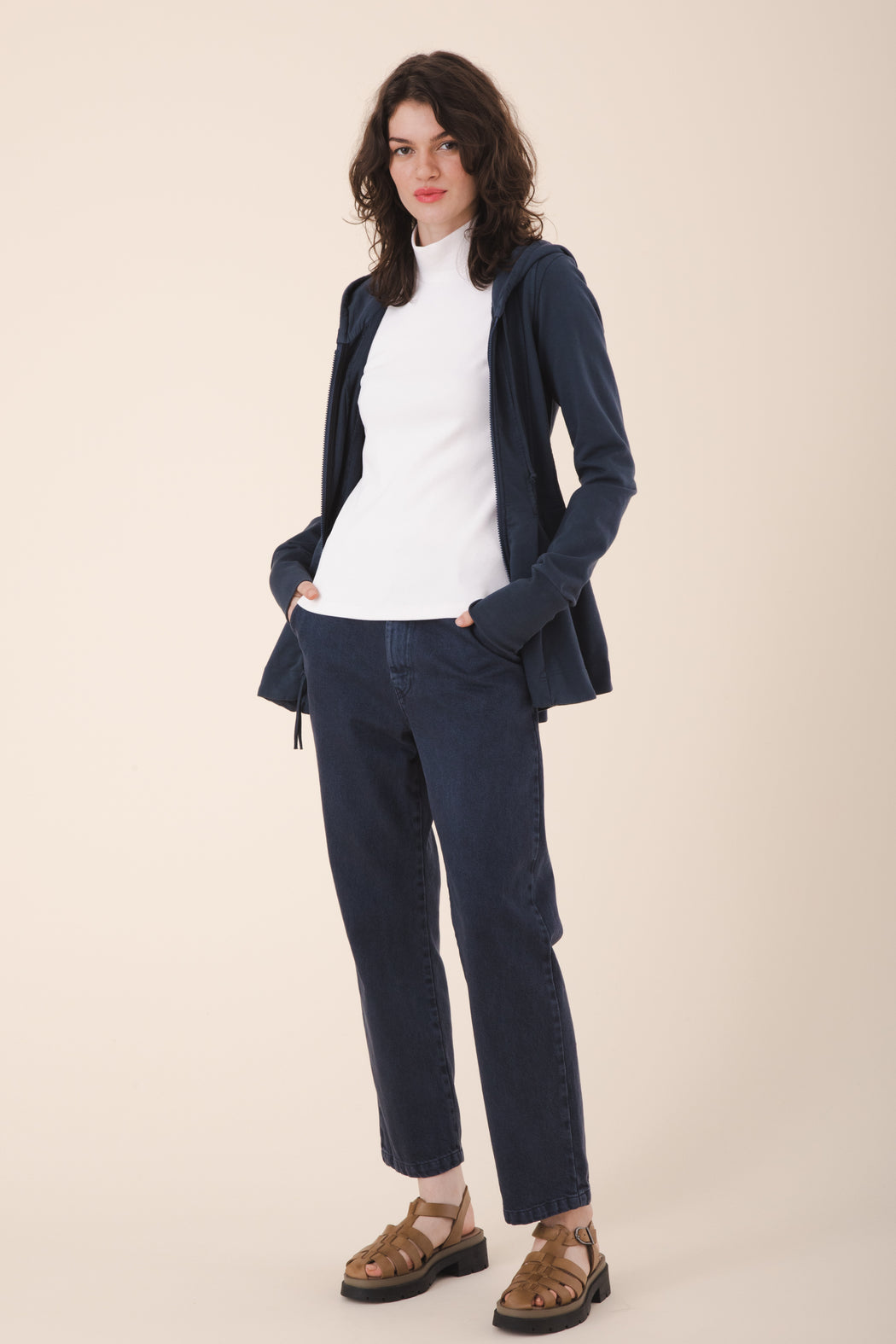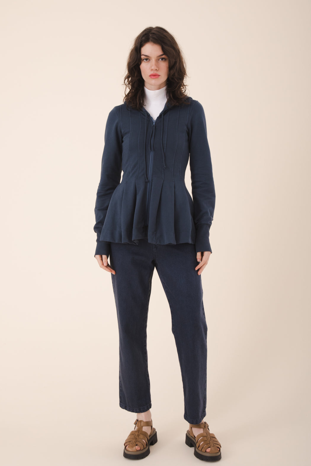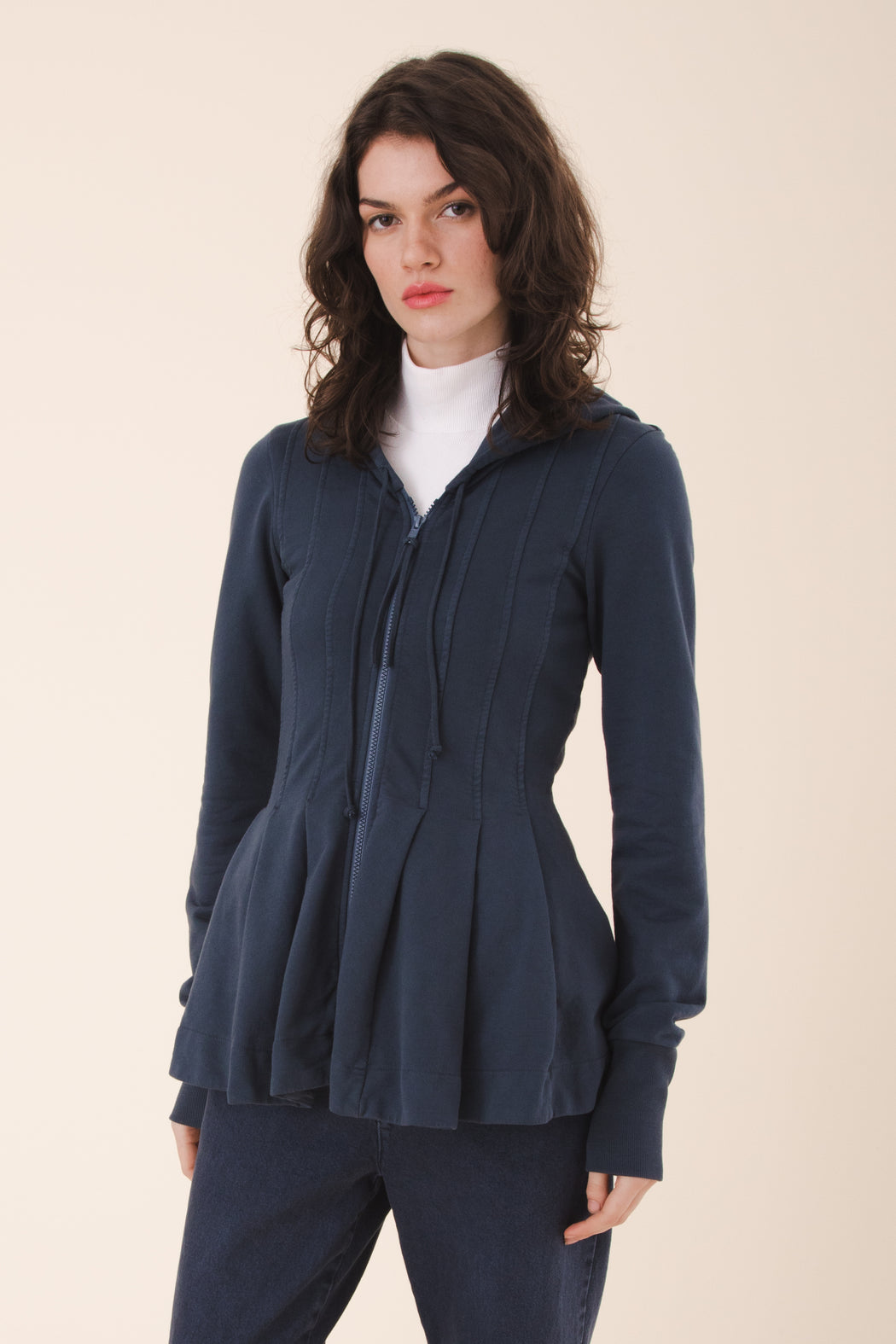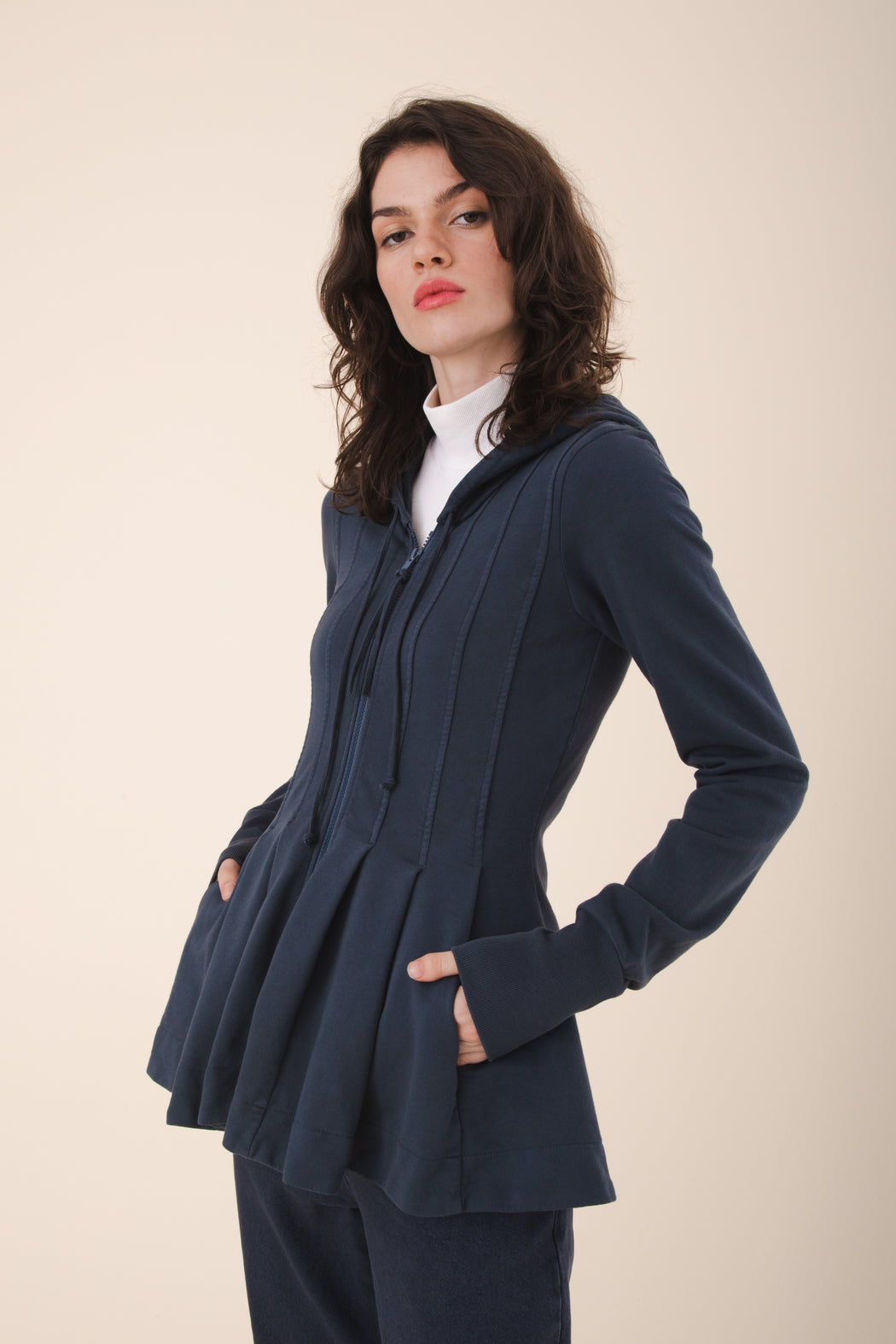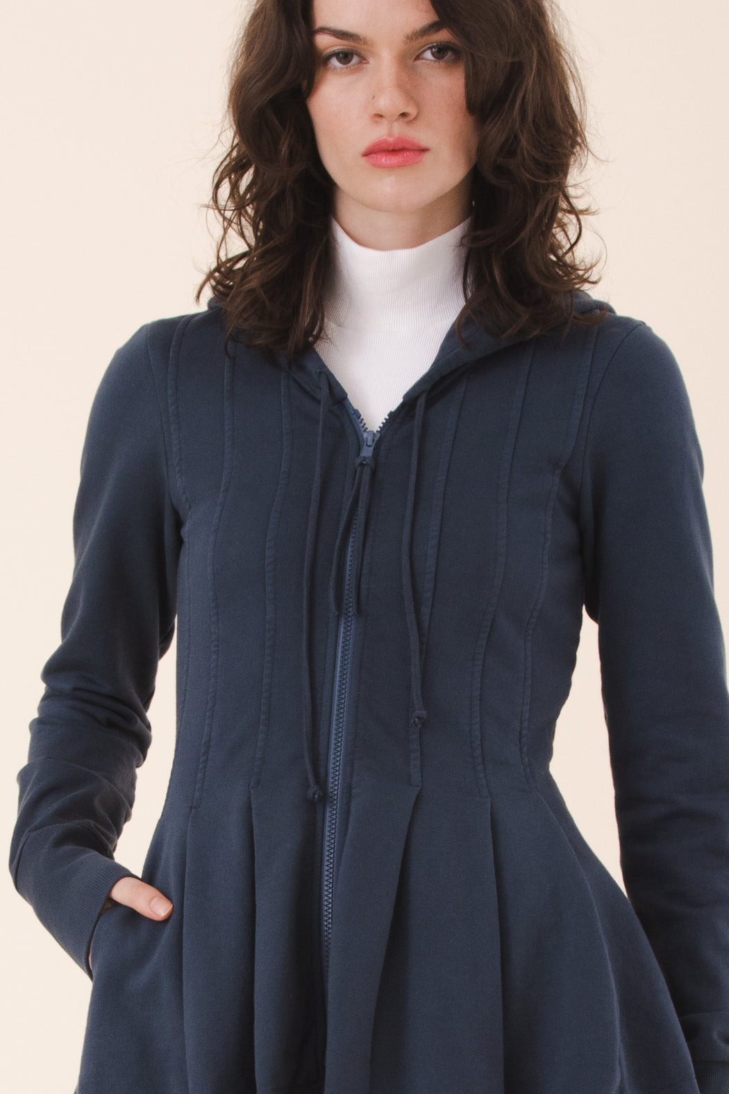 Inspired by the art of origami and mid-19th century fashion silhouettes, we interpreted our staple hoodie shape for the current era. Our signature organic cotton French Terry has been folded and topstitched throughout to define a mid-length jacket with a shaped waist and full skirt. A new addition to our time-honored tradition of non-traditional hoodies.