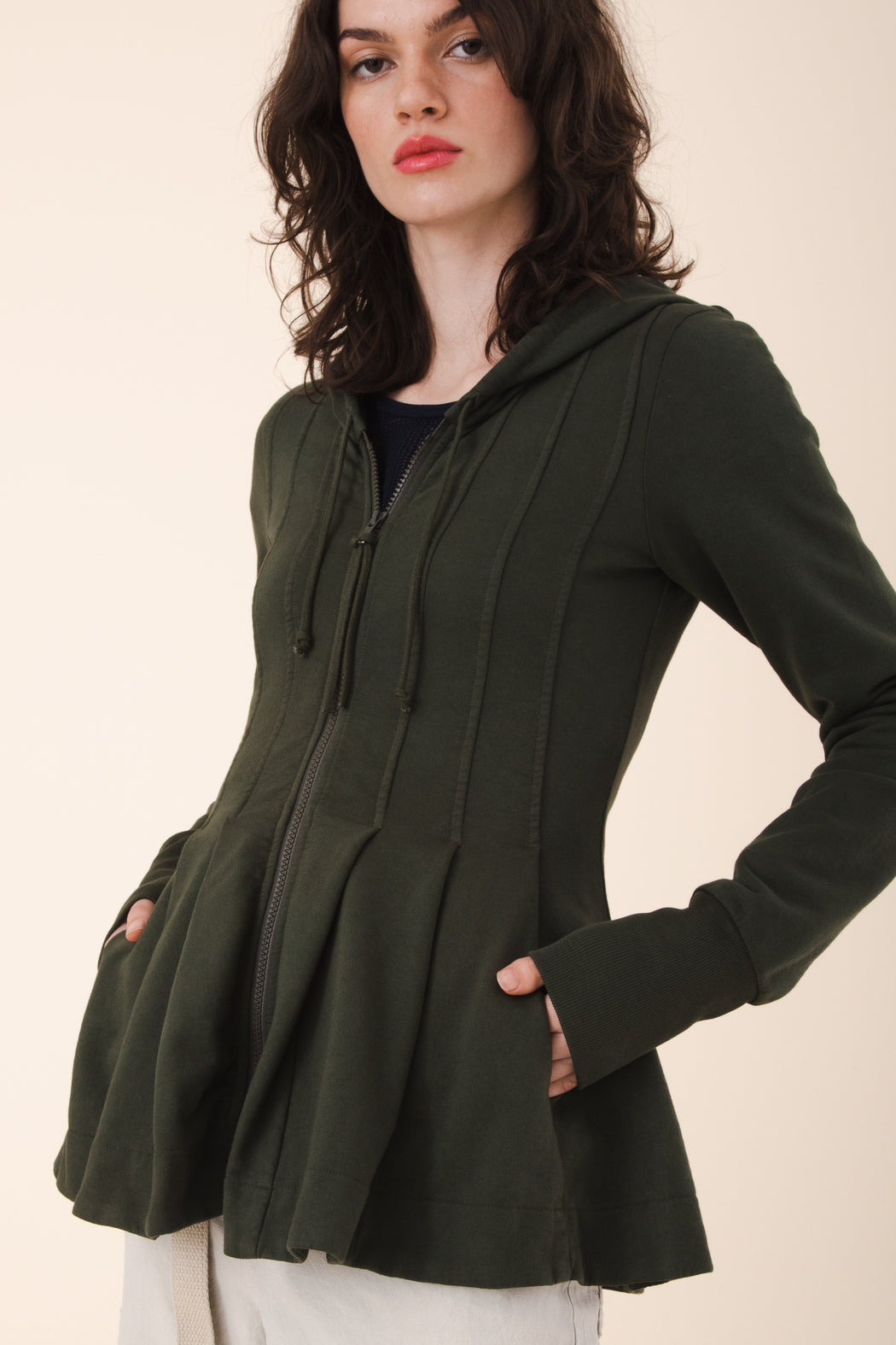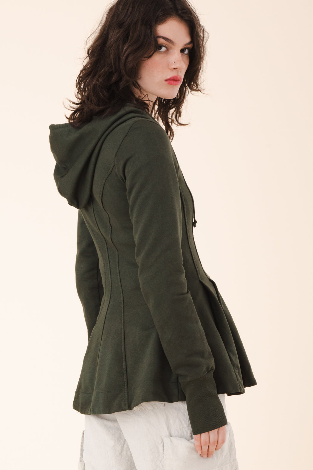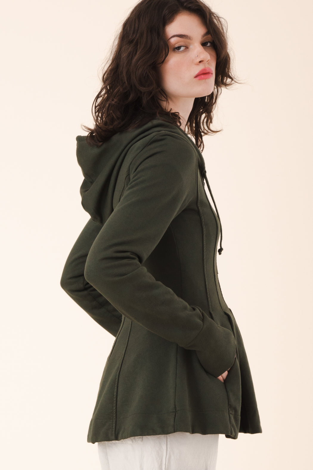 Inspired by the art of origami and mid-19th century fashion silhouettes, we interpreted our staple hoodie shape for the current era. Our signature organic cotton French Terry has been folded and topstitched throughout to define a mid-length jacket with a shaped waist and full skirt. A new addition to our time-honored tradition of non-traditional hoodies.