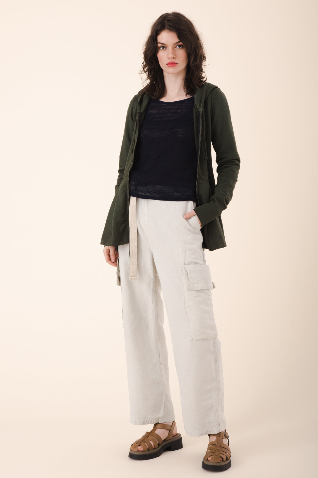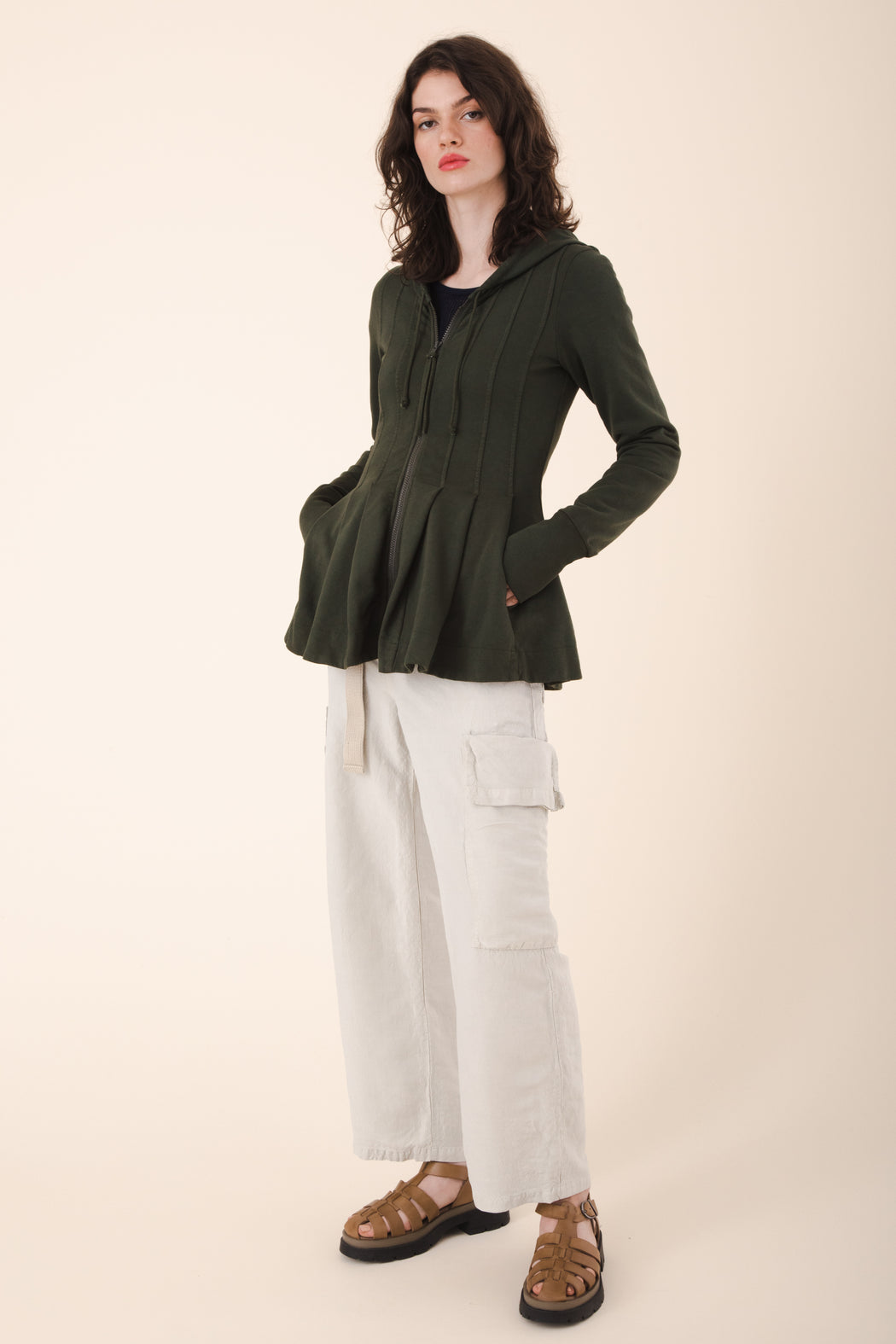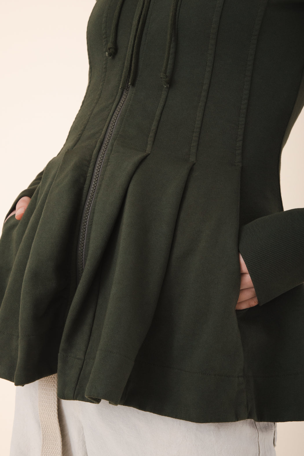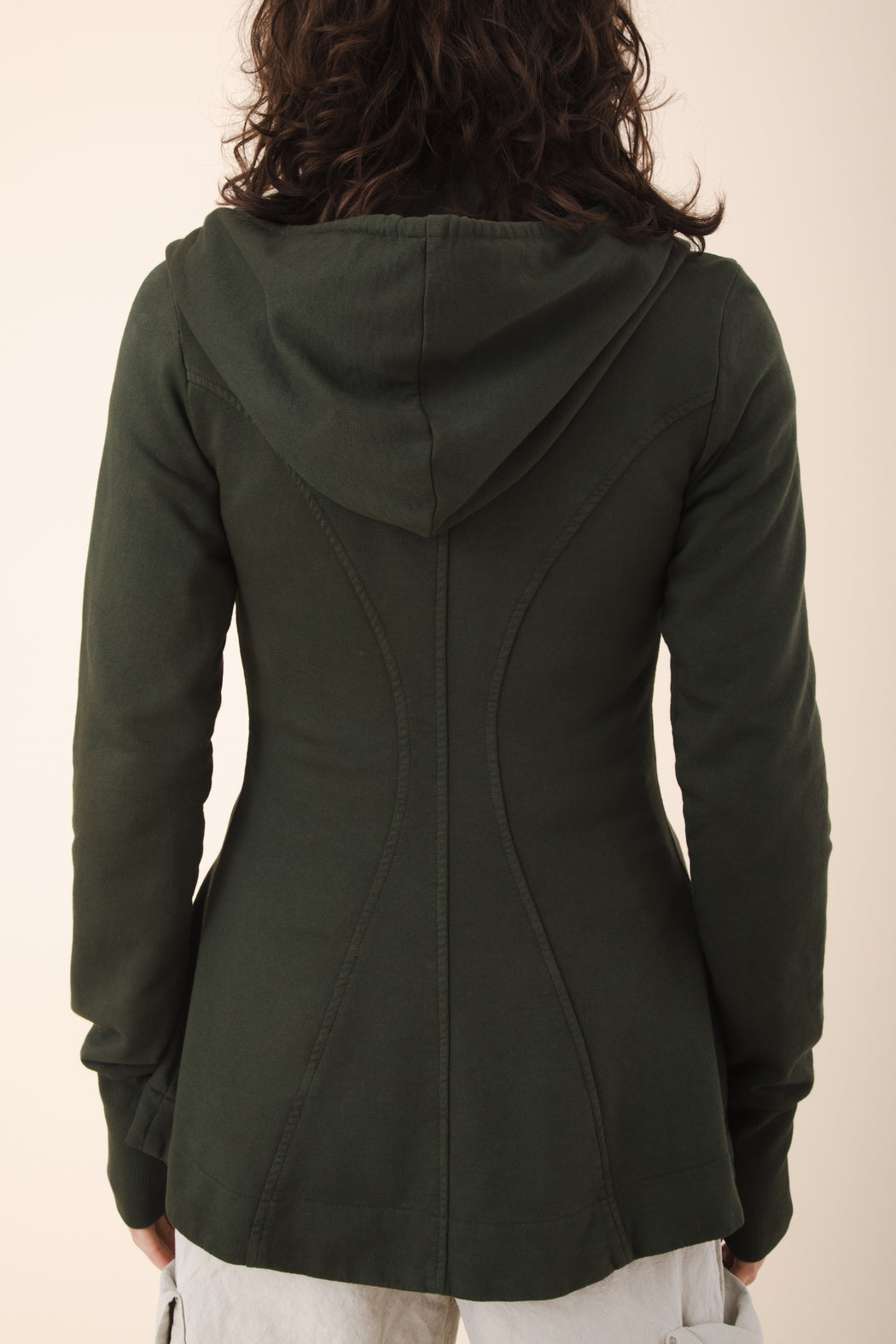 Inspired by the art of origami and mid-19th century fashion silhouettes, we interpreted our staple hoodie shape for the current era. Our signature organic cotton French Terry has been folded and topstitched throughout to define a mid-length jacket with a shaped waist and full skirt. A new addition to our time-honored tradition of non-traditional hoodies.