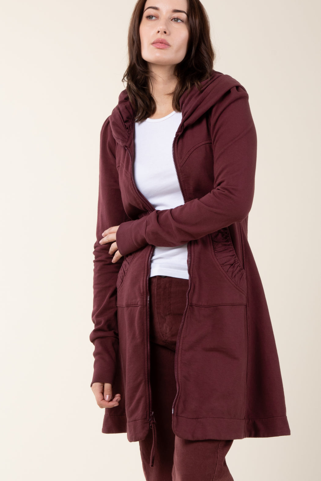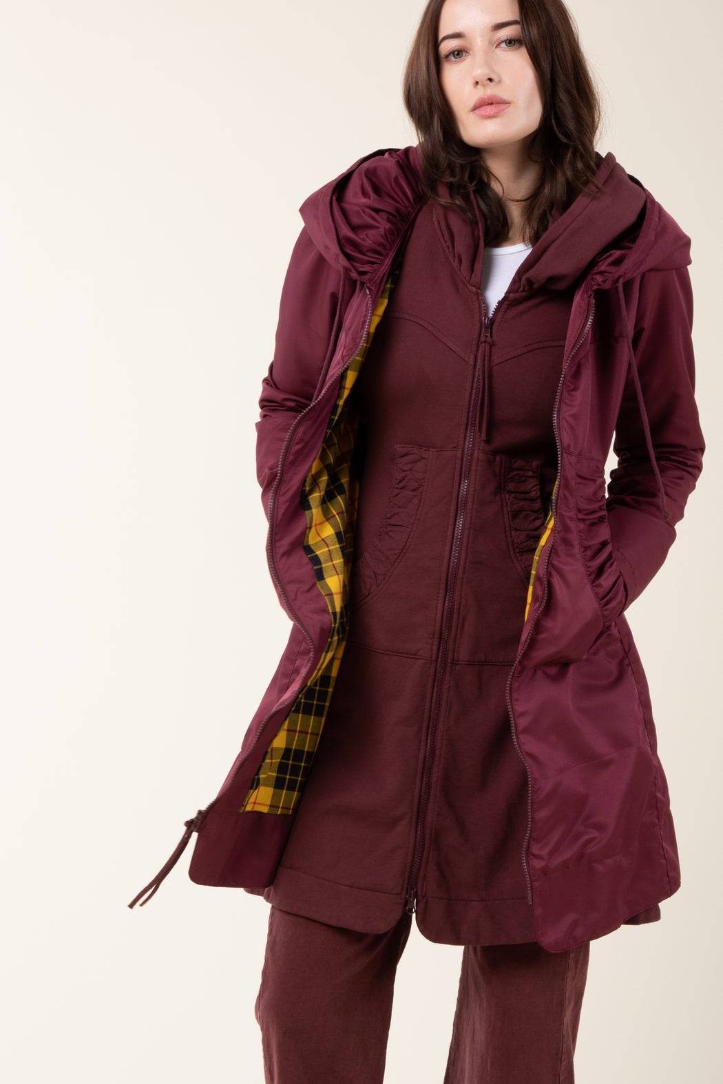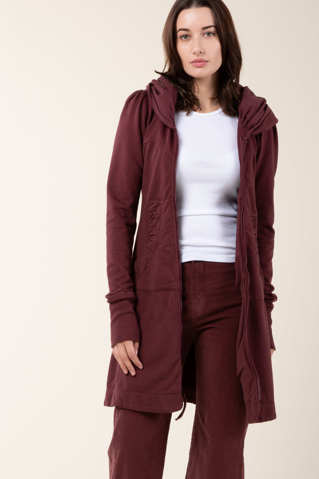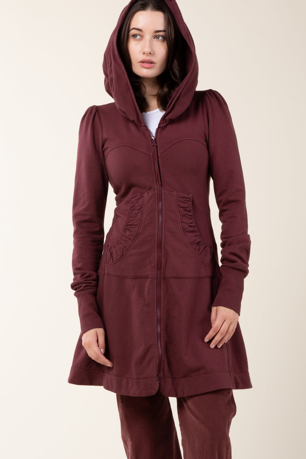 A Prairie Underground classic first introduced in 2006 and one of our longest-running styles. Dramatic fit and flare shaping with seamless sides and back belt inset. Ultra femme design lines and pockets embellished with gathered muslin insets are balanced by extra-long sleeves that can be gathered along the arm, or worn over the hand in cooler climes. When unzipped the hood may be draped over the shoulder.