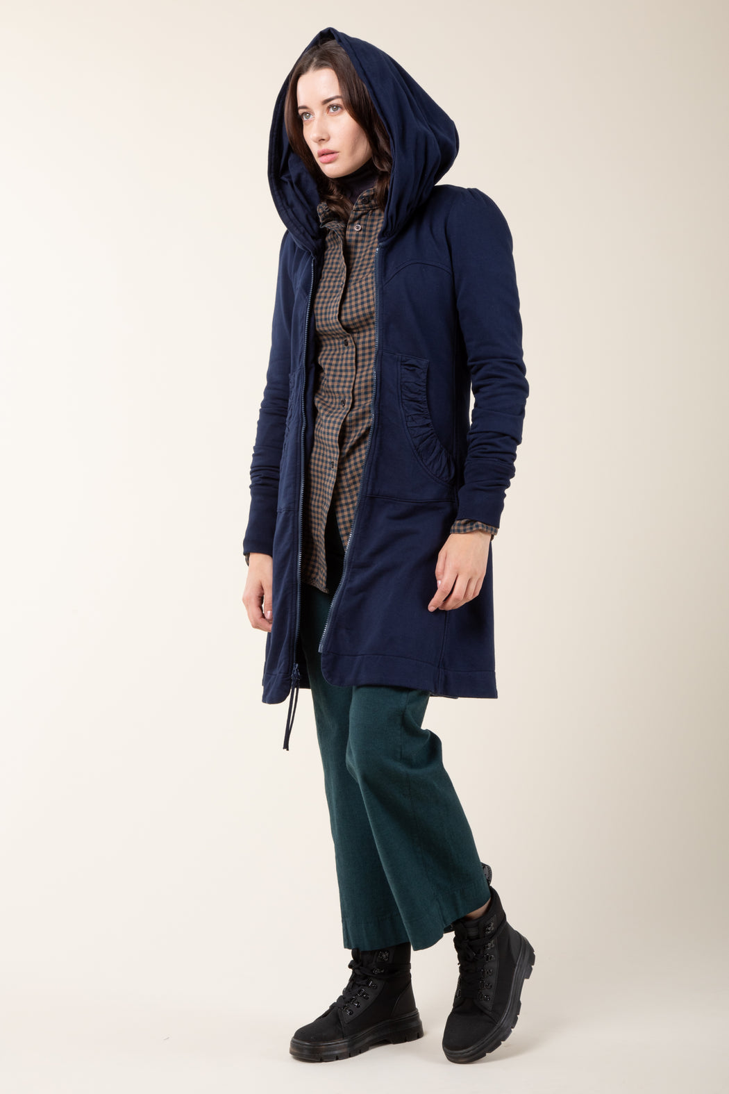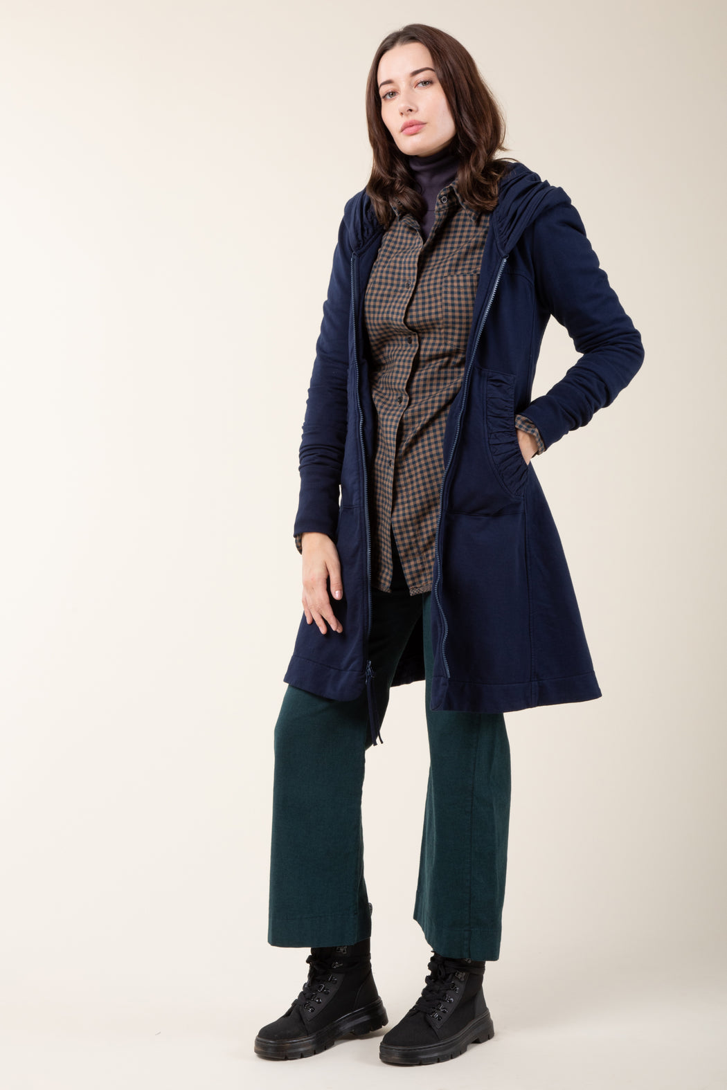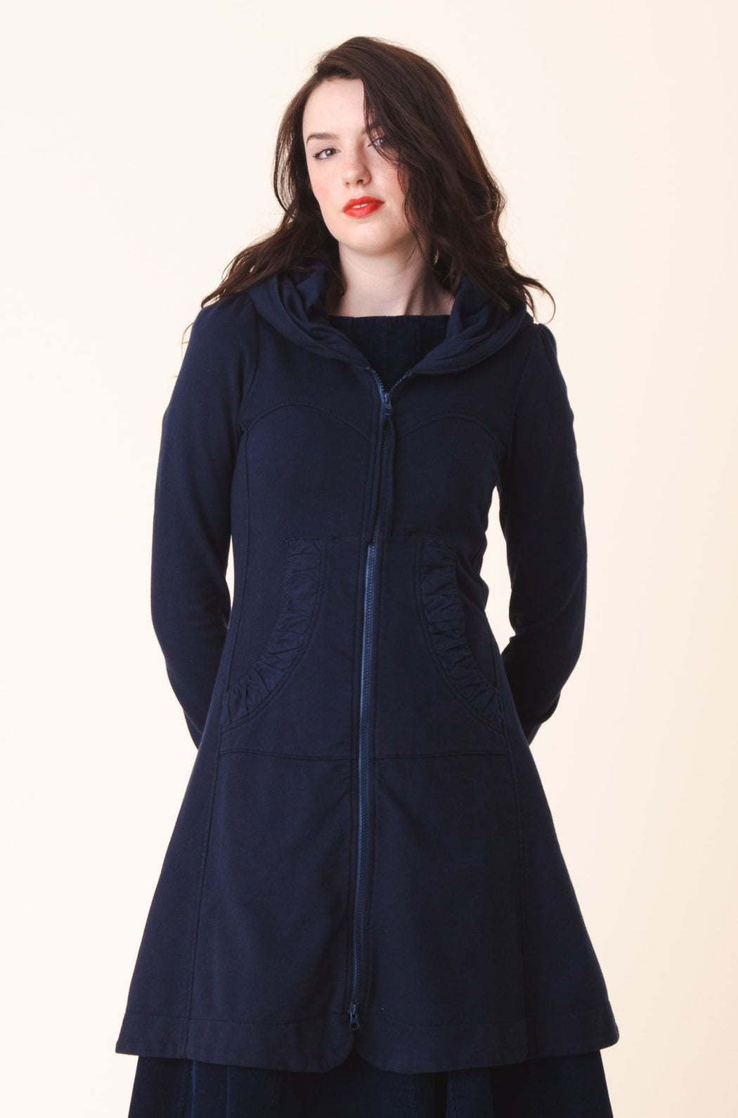 A Prairie Underground classic first introduced in 2006 and one of our longest-running styles. Dramatic fit and flare shaping with seamless sides and back belt inset. Ultra femme design lines and pockets embellished with gathered muslin insets are balanced by extra-long sleeves that can be gathered along the arm, or worn over the hand in cooler climes. When unzipped the hood may be draped over the shoulder.