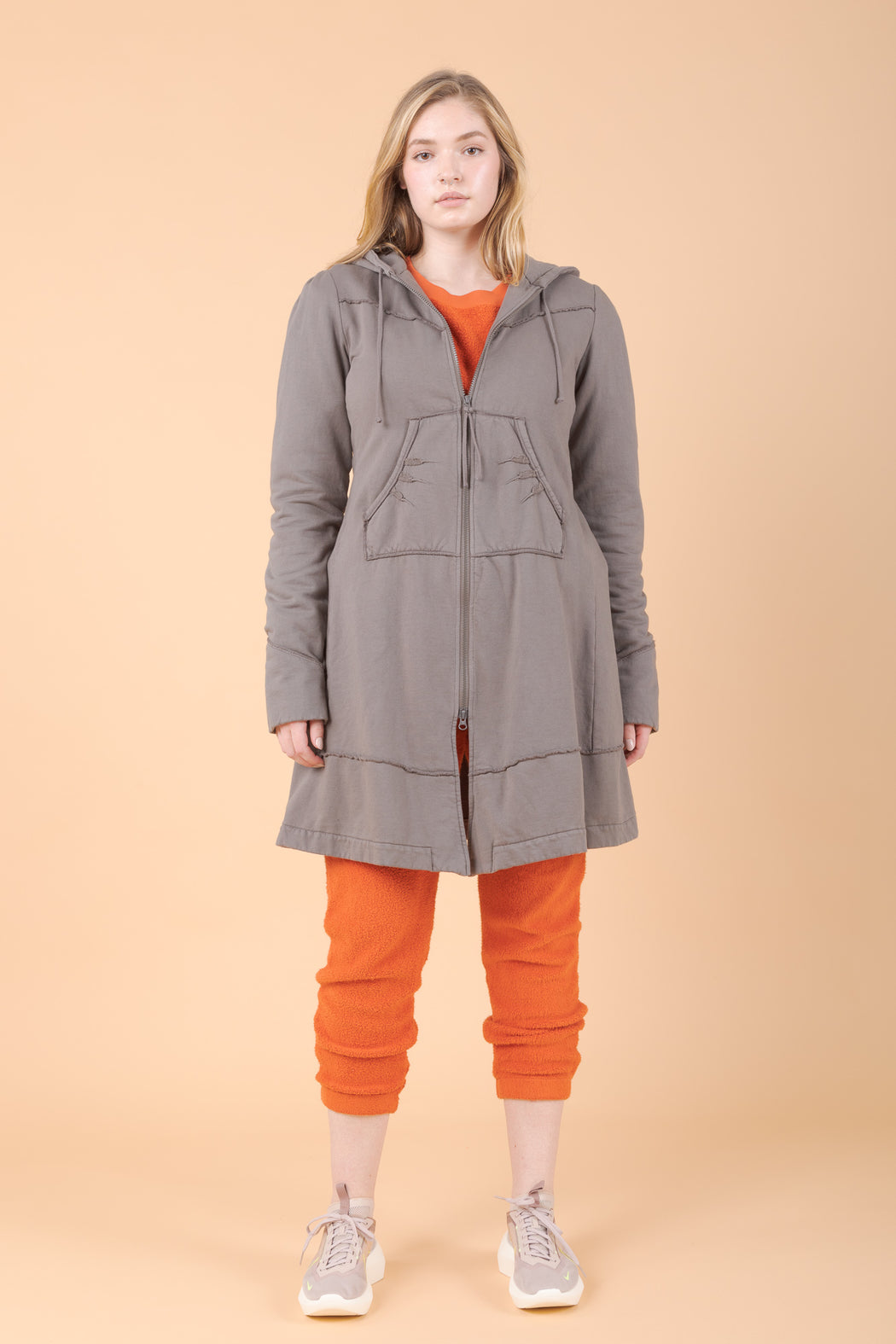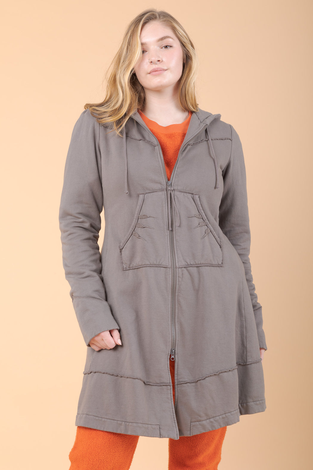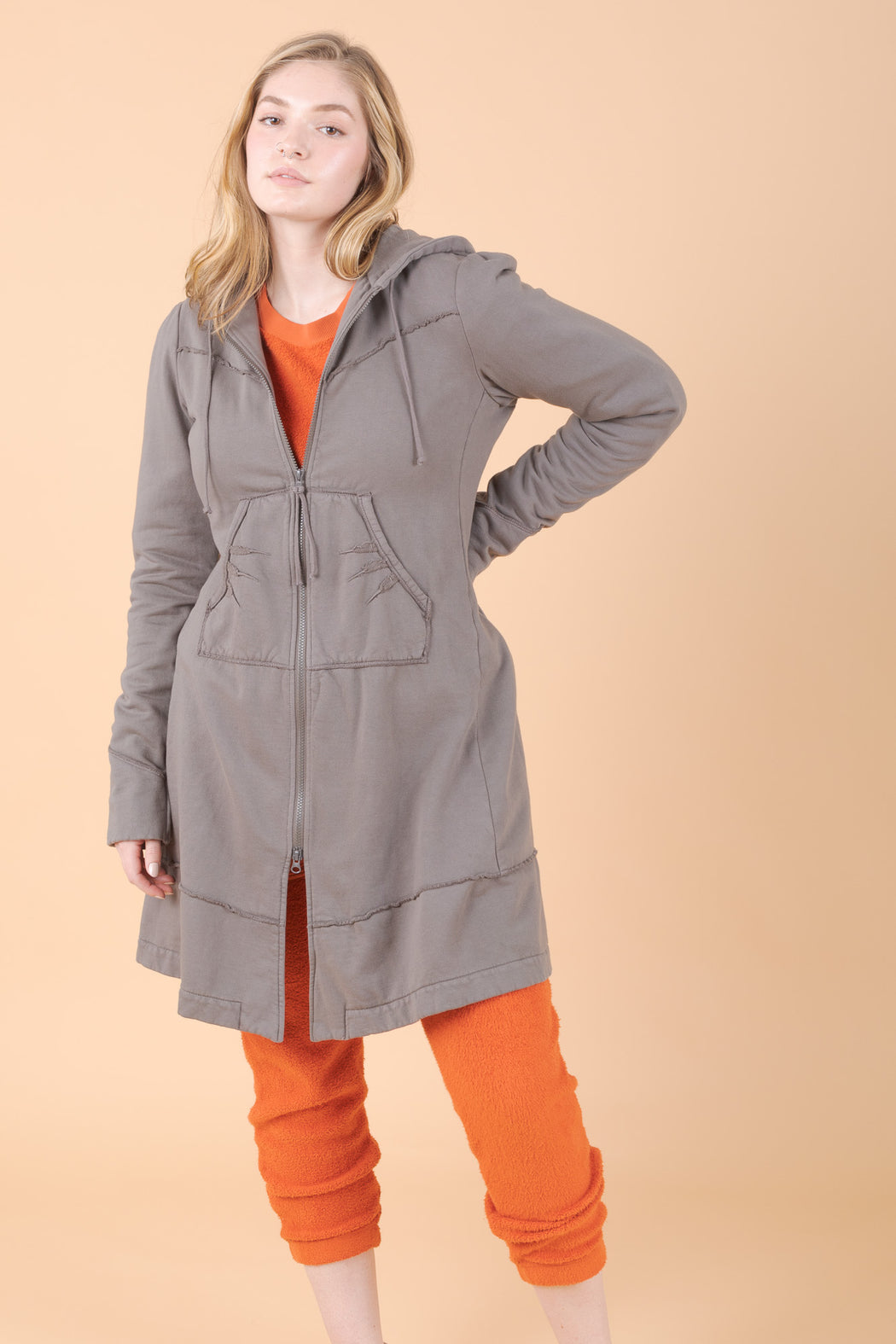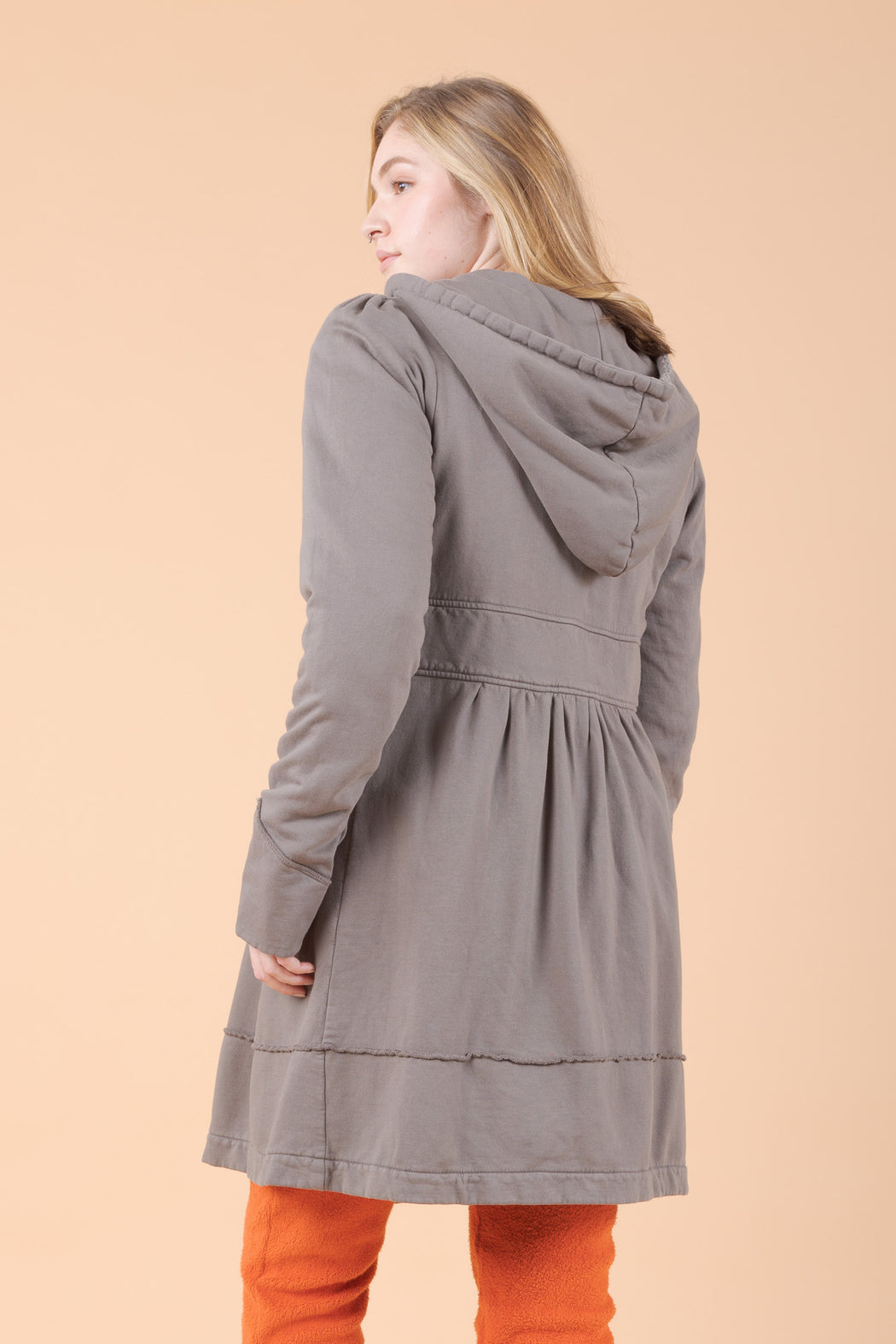 Our Prairie Hoodie in Dior Gray is a web exclusive style originally designed with our Fall 2005 collection. This sustainable style is recreated once a year as a website exclusive. This eponymous organic cotton hoodie has a fit and flare silhouette with exposed serge seaming on the bodice, cuffs, and hem.