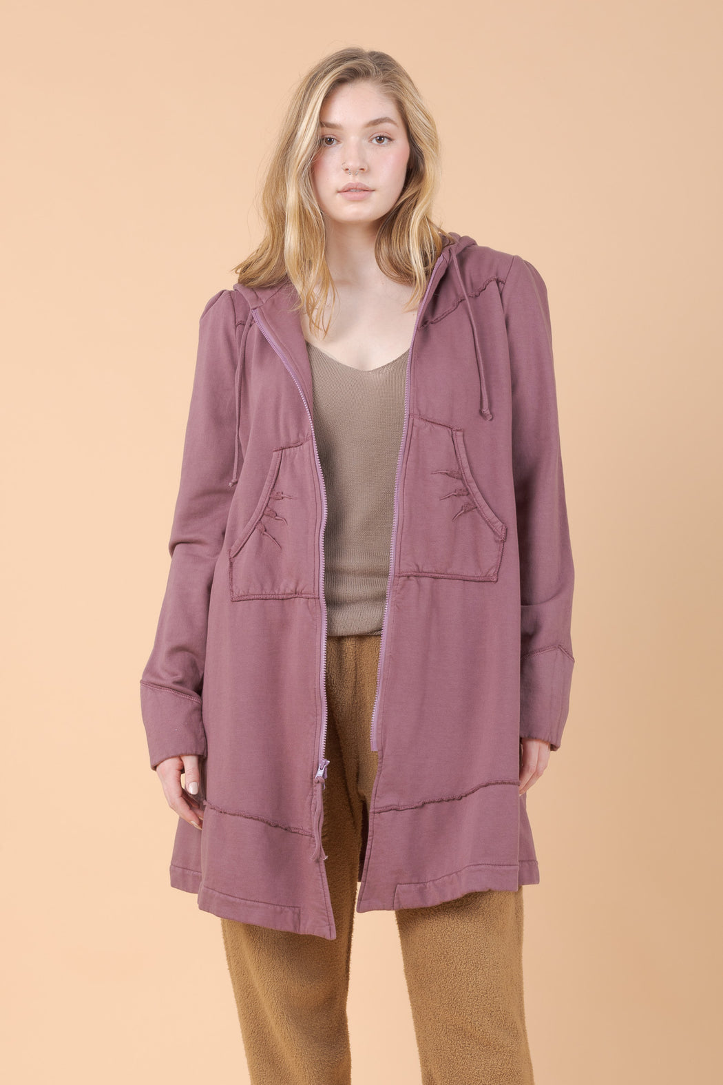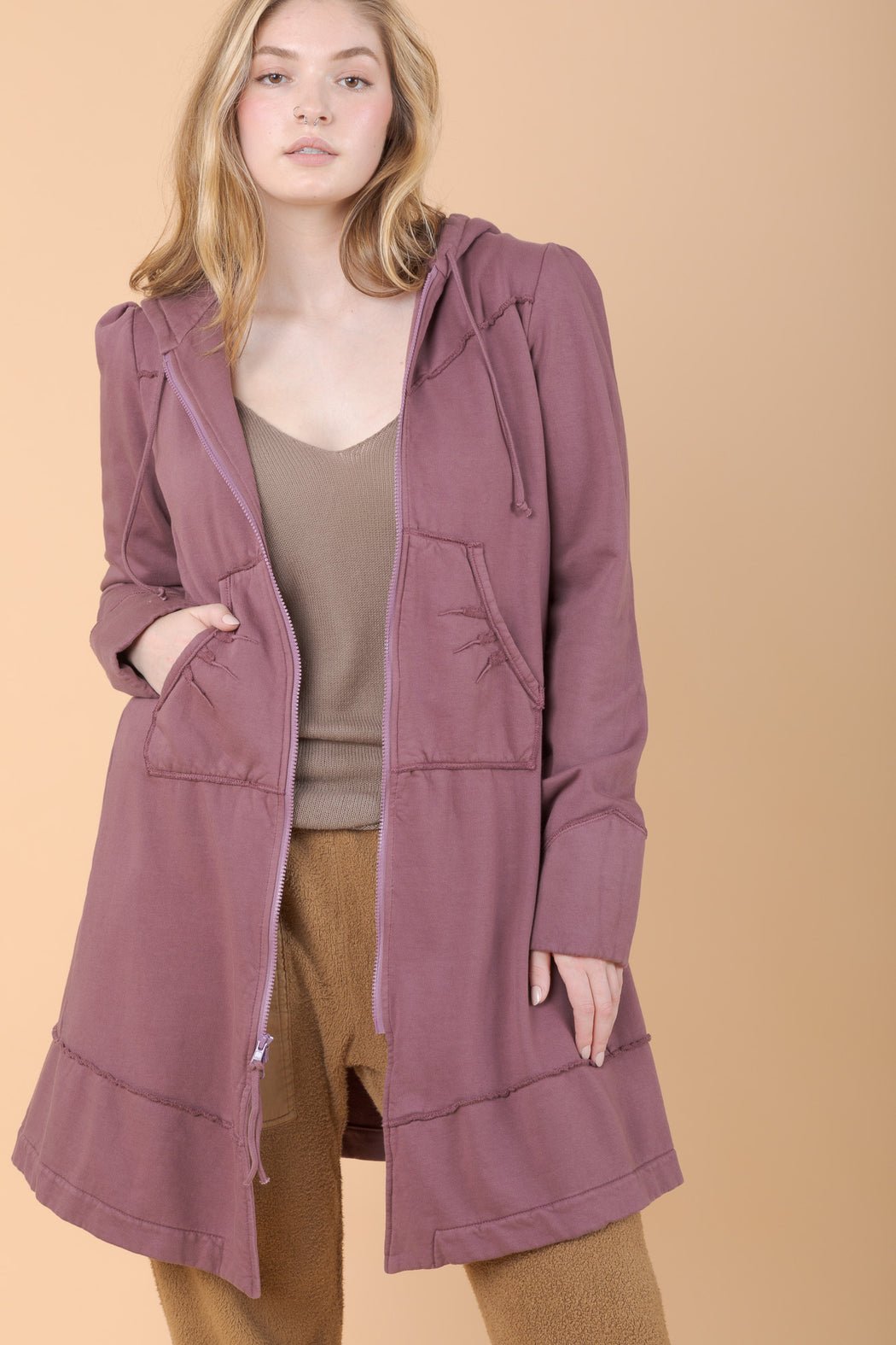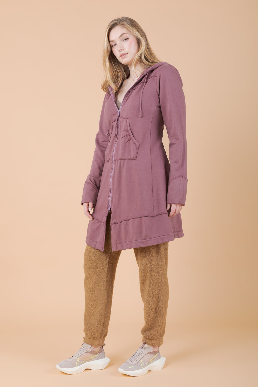 Our Prairie Hoodie in Plum is a web exclusive style originally designed with our Fall 2005 collection. This sustainable style is recreated once a year as a website exclusive. This eponymous organic cotton hoodie has a fit and flare silhouette with exposed serge seaming on the bodice, cuffs, and hem.