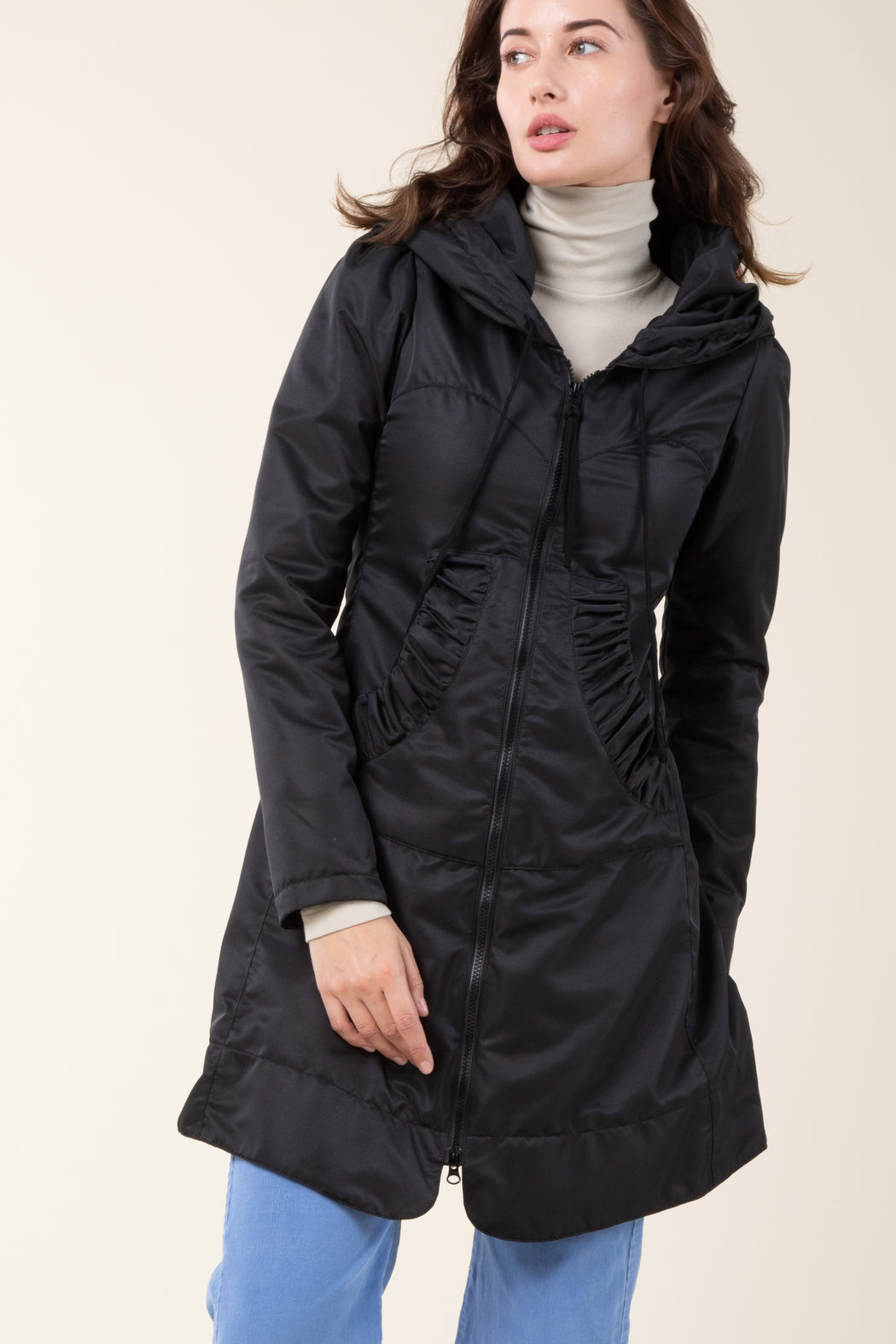 Our best-selling Long Cloak Hoodie was reinvented as a Victorian-style Raincoat with an exaggerated hood and soft cotton lining. A water-resistant raincoat perfect for light showers and windy afternoons. Cut, sewn, and finished where we live in Seattle. Our collection directly supports manufacturing in the United States.