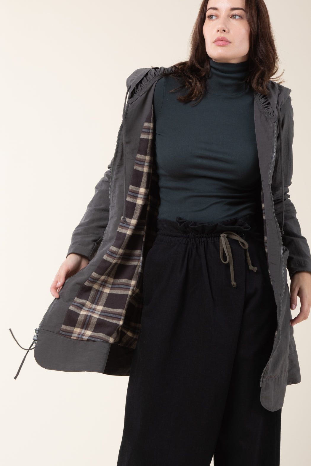 Long Raincloak in Charcoal with Brown Plaid