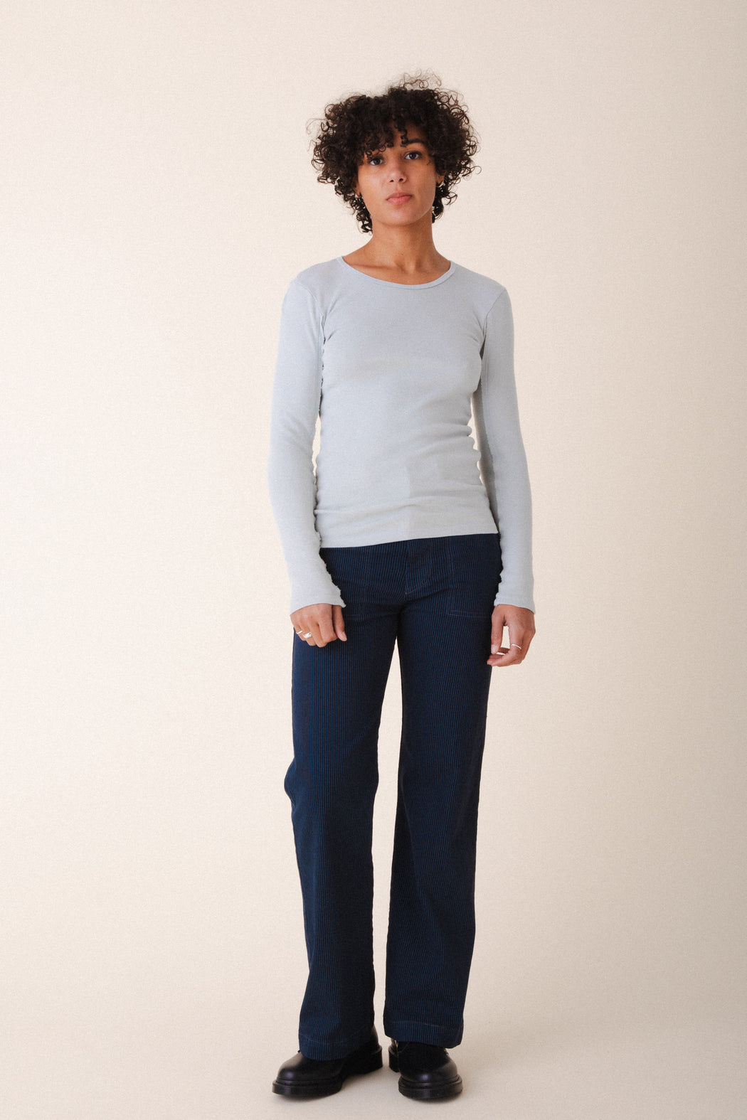 A classic crew constructed in our soft, thick, interlock knit (think baby clothes). This tailored tee was designed with a nod to y2k fashion with an exposed seaming on the sleeve. The elegant neckline and body-skimming shape allow it to be worn in different ways and different circumstances.