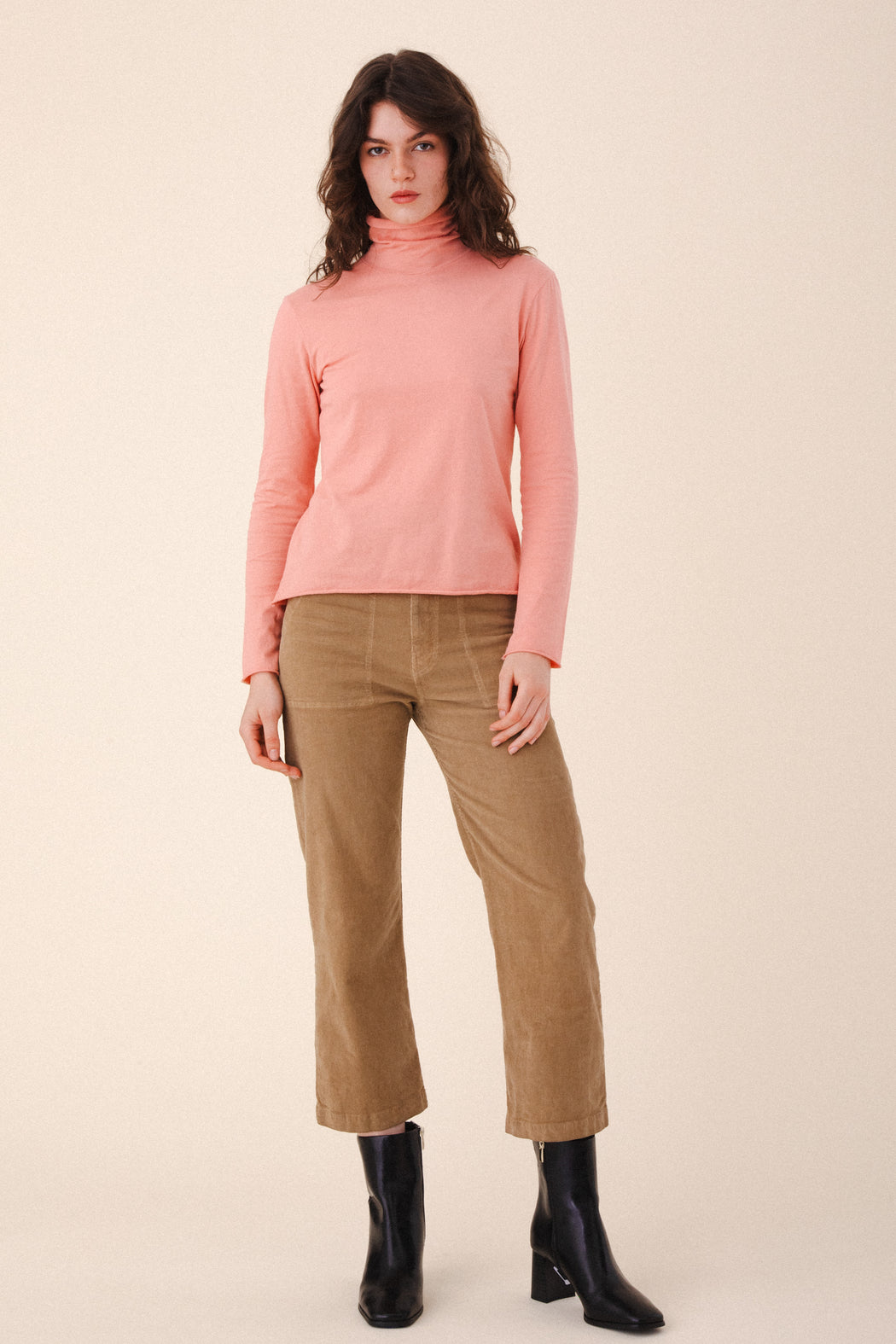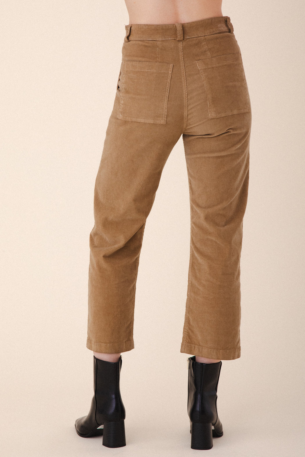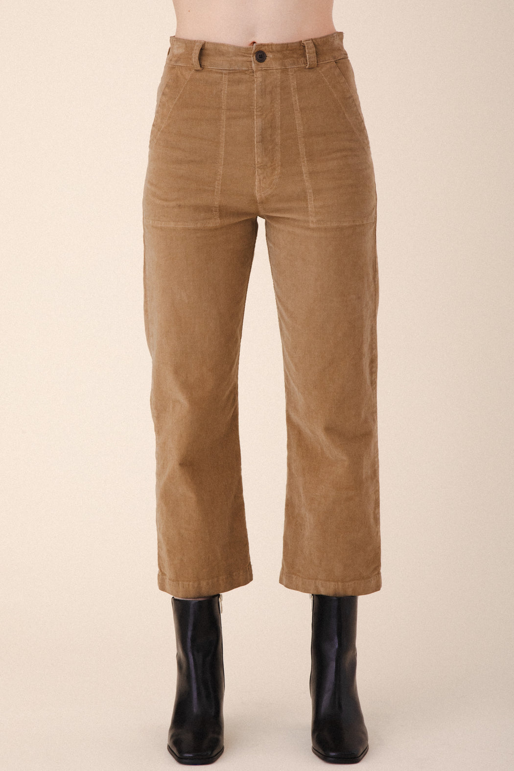 Timeless and sustainable, these straight-leg corduroy trousers are made from rich, textured deadstock cotton with a touch of spandex for just the right amount of stretch. Designed with a super high-rise fit, they feature classic front slash pockets, back patch pockets, and a sturdy zipper fly. The slightly cropped 26" inseam pairs effortlessly with boots or sneakers, making them a versatile staple for all heights. Soft, structured, and endlessly wearable—this is corduroy, elevated.