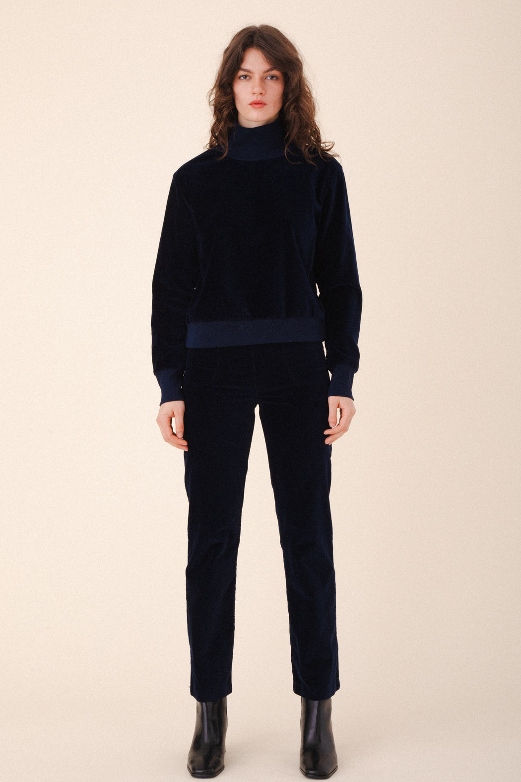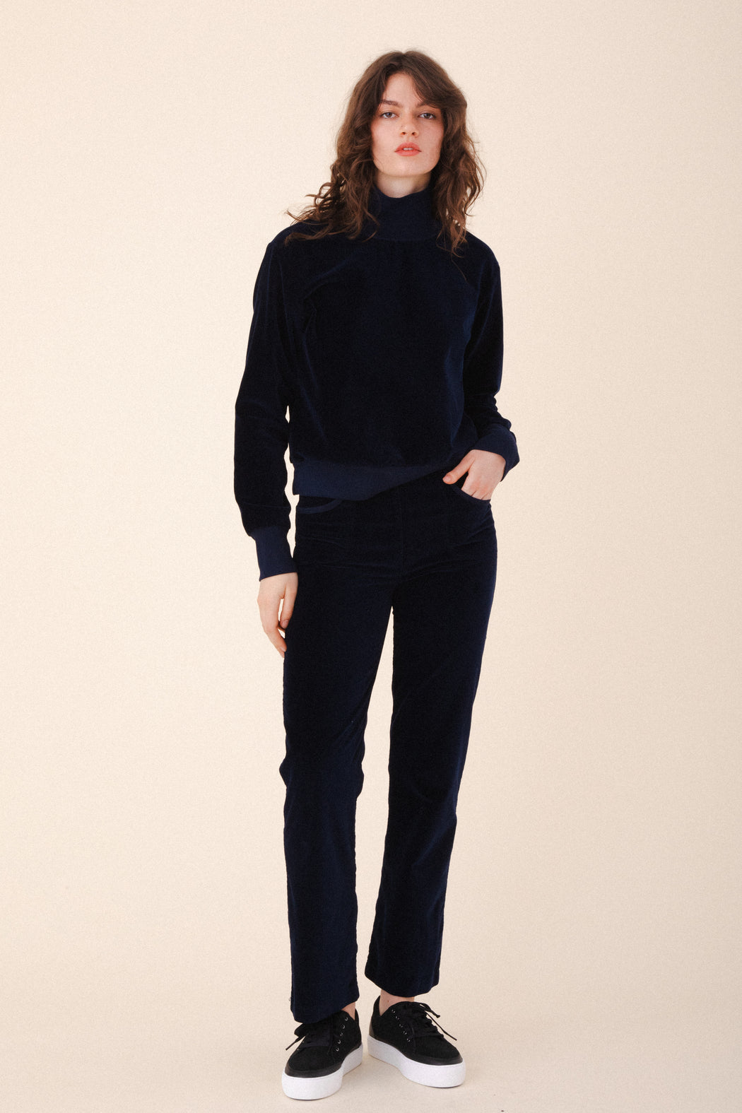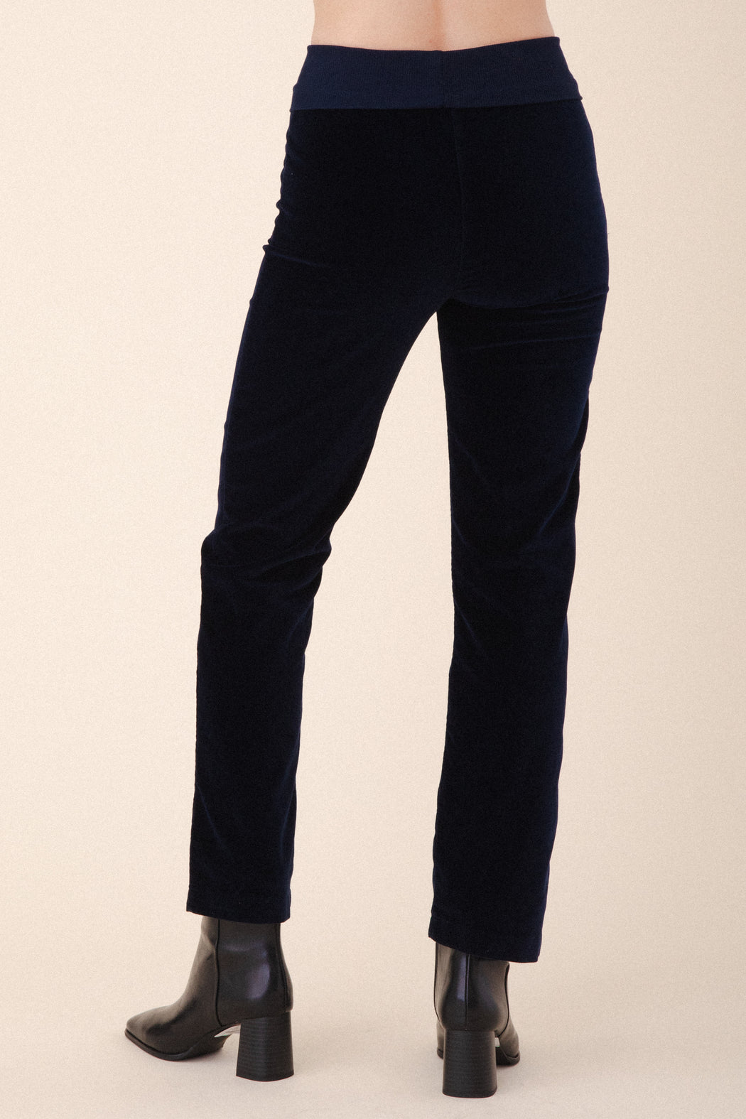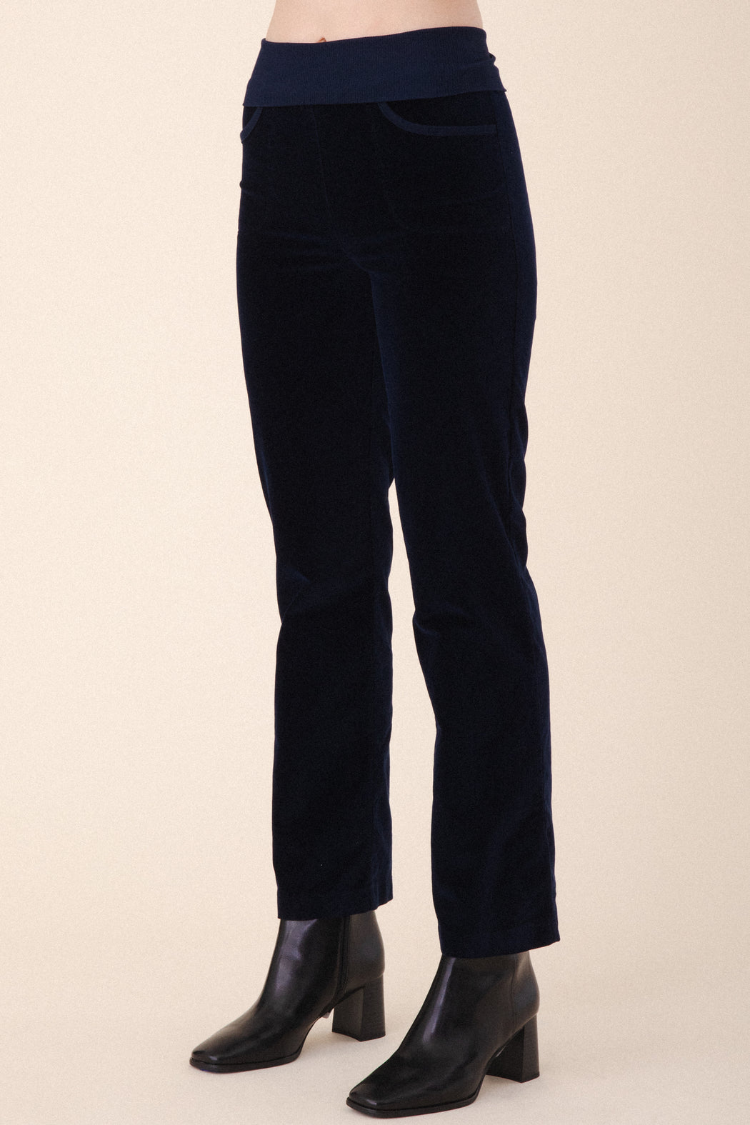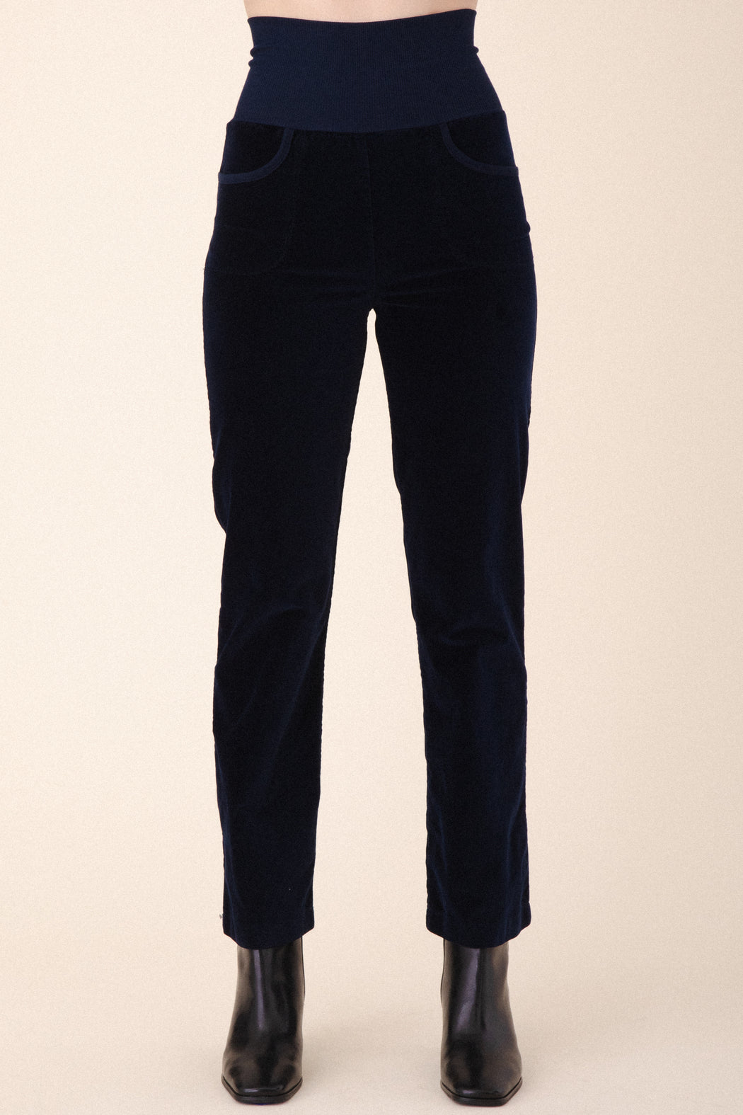 The Easy Street pants are an ode to relaxed ambition. Pull-on trousers with a soft rib waistband, duel front pockets and clean, tapered lines. Comfort-forward with a tailored twist in luxurious cotton/spandex velvet, the Easy Streets can be dressed up or dressed down. Straight leg from knee.