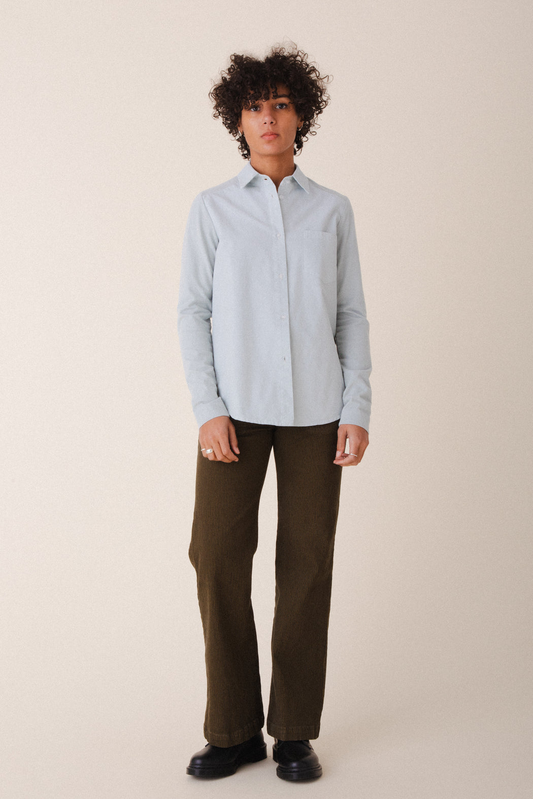 Our high-rise utility favorite has been interpreted as a full-length pant. This heavyweight stretch textile retains its shape while conforming to your body. Incredibly comfortable and industrious. This mostly fitted leg straightens below the knee. These pants are pre-shrunk and will retain their shape.