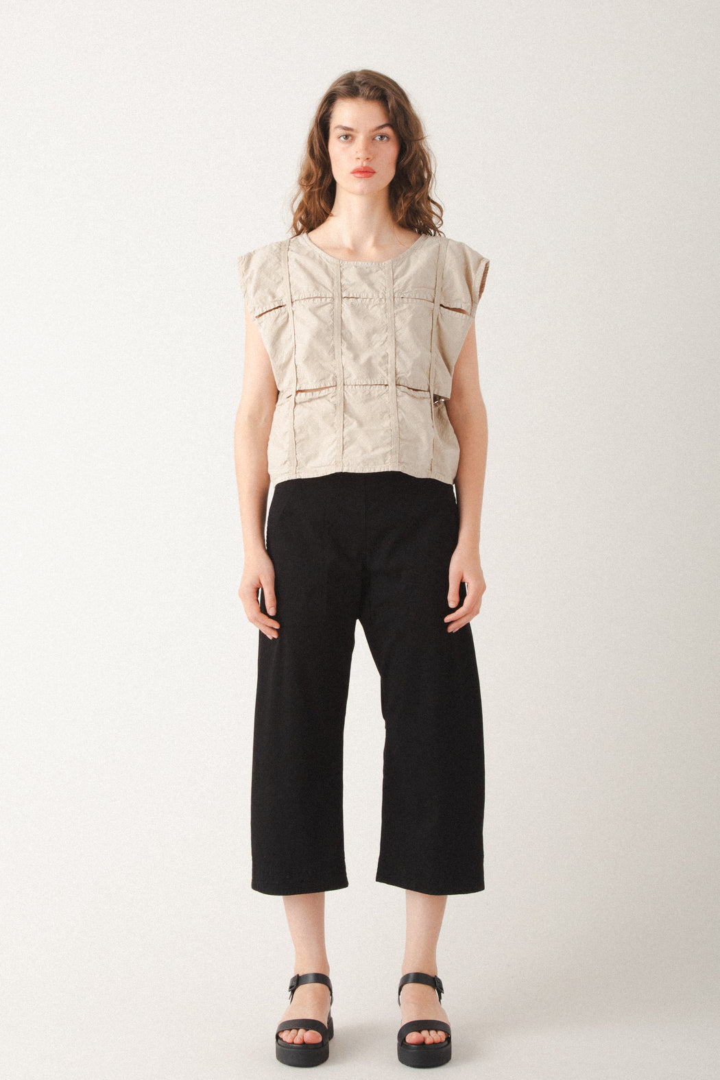 Inspired by martial arts uniforms, the Metric Pant is designed for freedom of movement and sharp architectural style. Quilted panels at the hem add structure and shape, while a diamond-shaped rise inset allows for fluid motion. A side zip and applied slash pockets create a clean, flat front—ideal for layering or tucking in tops. Crafted from cotton-spandex twill, this modernized exercise trouser brings comfort and stretch to a historically inspired silhouette.