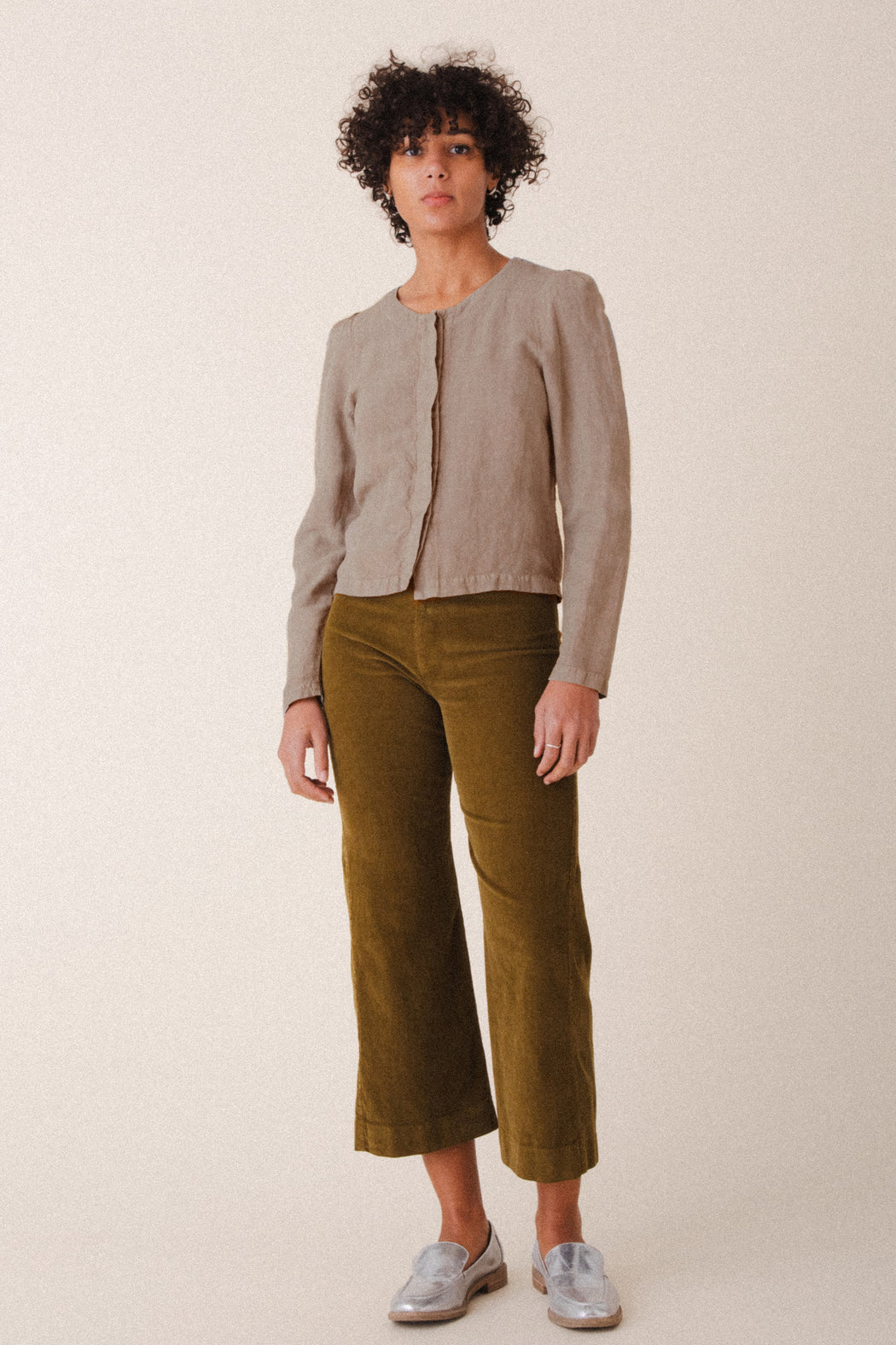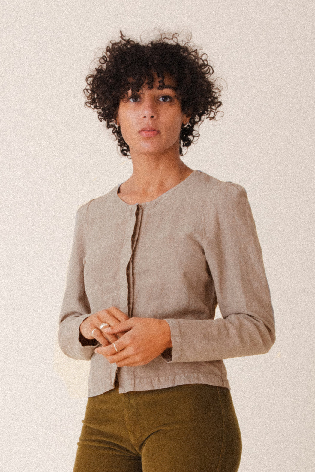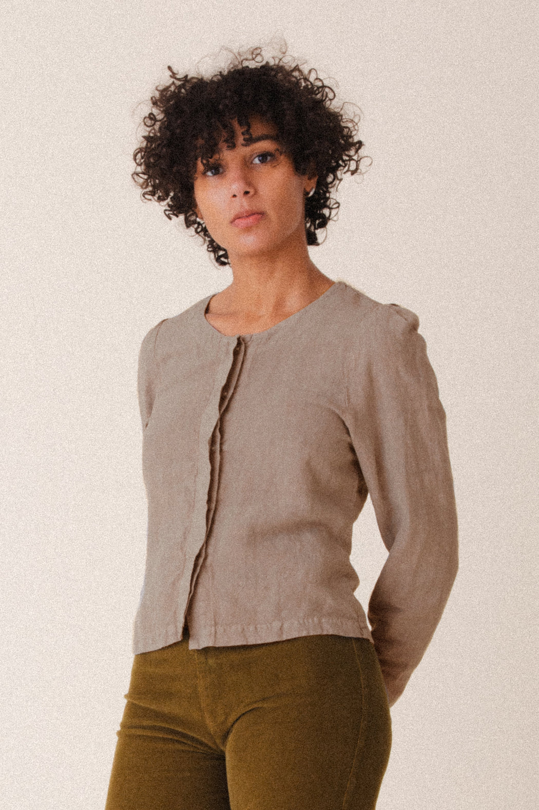 A return to historic designs of early American dress is not always traditional. The observation of a particular form can foster new directions. A tailored blouse with a covered button placket, high neckline, and a slightly puffed shoulder has always been part of our progressive vision. Constructed in an elegant hemp and silk blend for formal and informal occasions.