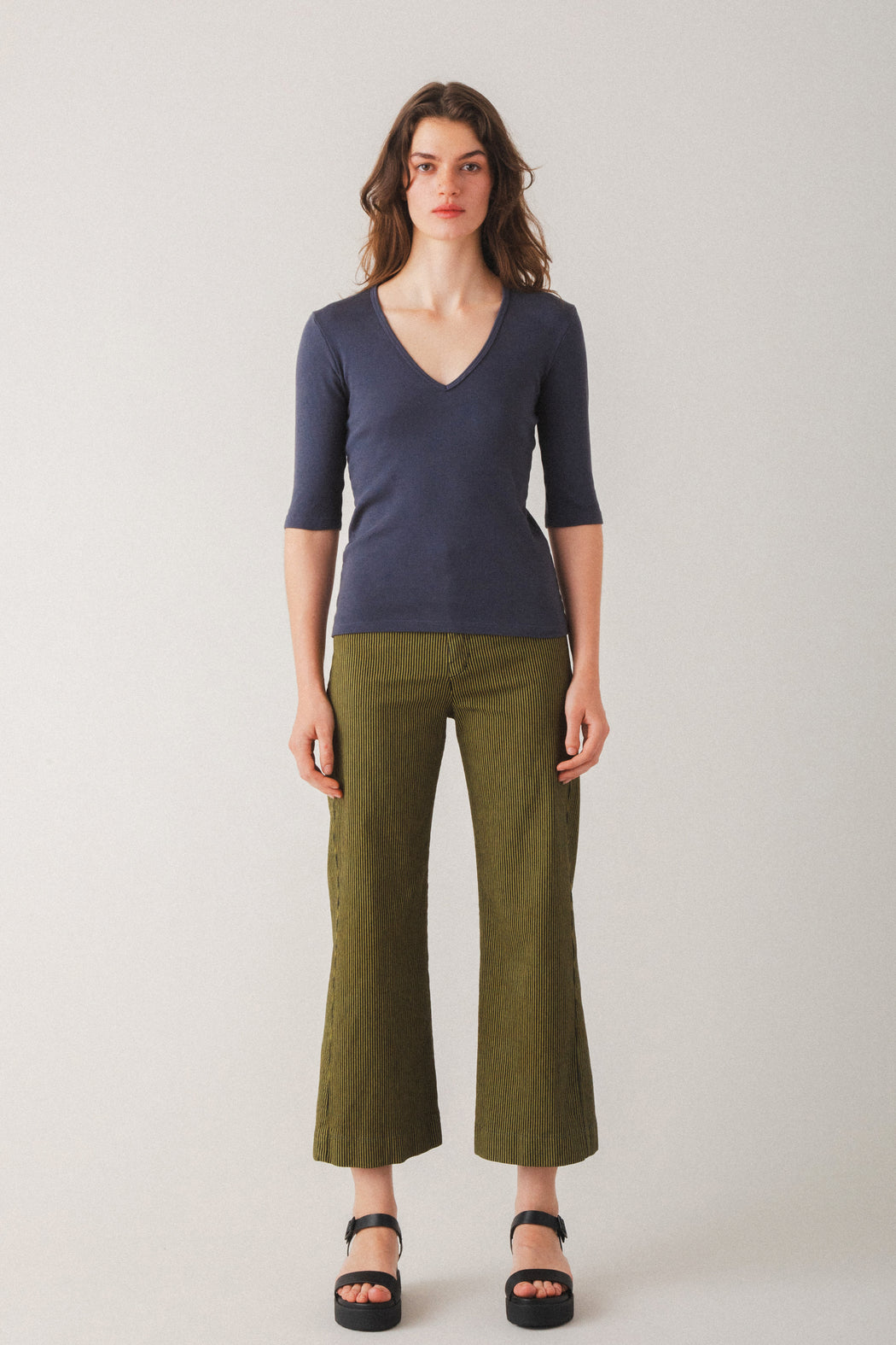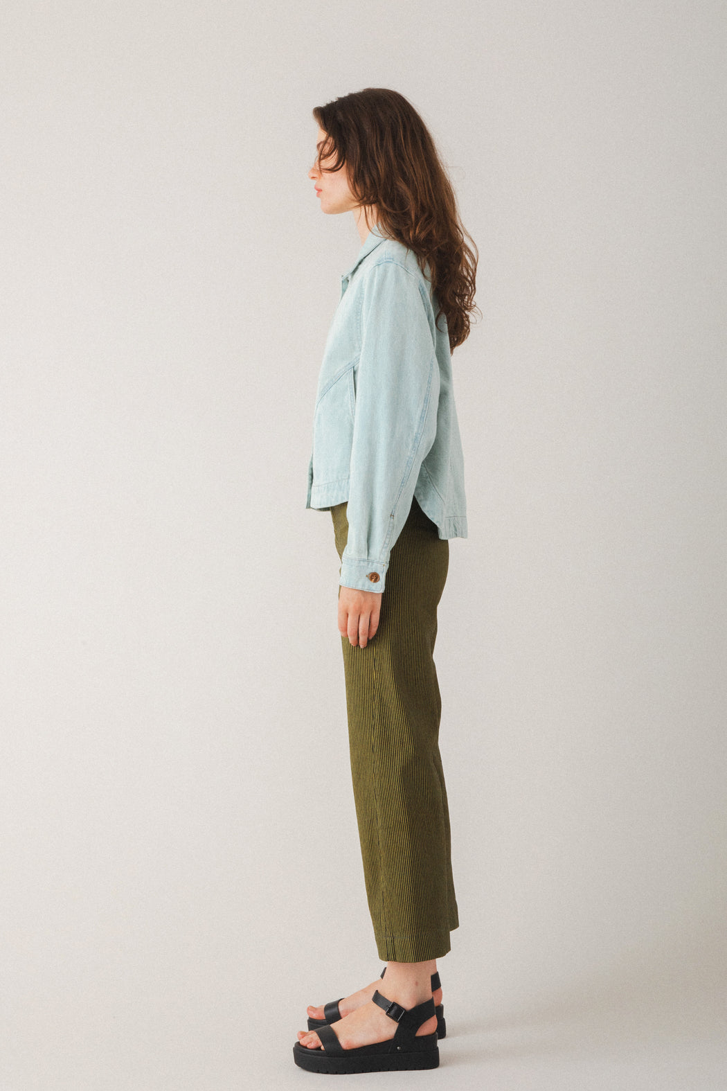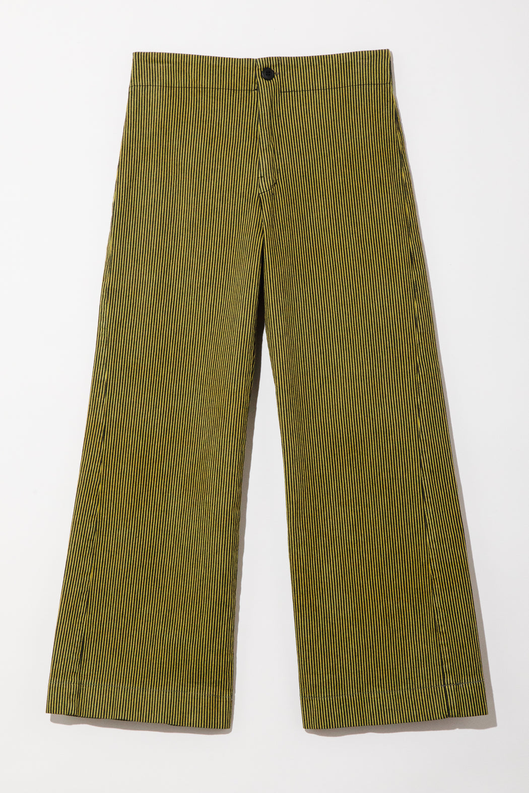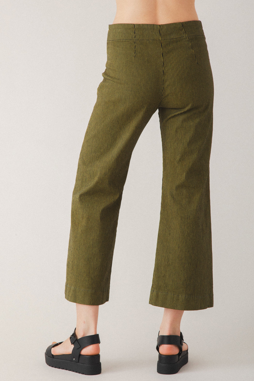 A midweight, railroad striped version of our most popular pant. The Railroad Knack is a sleek mid-rise, cropped flare made with a striped stretch twill that conforms to your body. Casual and classic, with back darts for shaping and no pockets for a minimal look that is ideal for layering. A versatile essential, that works with fitted tops or oversized layers. The modern take on everyday trousers
