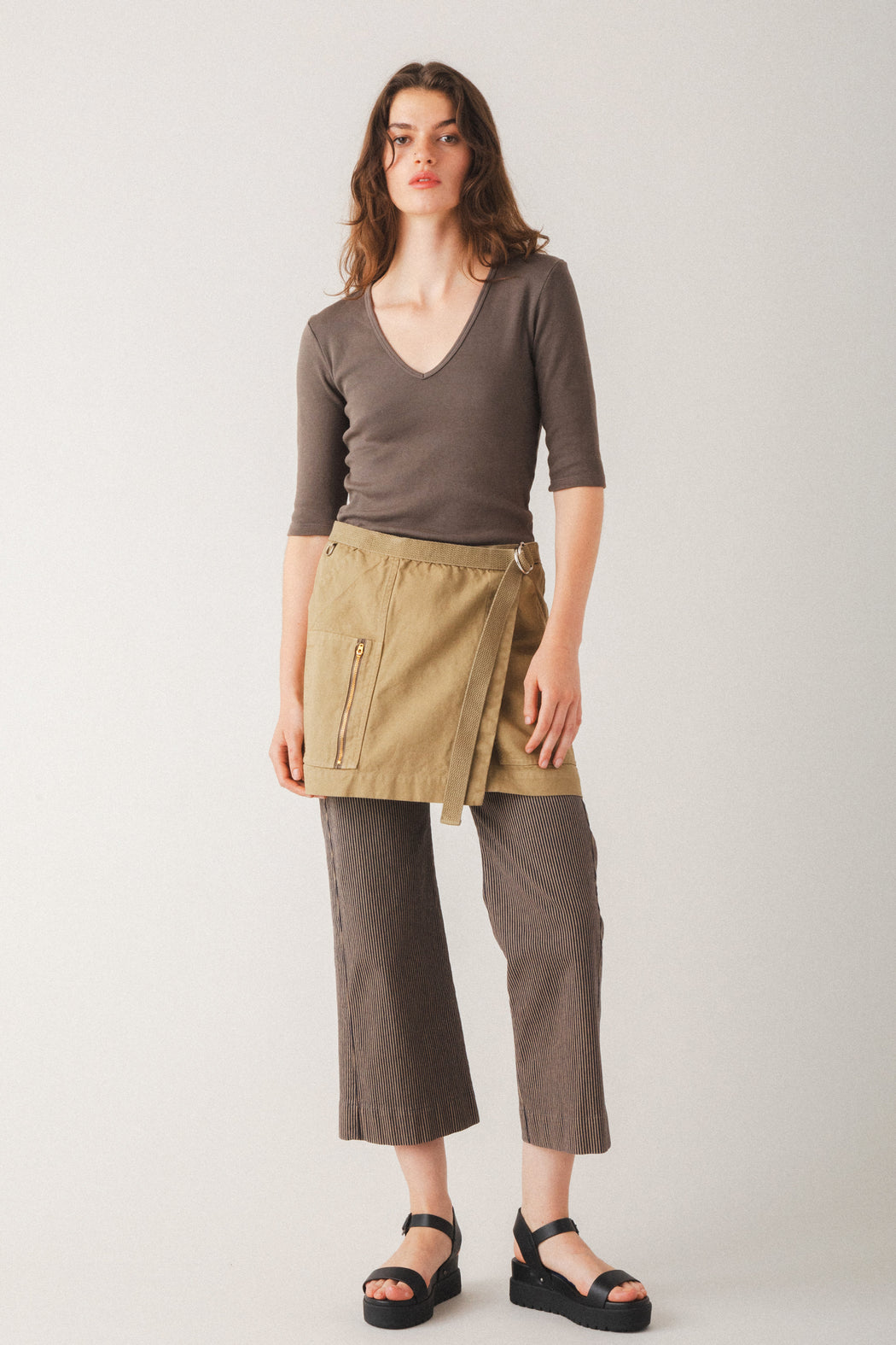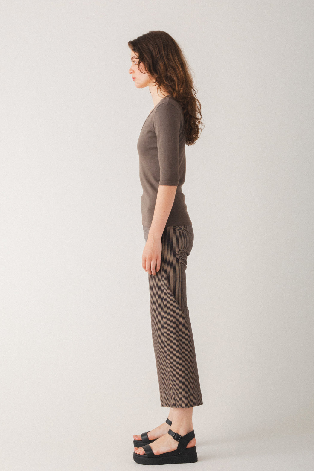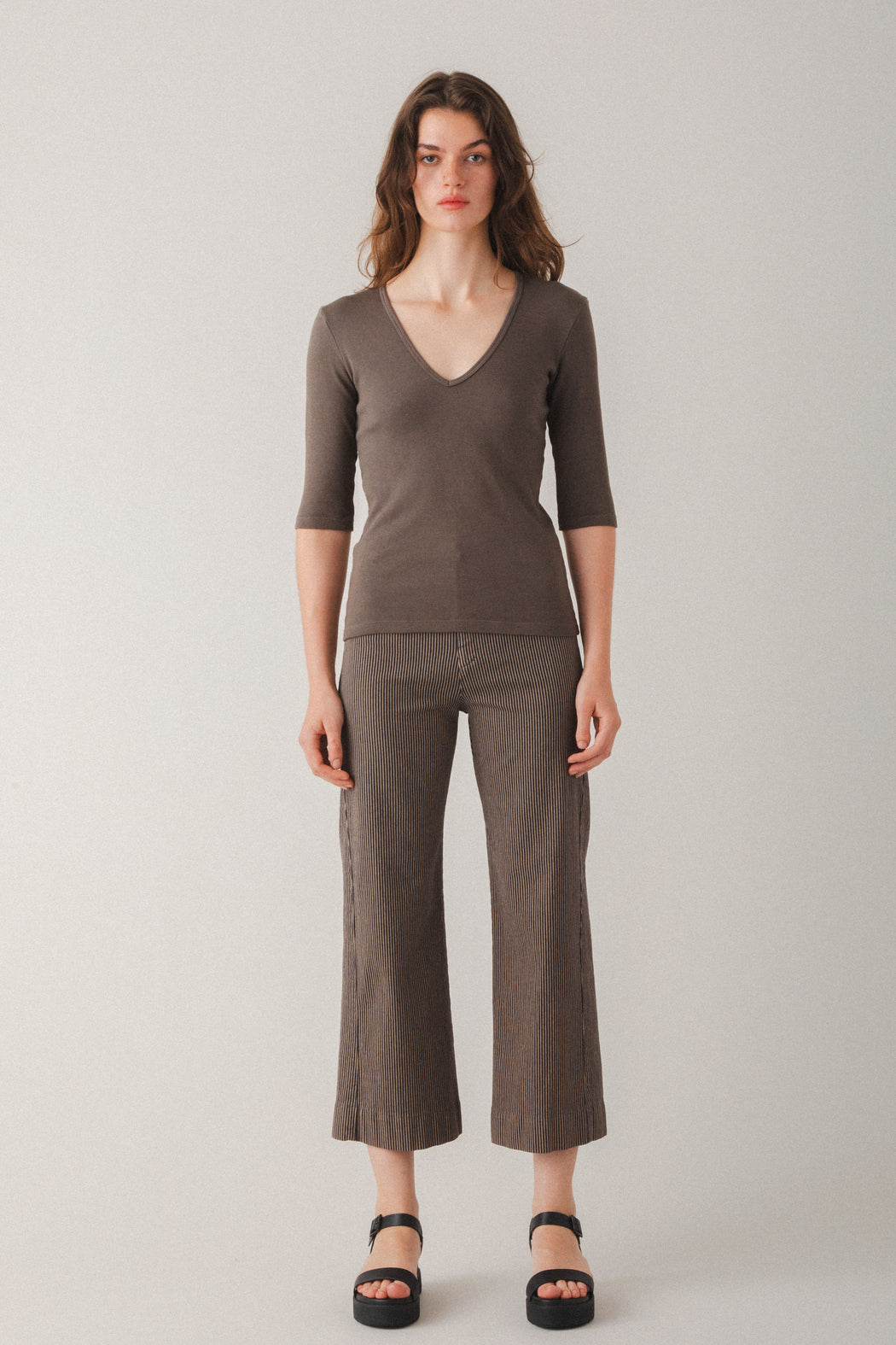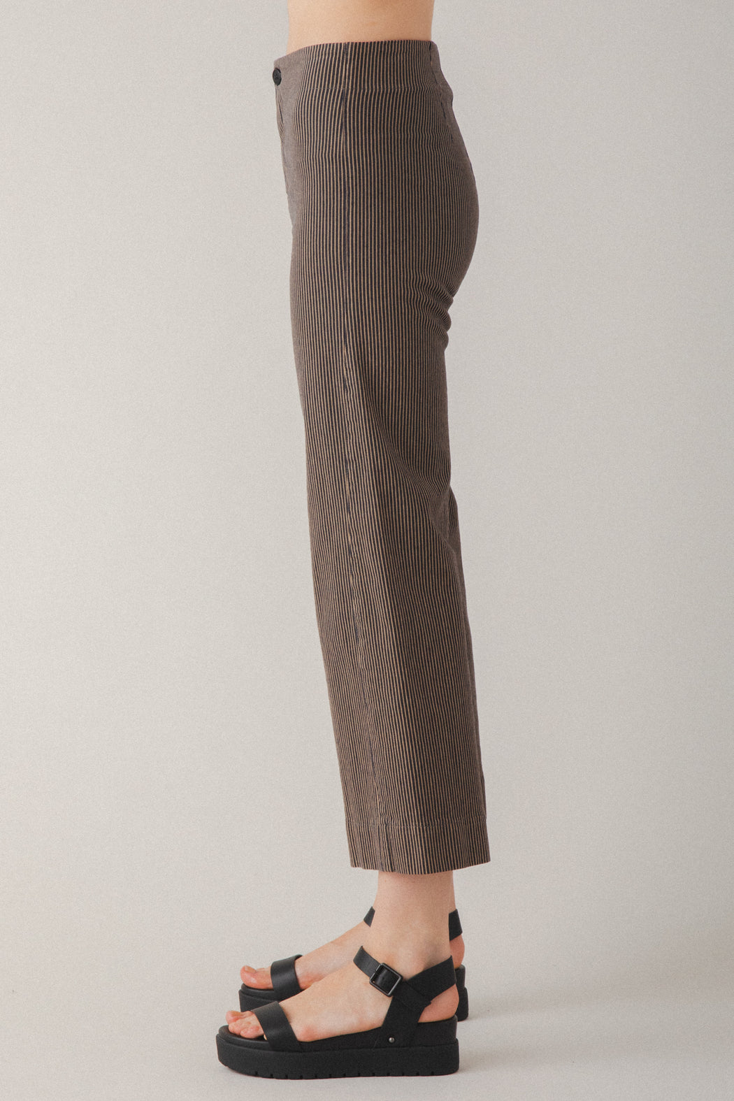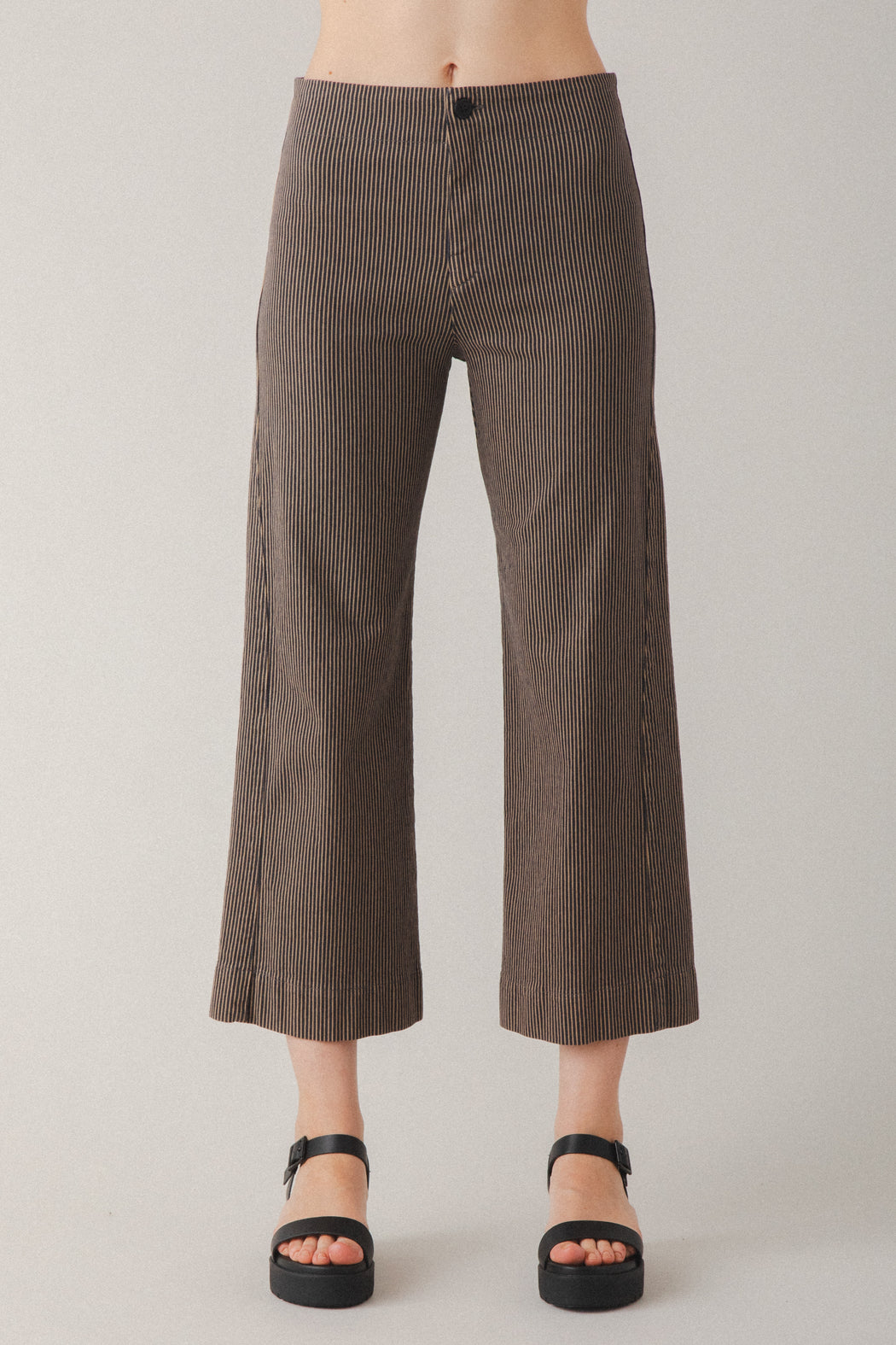 A midweight, railroad striped version of our most popular pant. The Railroad Knack is a sleek mid-rise, cropped flare made with a striped stretch twill that conforms to your body. Casual and classic, with back darts for shaping and no pockets for a minimal look that is ideal for layering. A versatile essential, that works with fitted tops or oversized layers. The modern take on everyday trousers