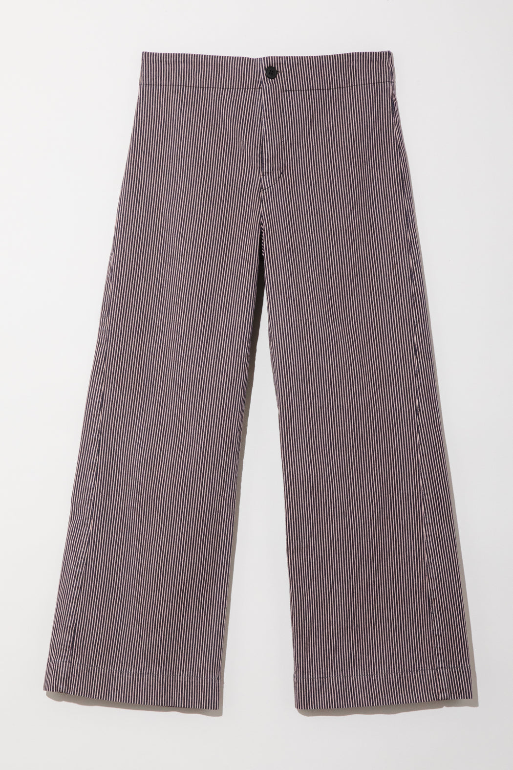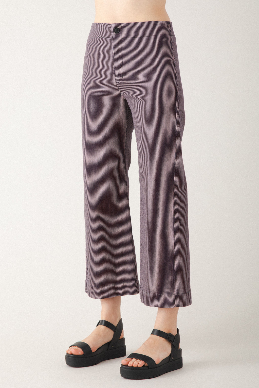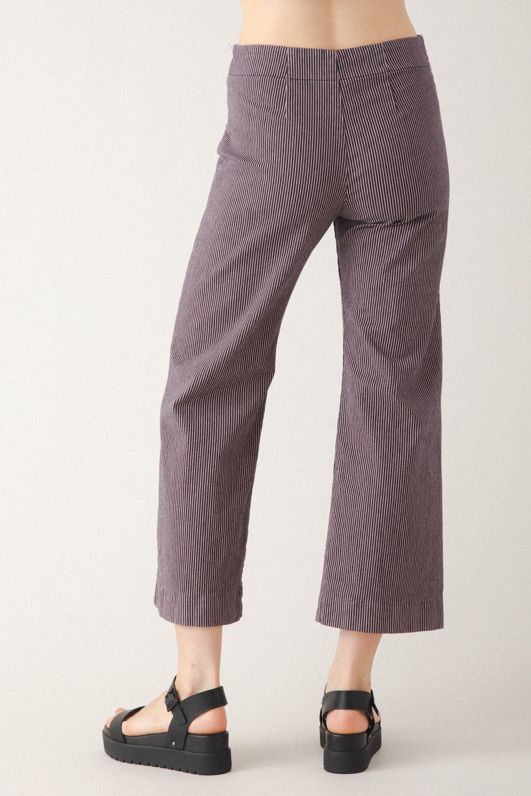 A midweight, railroad striped version of our most popular pant. The Railroad Knack is a sleek mid-rise, cropped flare made with a striped stretch twill that conforms to your body. Casual and classic, with back darts for shaping and no pockets for a minimal look that is ideal for layering. A versatile essential, that works with fitted tops or oversized layers. The modern take on everyday trousers