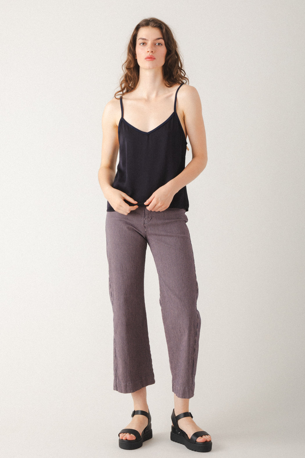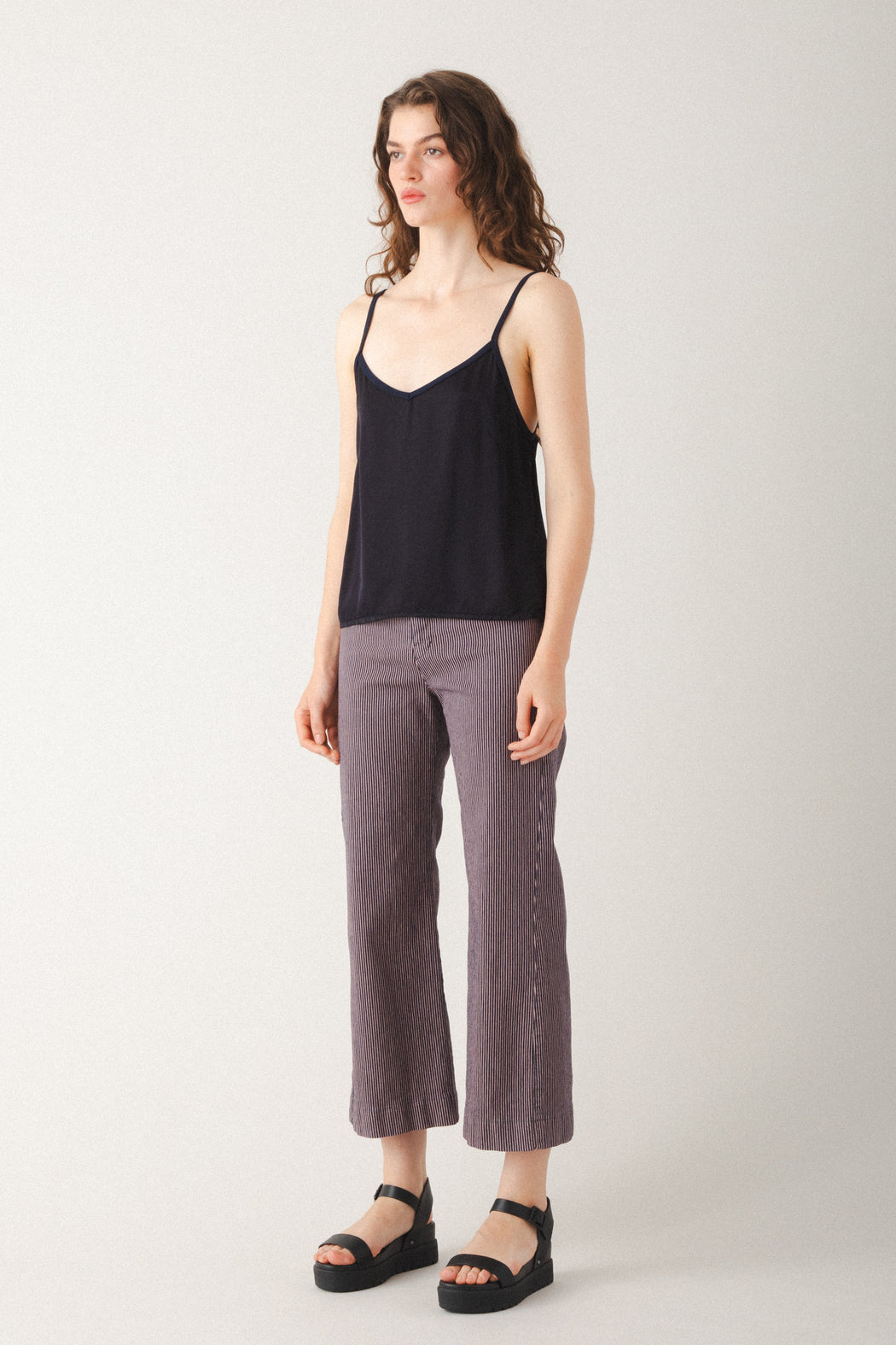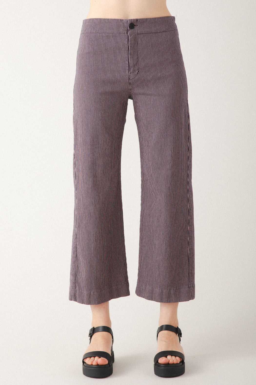 A midweight, railroad striped version of our most popular pant. The Railroad Knack is a sleek mid-rise, cropped flare made with a striped stretch twill that conforms to your body. Casual and classic, with back darts for shaping and no pockets for a minimal look that is ideal for layering. A versatile essential, that works with fitted tops or oversized layers. The modern take on everyday trousers