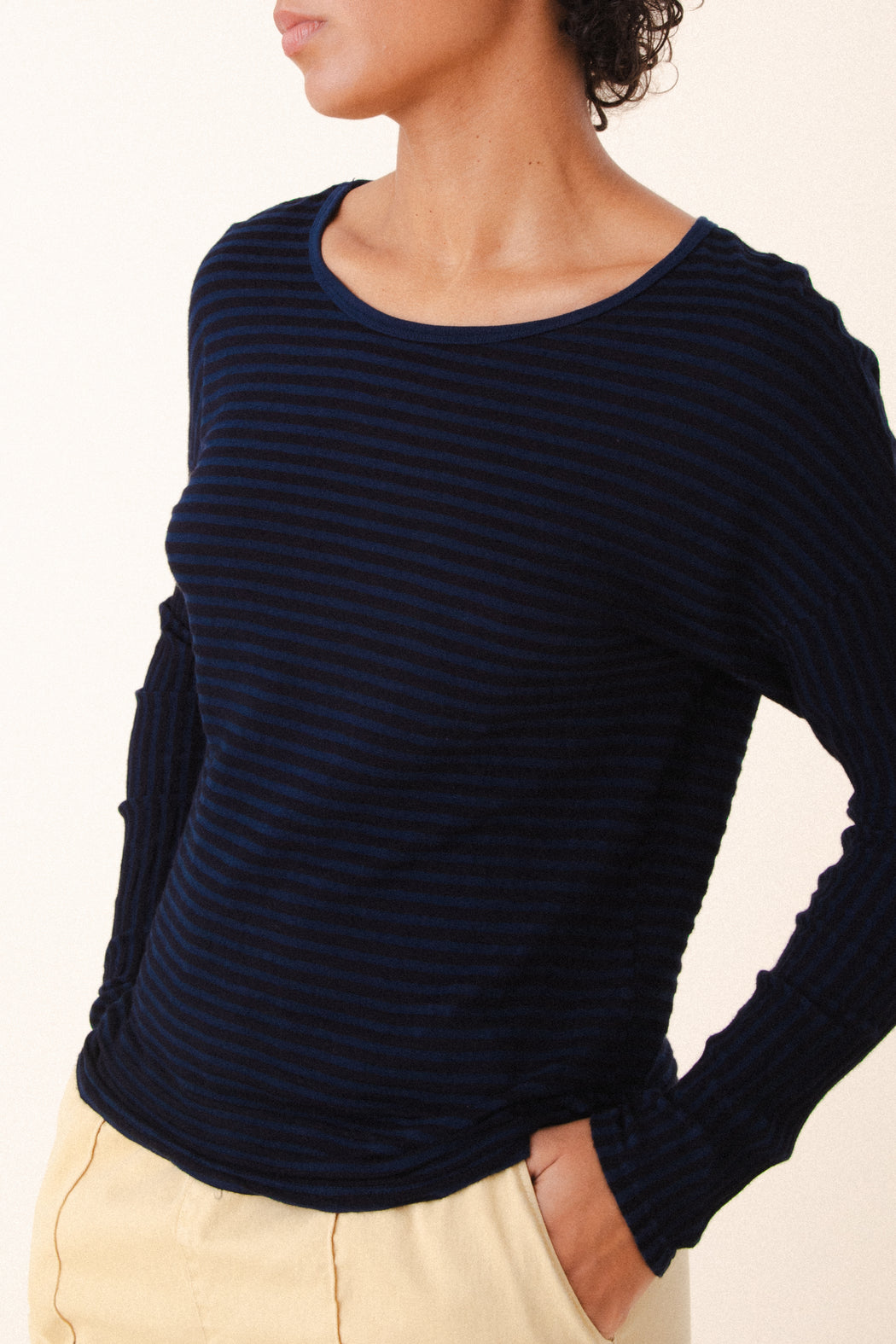 The stripes on this tee, have been cut to form an endless horizon, creating a feeling of expansiveness and motion. It is a complex cut, rigorously minimal, and with a gestural impact. Designed to be worn routinely, this clean, wide-neck tee is a layer in winter months and a perfect t-shirt for the rest of the year.