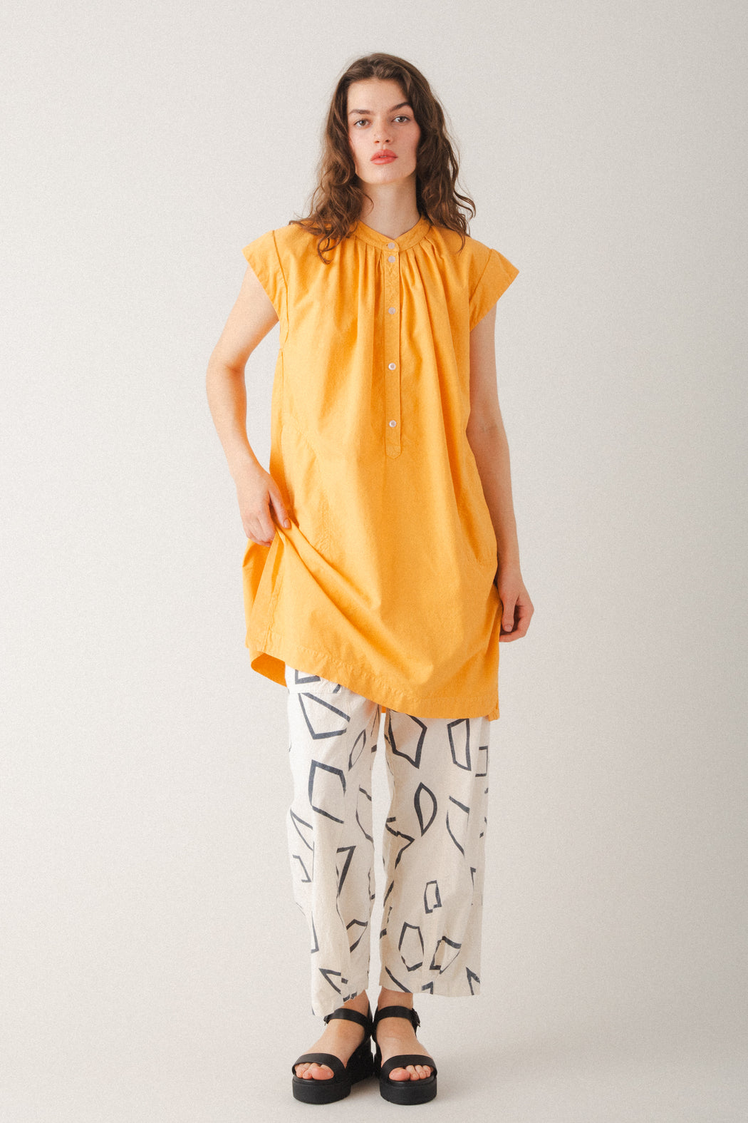 A modern shift dress with an architectural silhouette that feels as effortless as it looks. Crafted from our favorite textured organic cotton muslin, this piece gathers tiny pleats into a mandarin collar, creating a soft, poetic shape. Strong cap sleeve insets provide structure, balancing the romantic details with sharp design. Side slits and large side-seam pockets add ease and functionality, while the front button placket offers versatile styling—wear it open for layering, or buttoned up for a doll-like effect. Available in playful prints and bold colors to suit your mood. Pair with the Gathering Pant for a complete, standout look.