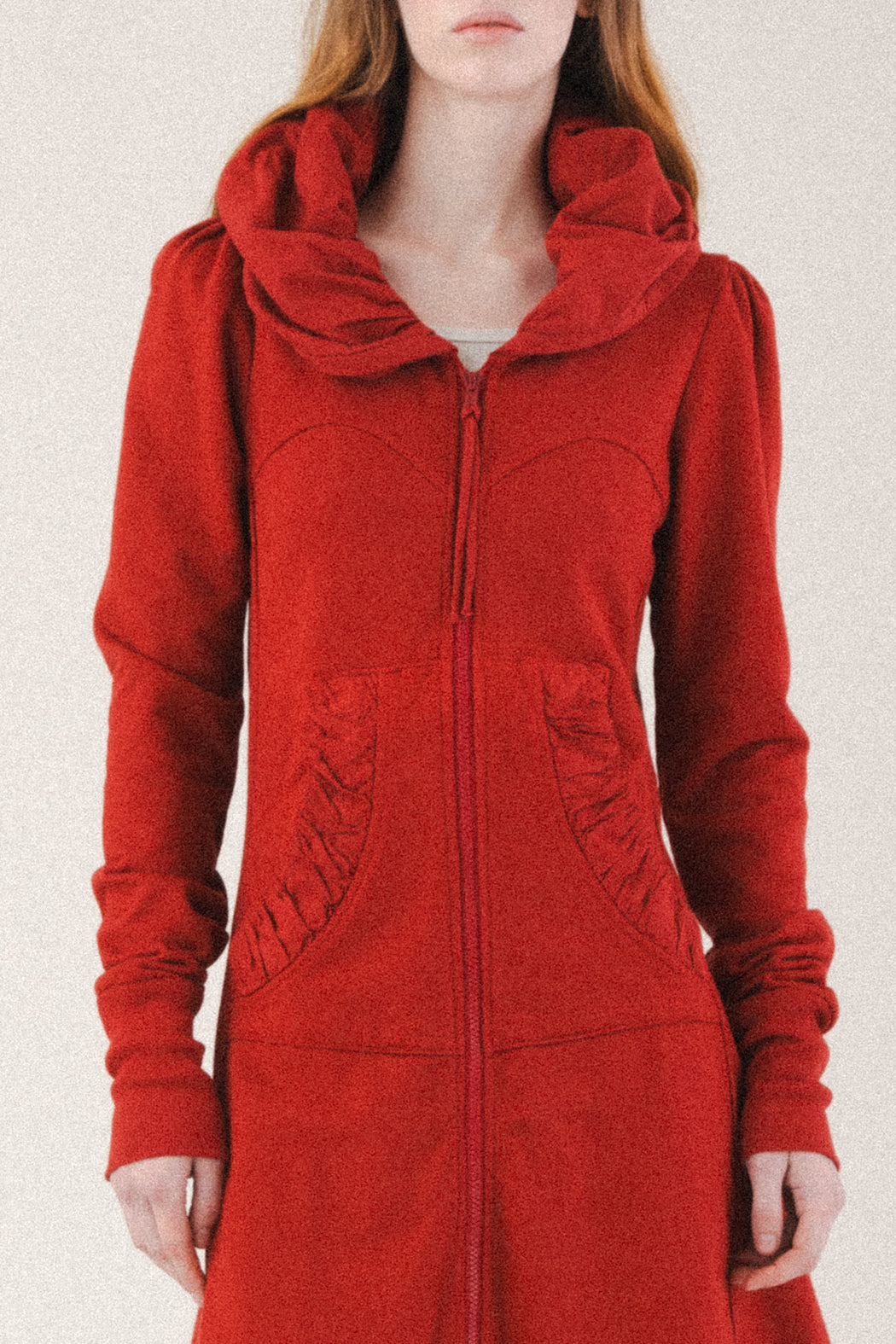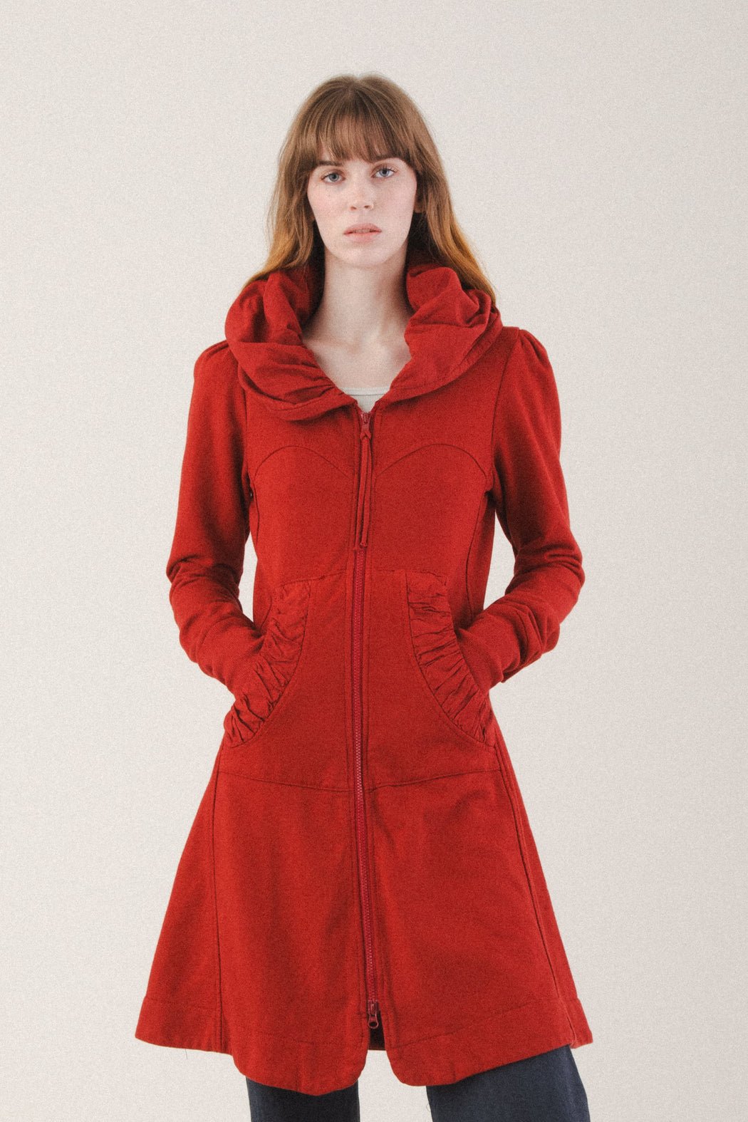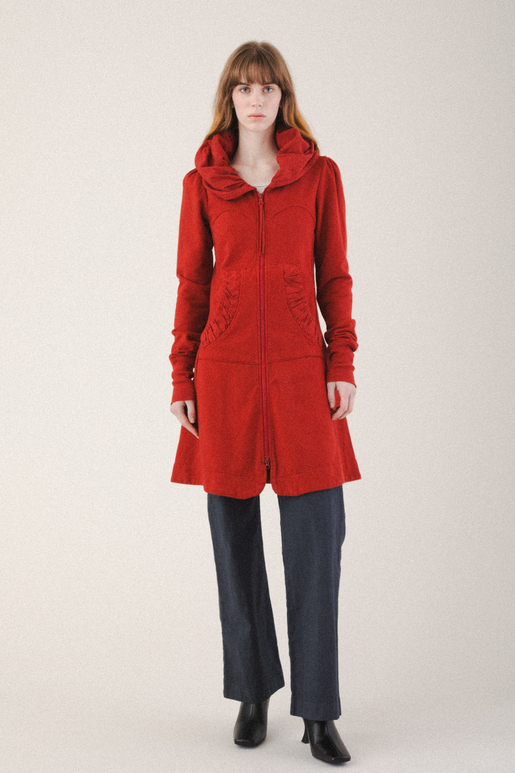 A Prairie Underground classic first introduced in 2006 and one of our longest-running styles. Dramatic fit and flare shaping with seamless sides and back belt inset. Ultra femme design lines and pockets embellished with gathered muslin insets are balanced by extra-long sleeves that can be gathered along the arm, or worn over the hand in cooler climes. When unzipped the hood may be draped over the shoulder.