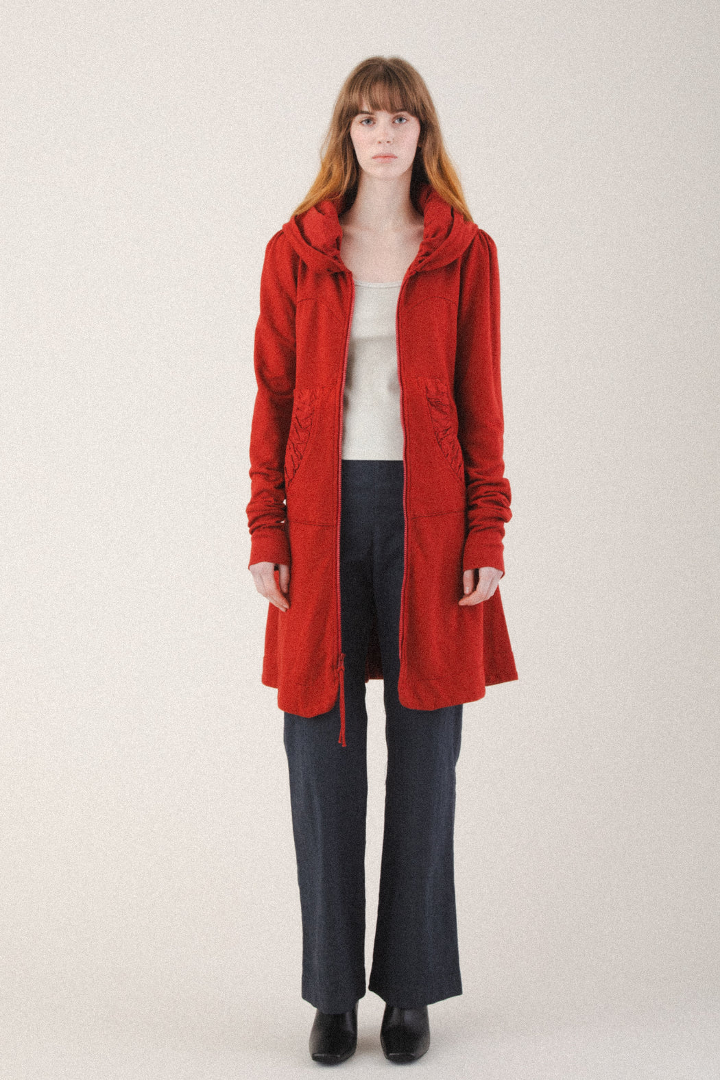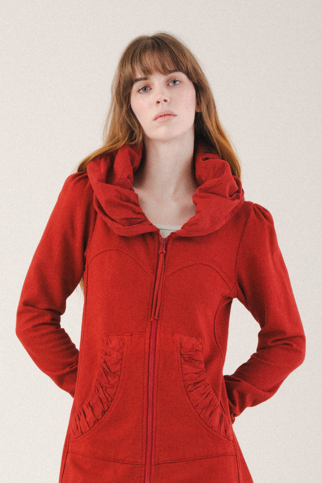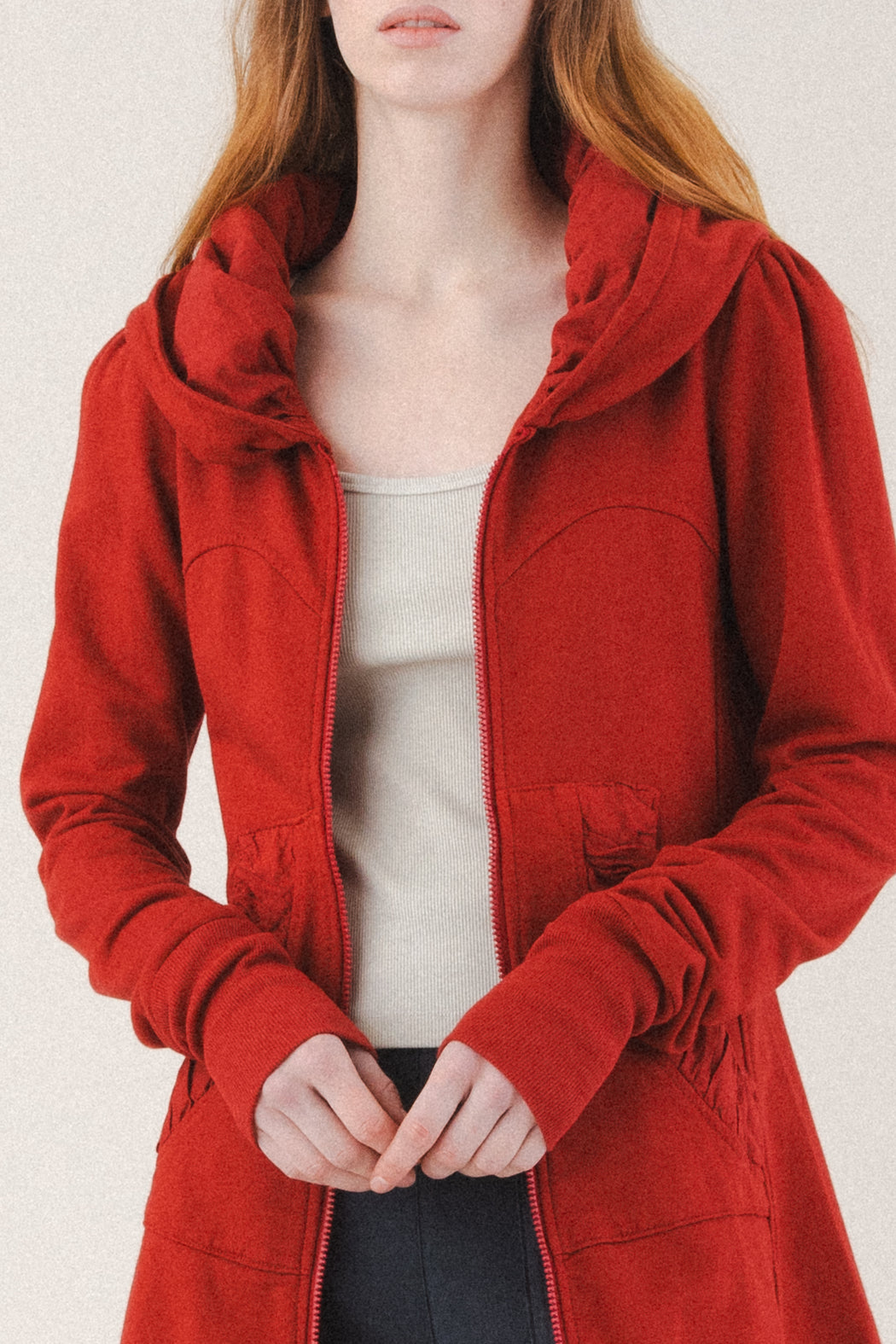 A Prairie Underground classic first introduced in 2006 and one of our longest-running styles. Dramatic fit and flare shaping with seamless sides and back belt inset. Ultra femme design lines and pockets embellished with gathered muslin insets are balanced by extra-long sleeves that can be gathered along the arm, or worn over the hand in cooler climes. When unzipped the hood may be draped over the shoulder.