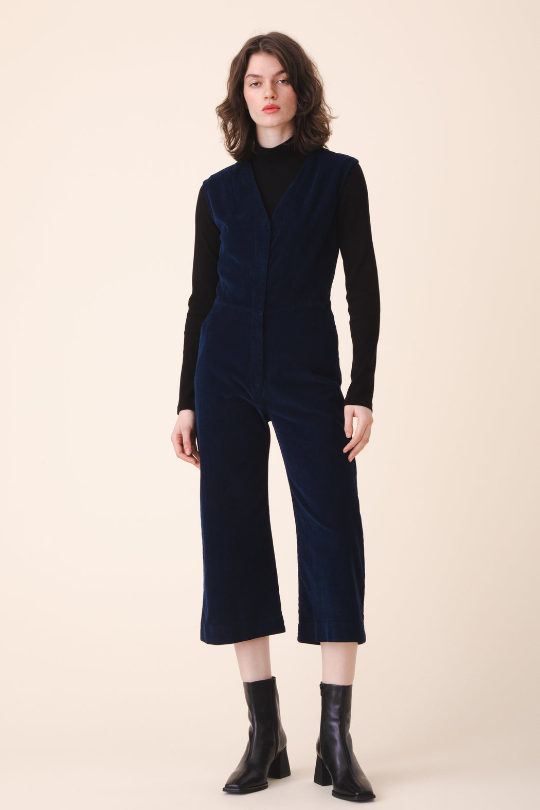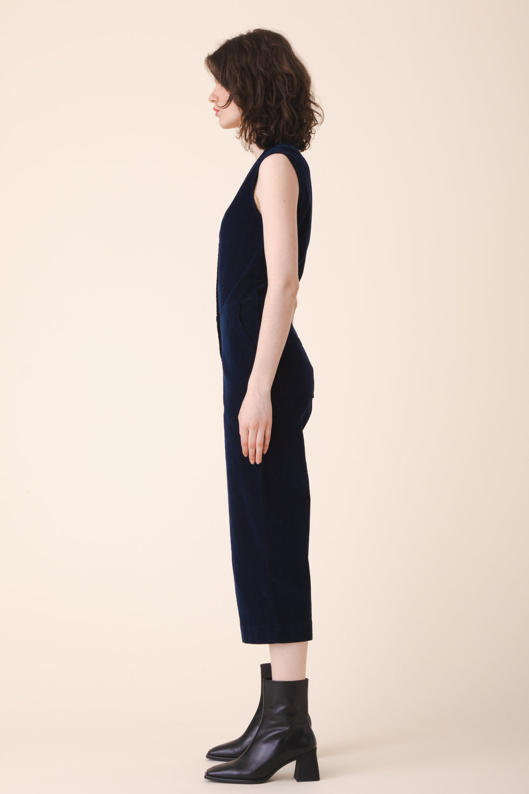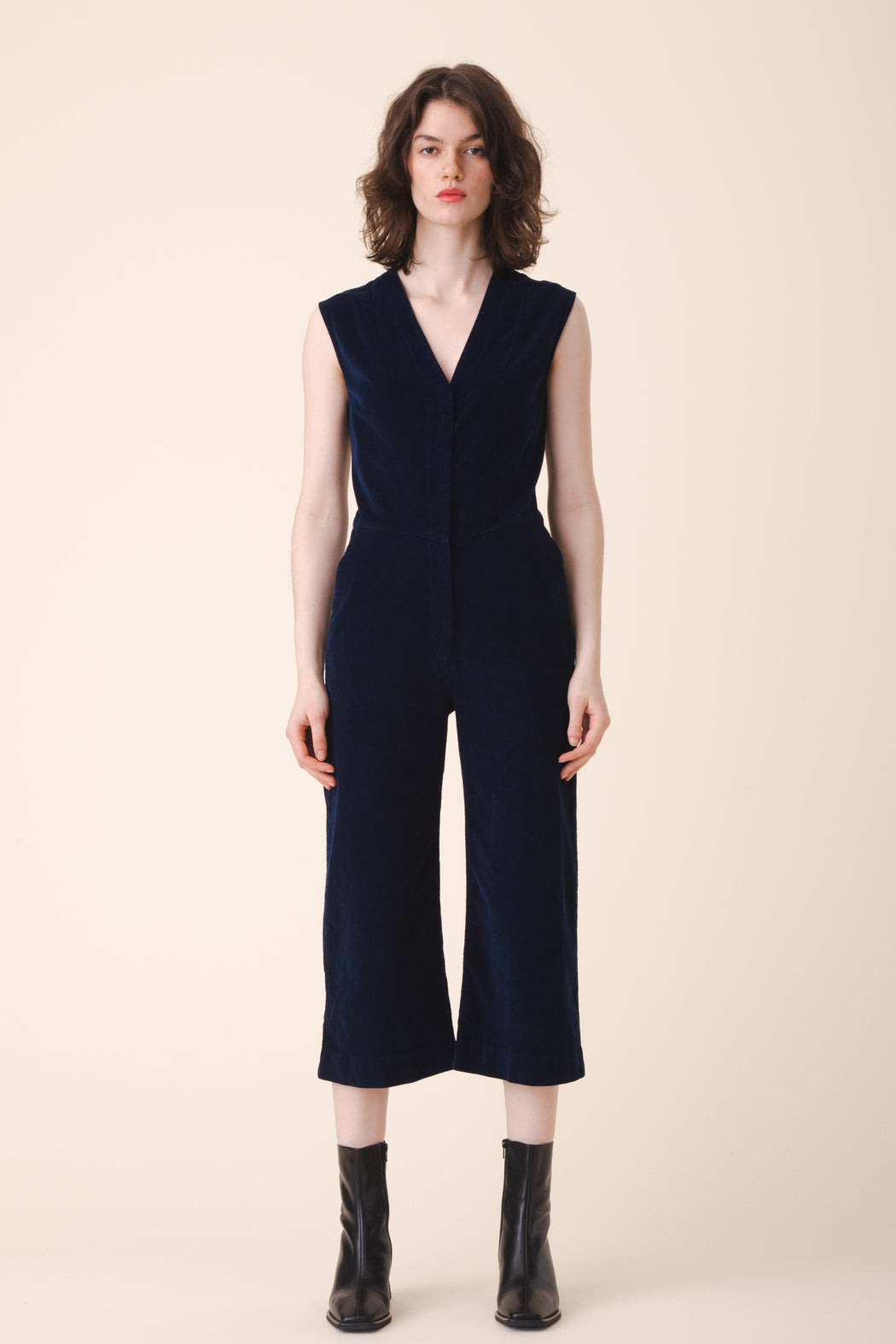 A minimal culotte coverall for fall has been rendered in our plush stretch corduroy. This elastic lady is fitted, industrious, and flexible. The angled waist seam, dual trouser pockets, and darted v-neckline have created an alluring and practical jumpsuit that everyone wants to get to know. It sells out every time, don’t wait.