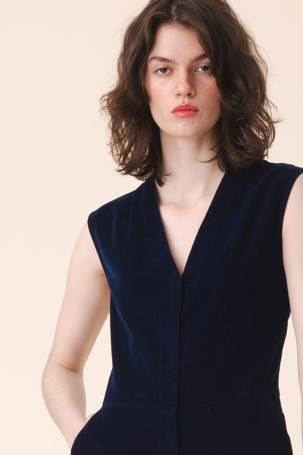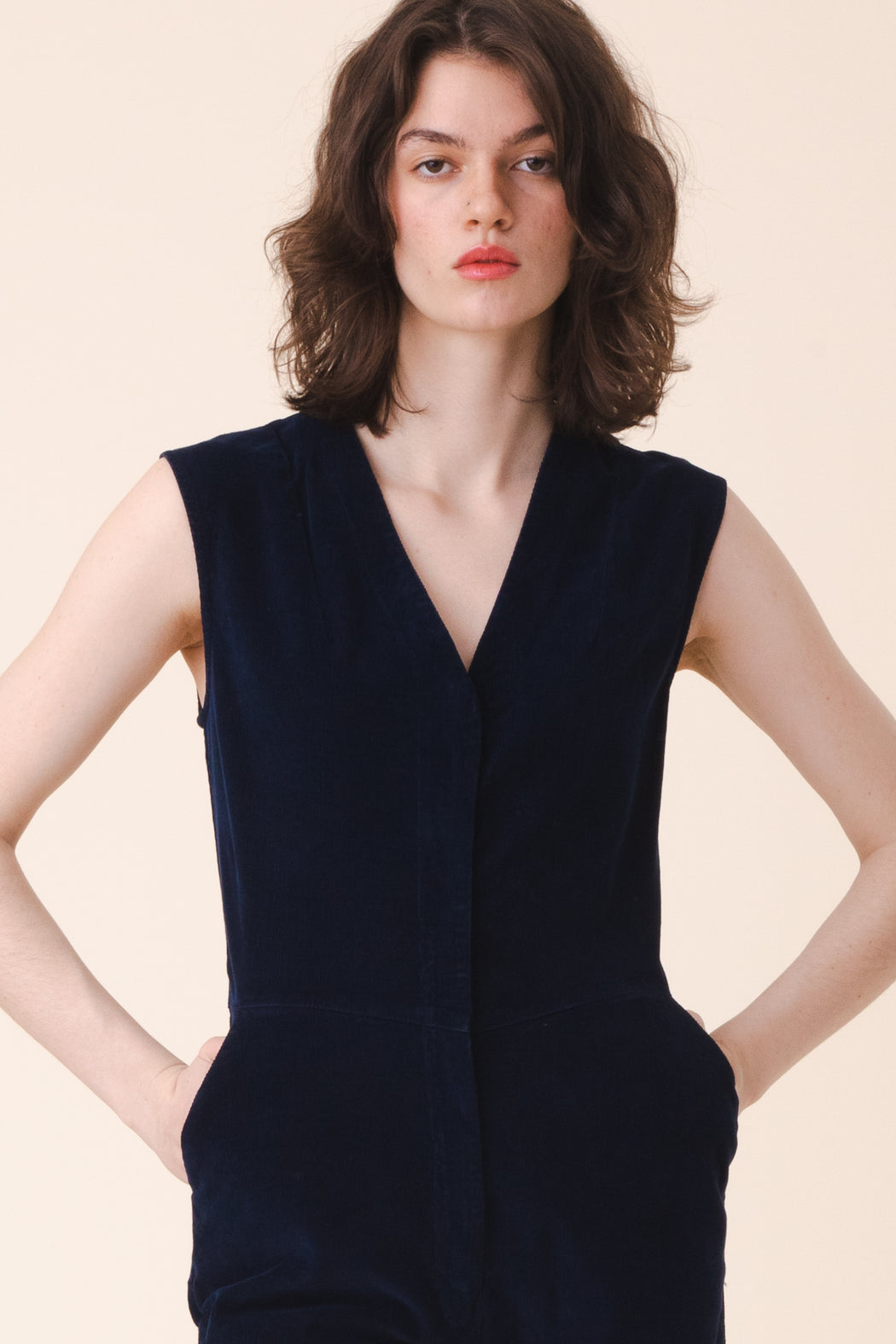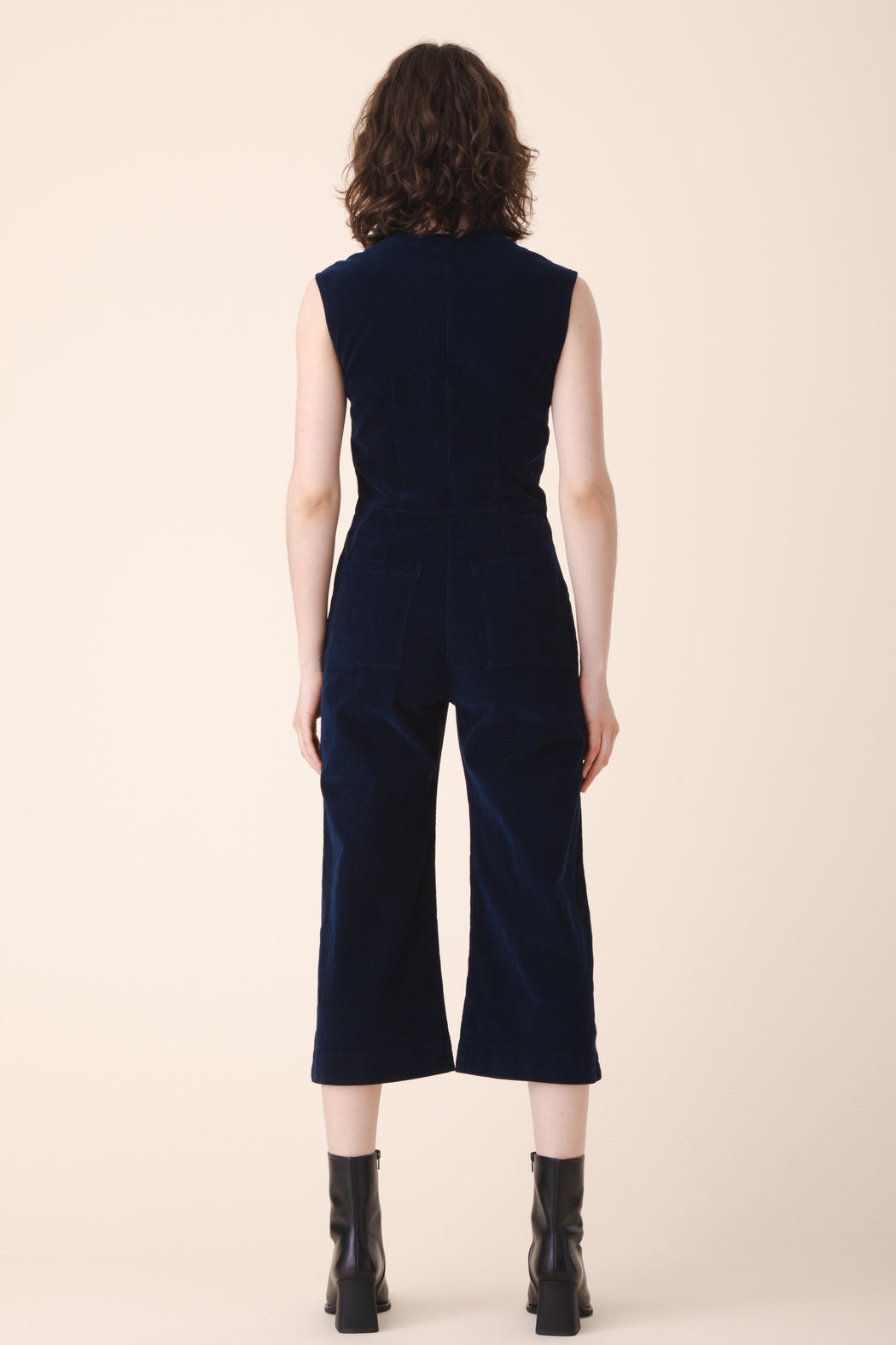 A minimal culotte coverall for fall has been rendered in our plush stretch corduroy. This elastic lady is fitted, industrious, and flexible. The angled waist seam, dual trouser pockets, and darted v-neckline have created an alluring and practical jumpsuit that everyone wants to get to know. It sells out every time, don’t wait.