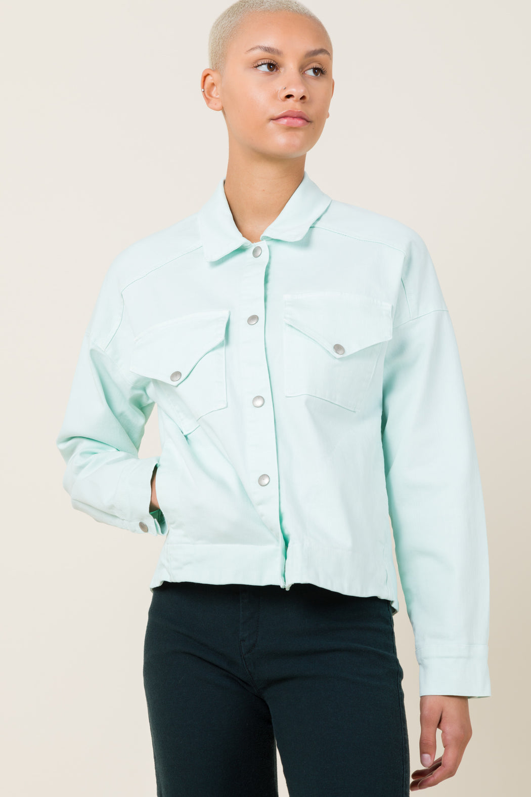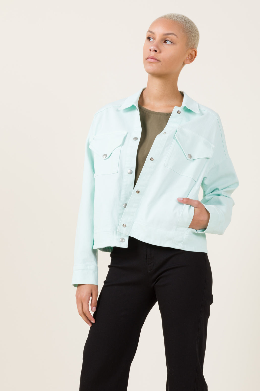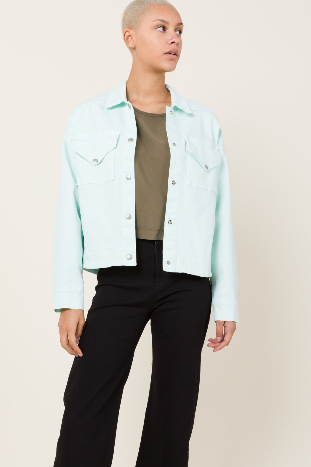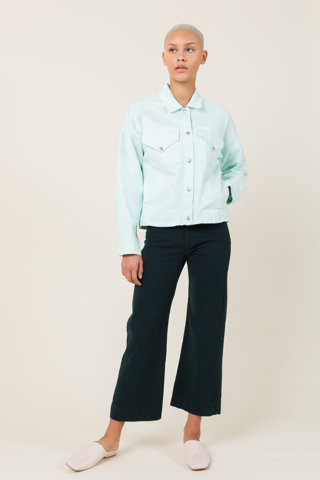 The perfect 60’s vintage denim jacket interpreted with contemporary proportions. Angular styling from the shoulder to the hemline is repeated in the collar and pocket flaps. The oversized body proportions are balanced by narrow long sleeves. Composed in limited quantities from a variety of sustainable twills in our inventory.