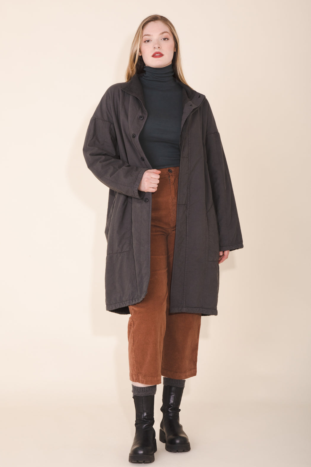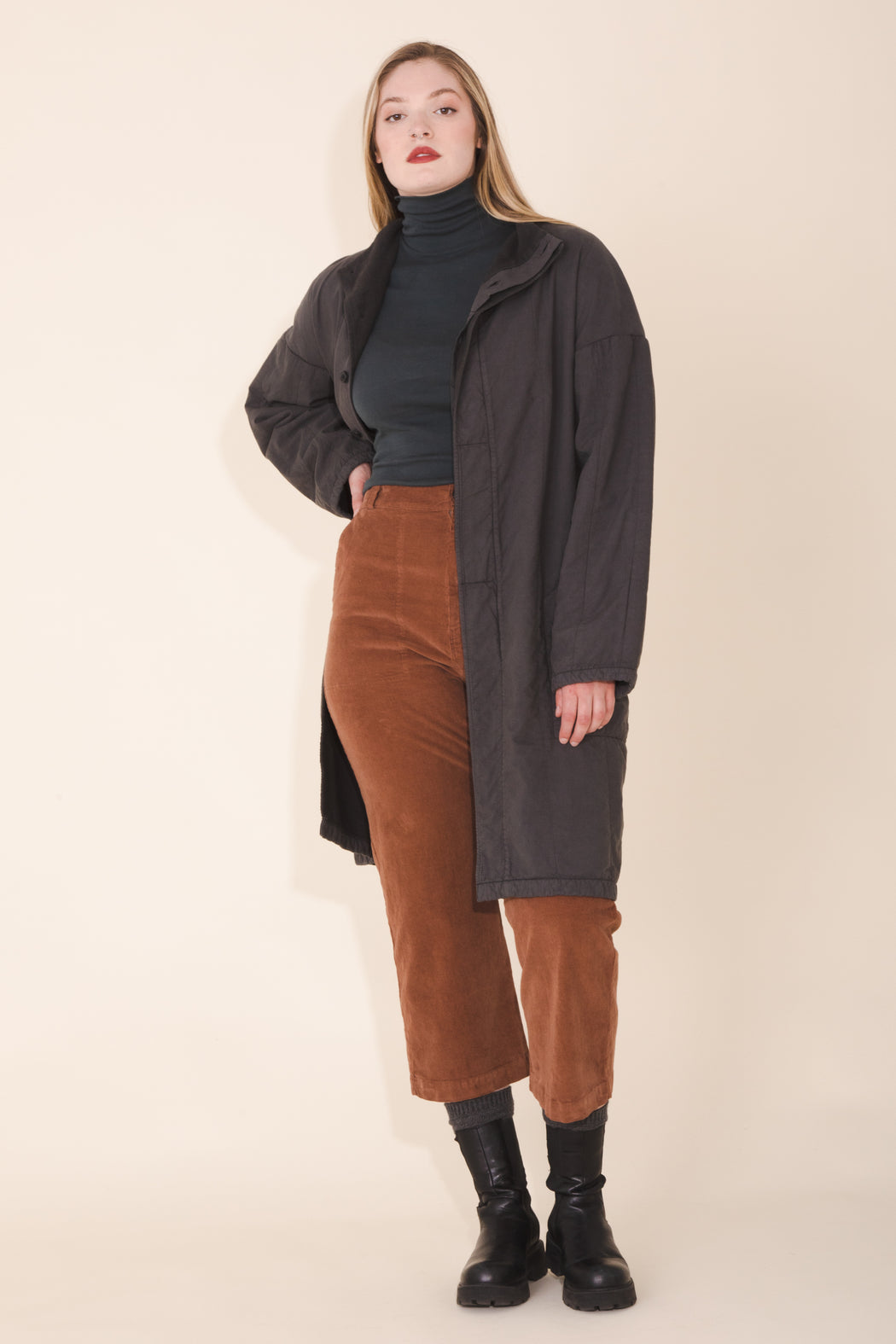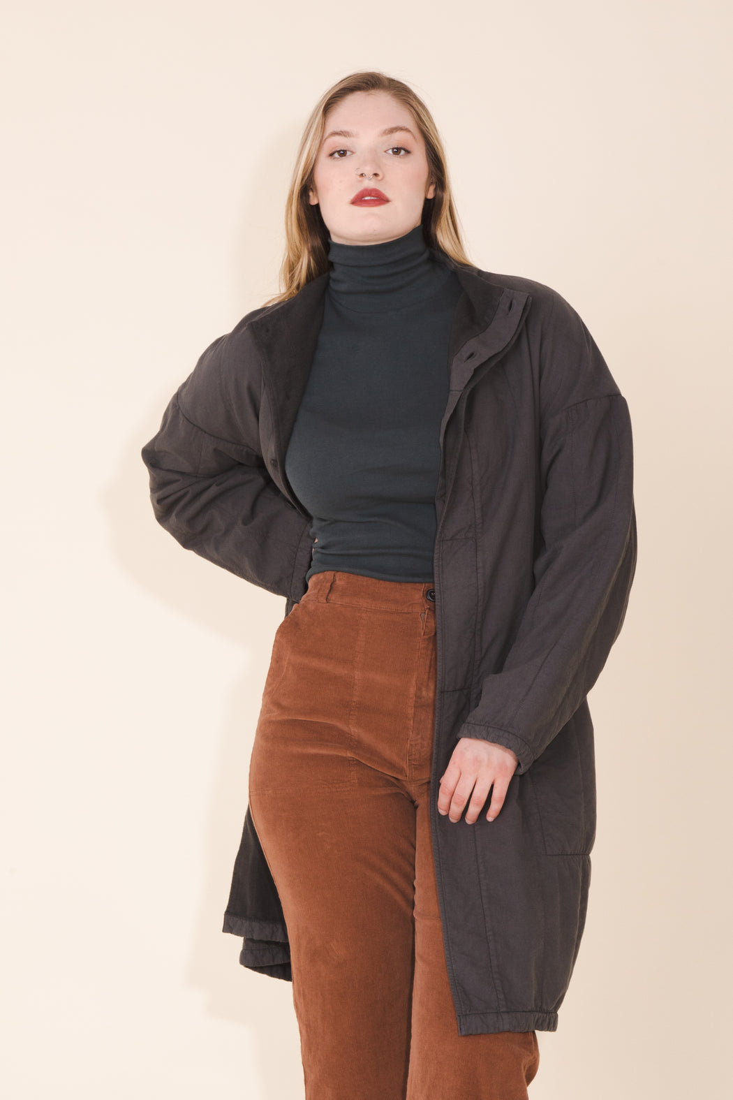 Our newest iteration of the Bedroll Coat features vertical quilt channels and an abbreviated funnel neckline. Refined detailing including a hidden button placket and a fleece lining, make this coat a wonderful packable addition to any wardrobe. Great for layering or as a stand-alone, outer/inner wear garment.