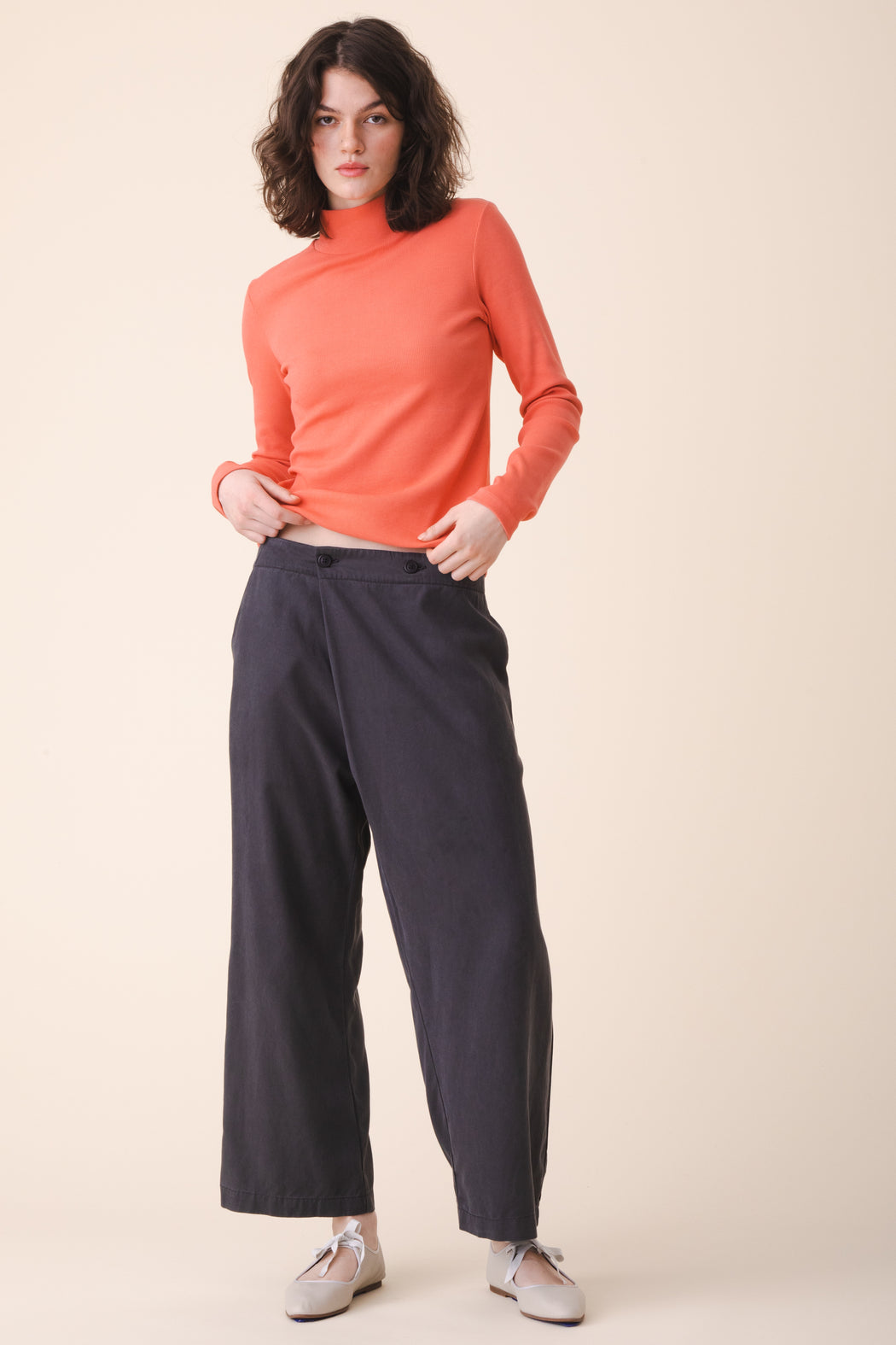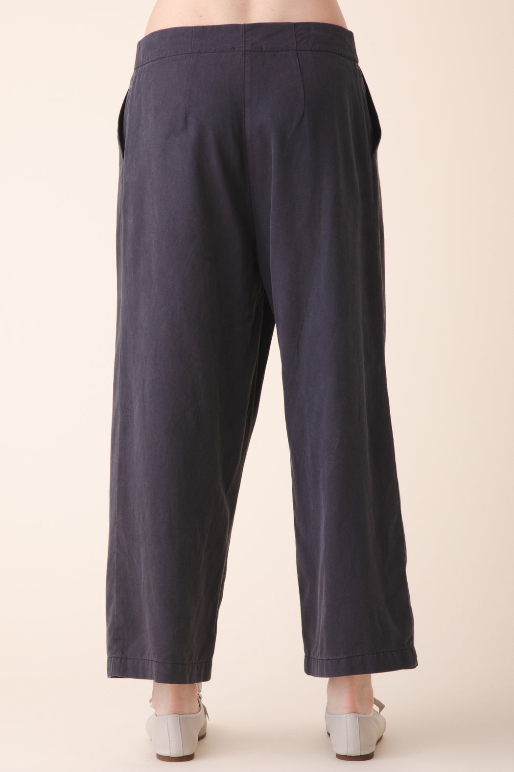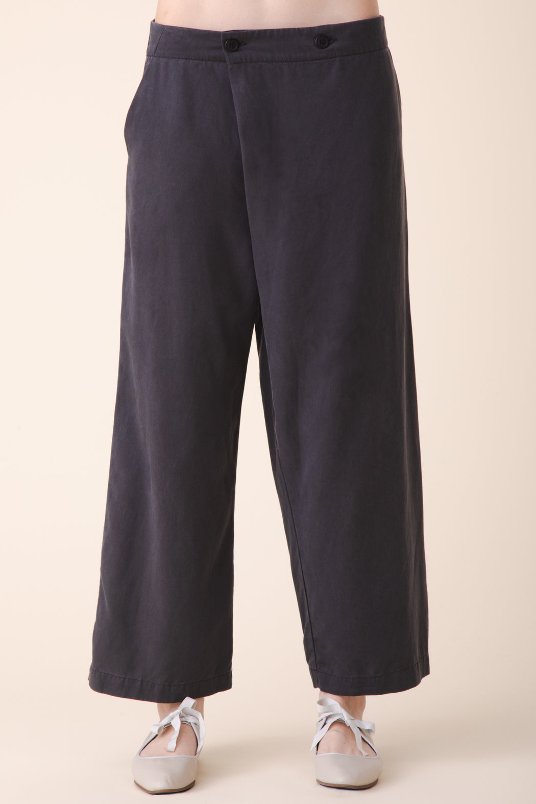 Softening the pant, to appear more like a skirt while remaining rooted in utility. A crossover waist keeps the front uncomplicated, suggesting evening appropriate draping. Back waist darts define the top of the fluid, wide leg. Offered in an inseam length that will work on most with no alteration. Front slash pockets and a clean back keep them simple and efficient.
