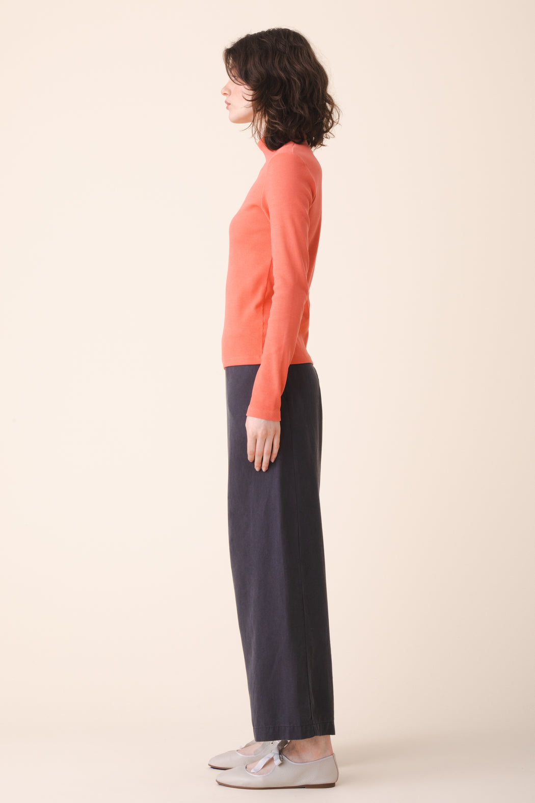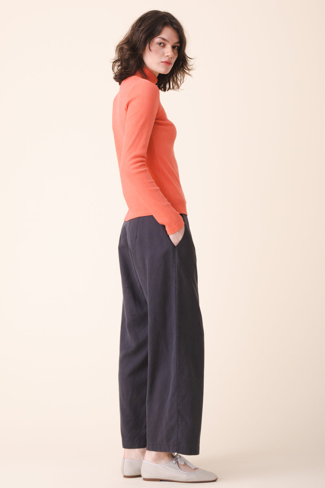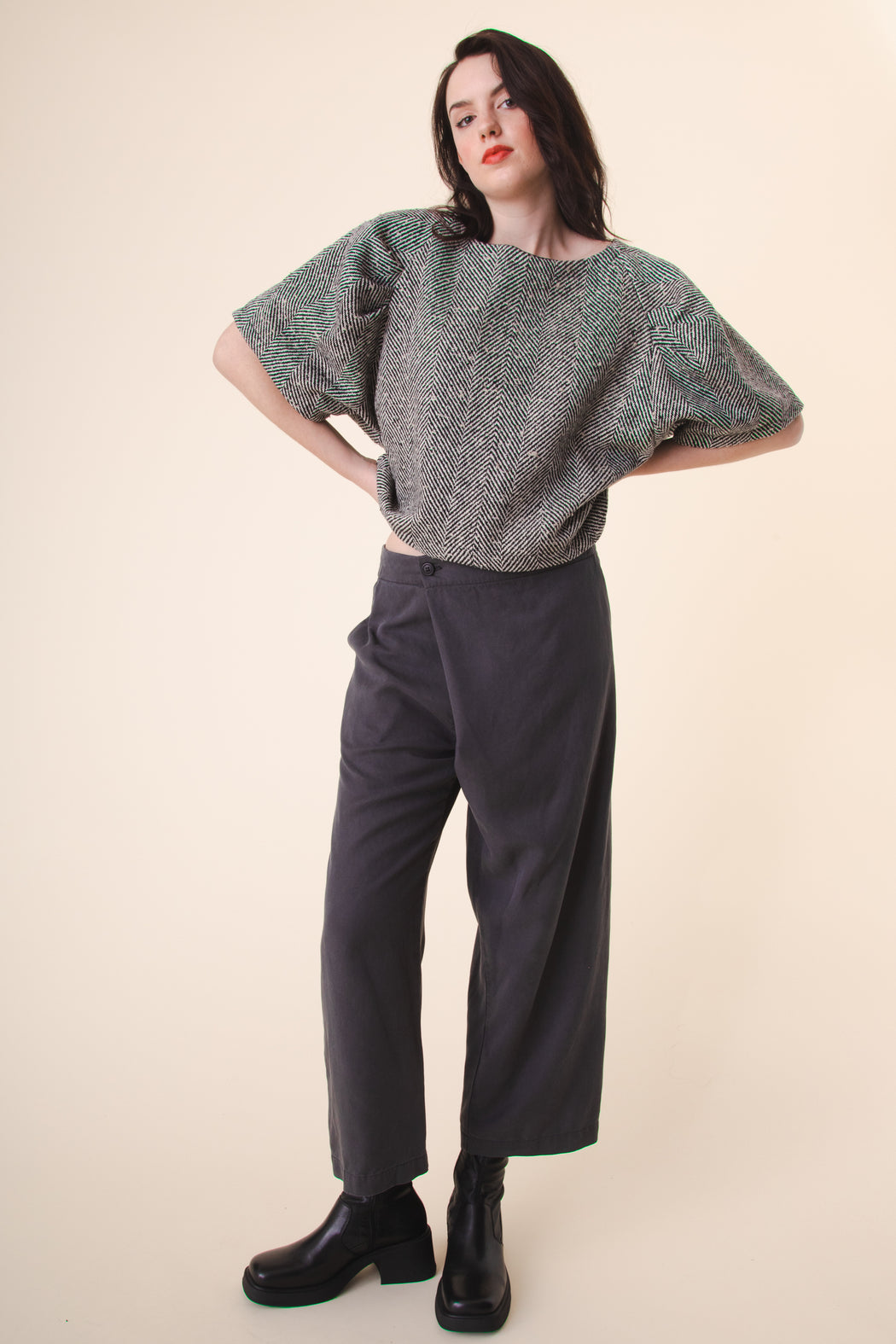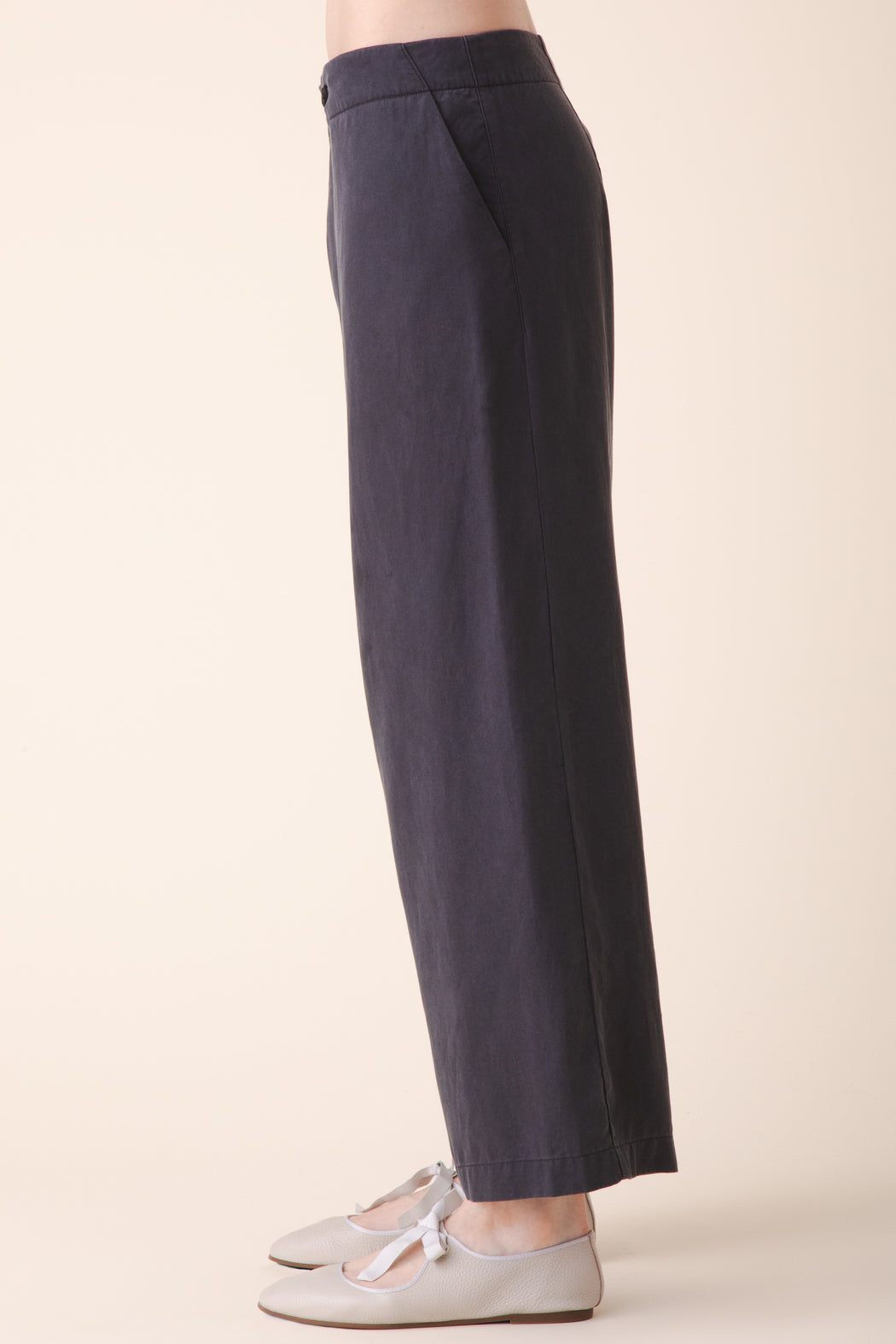 Softening the pant, to appear more like a skirt while remaining rooted in utility. A crossover waist keeps the front uncomplicated, suggesting evening appropriate draping. Back waist darts define the top of the fluid, wide leg. Offered in an inseam length that will work on most with no alteration. Front slash pockets and a clean back keep them simple and efficient.