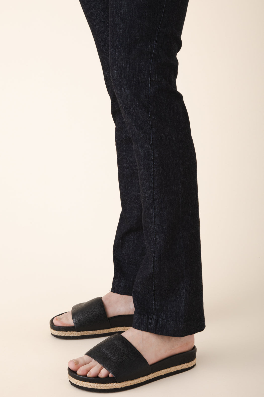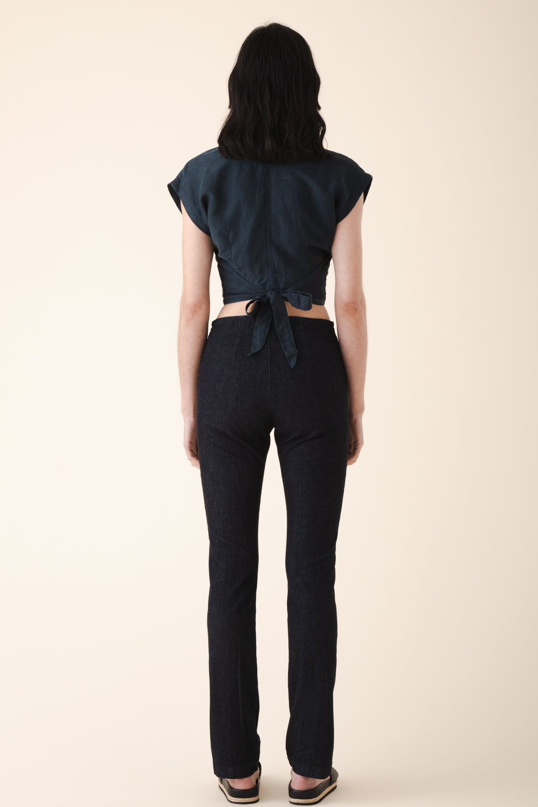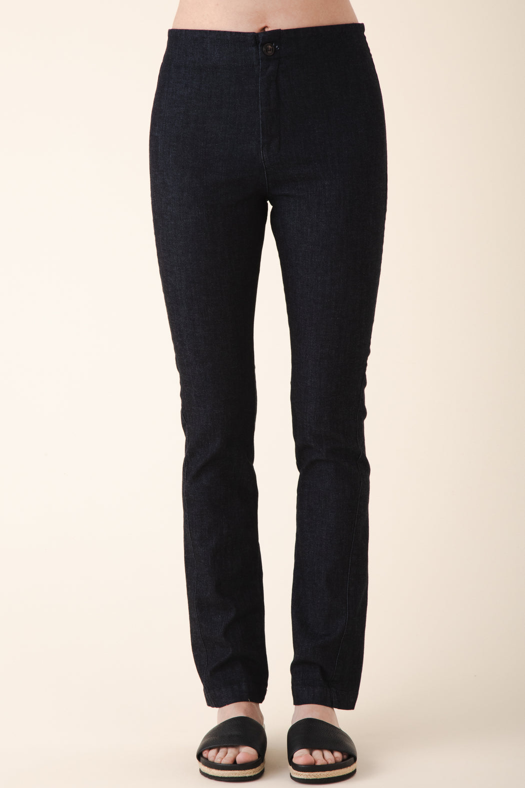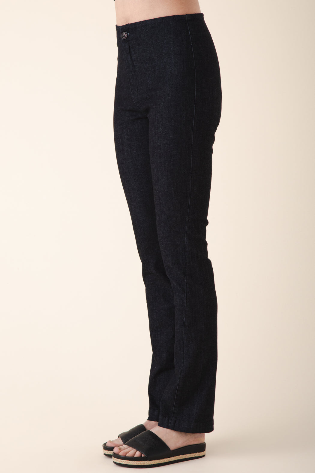 A fitted trouser with an asymmetrical side seam and a little bit of stretch. Long and lean with a straight fit from the knee down. We recommend a snug fit as the textile will give some with wear and will not shrink.